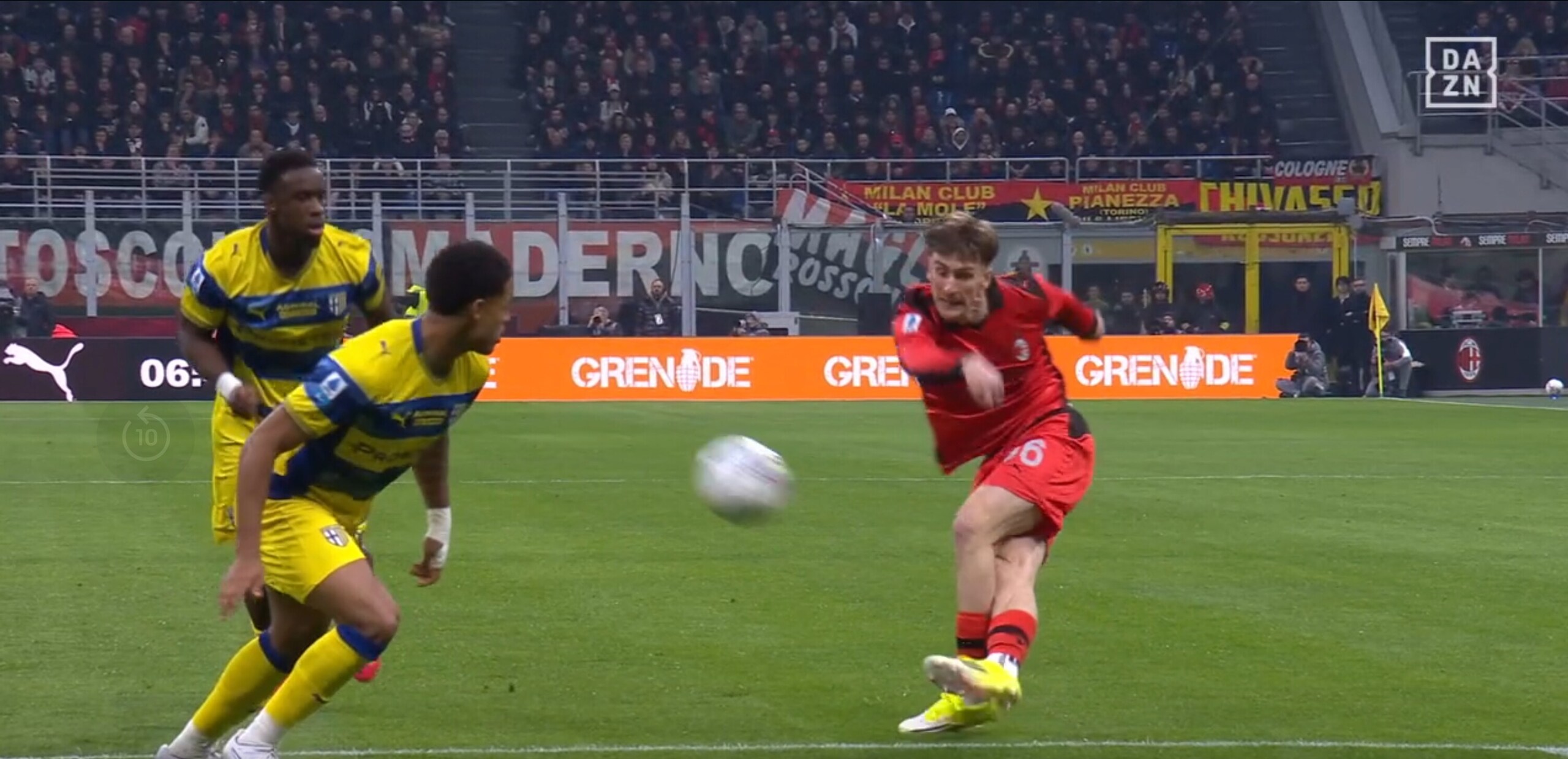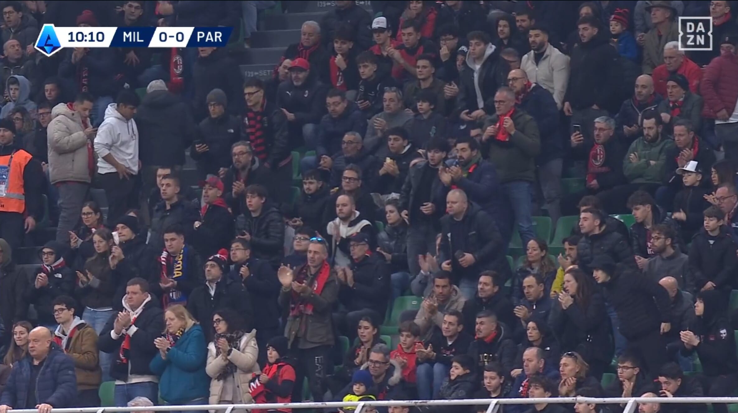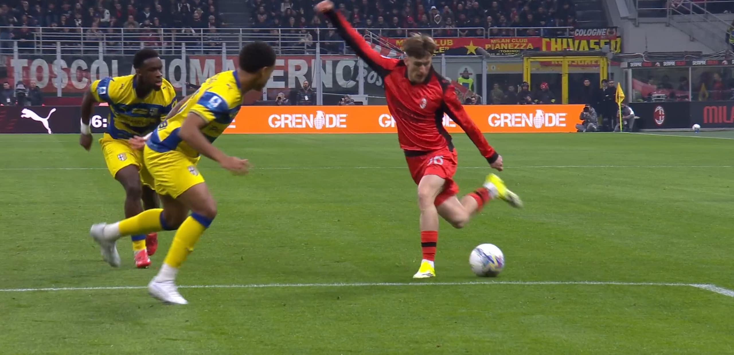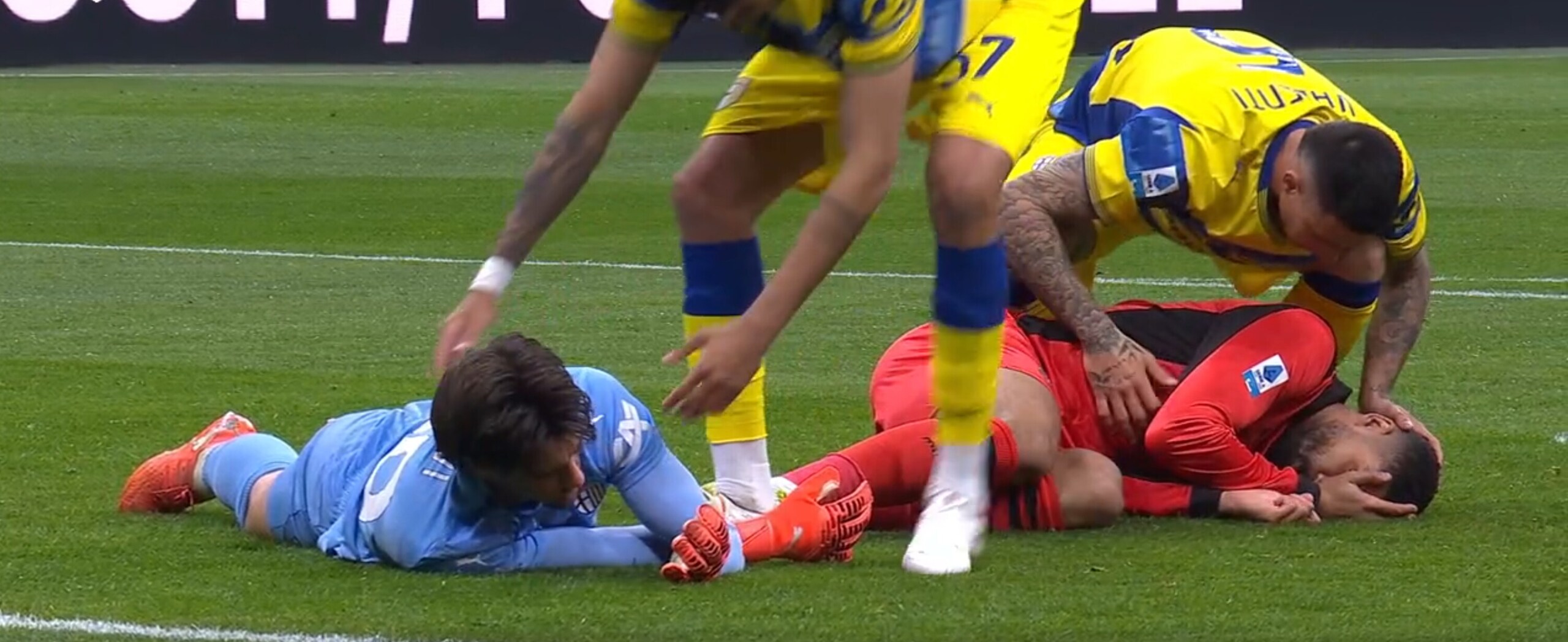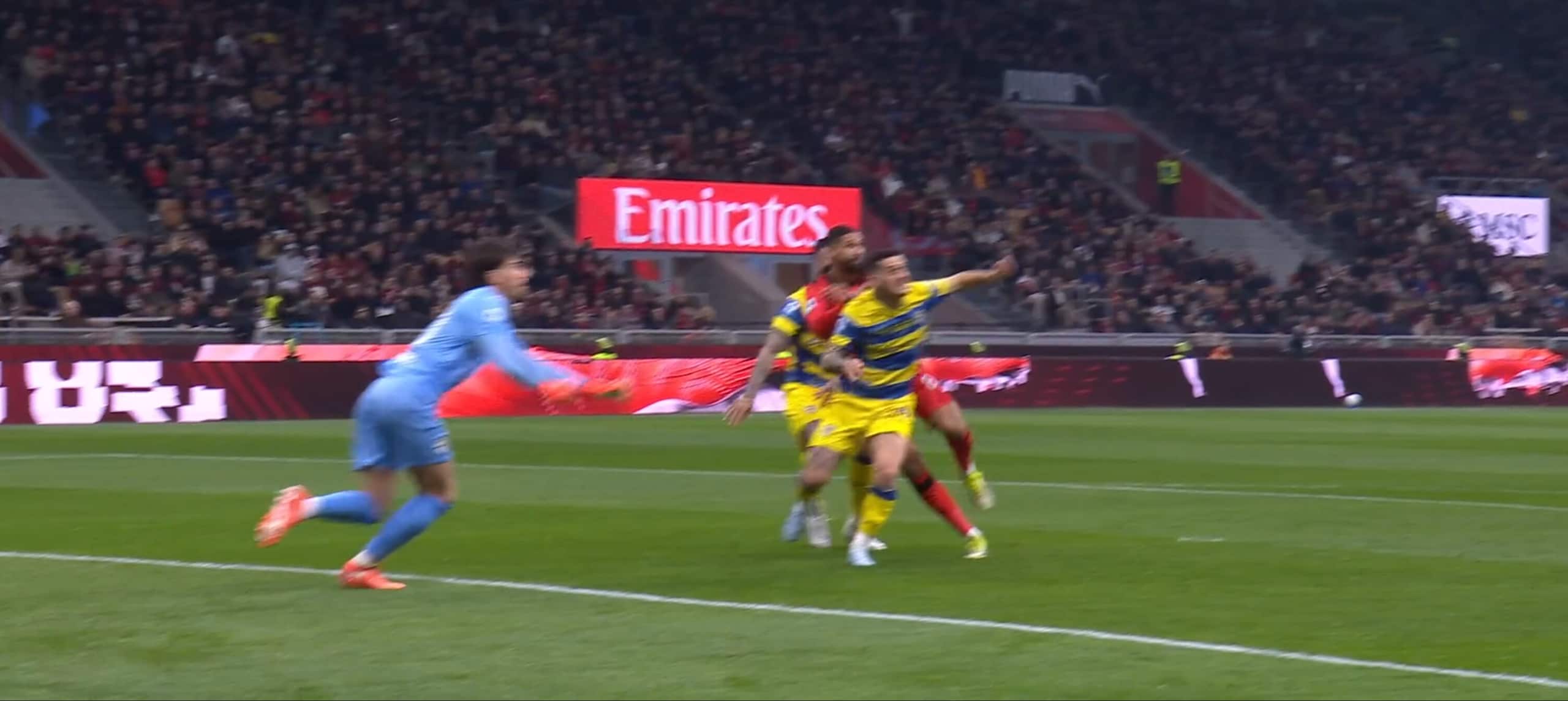 Forte scontro tra la testa del centrocampista del Milan e quella del portiere del Parma in uscita: ha la peggio l'inglese che resta a terra stordito prima di lasciare il campo in barella tra gli applausi del pubblico