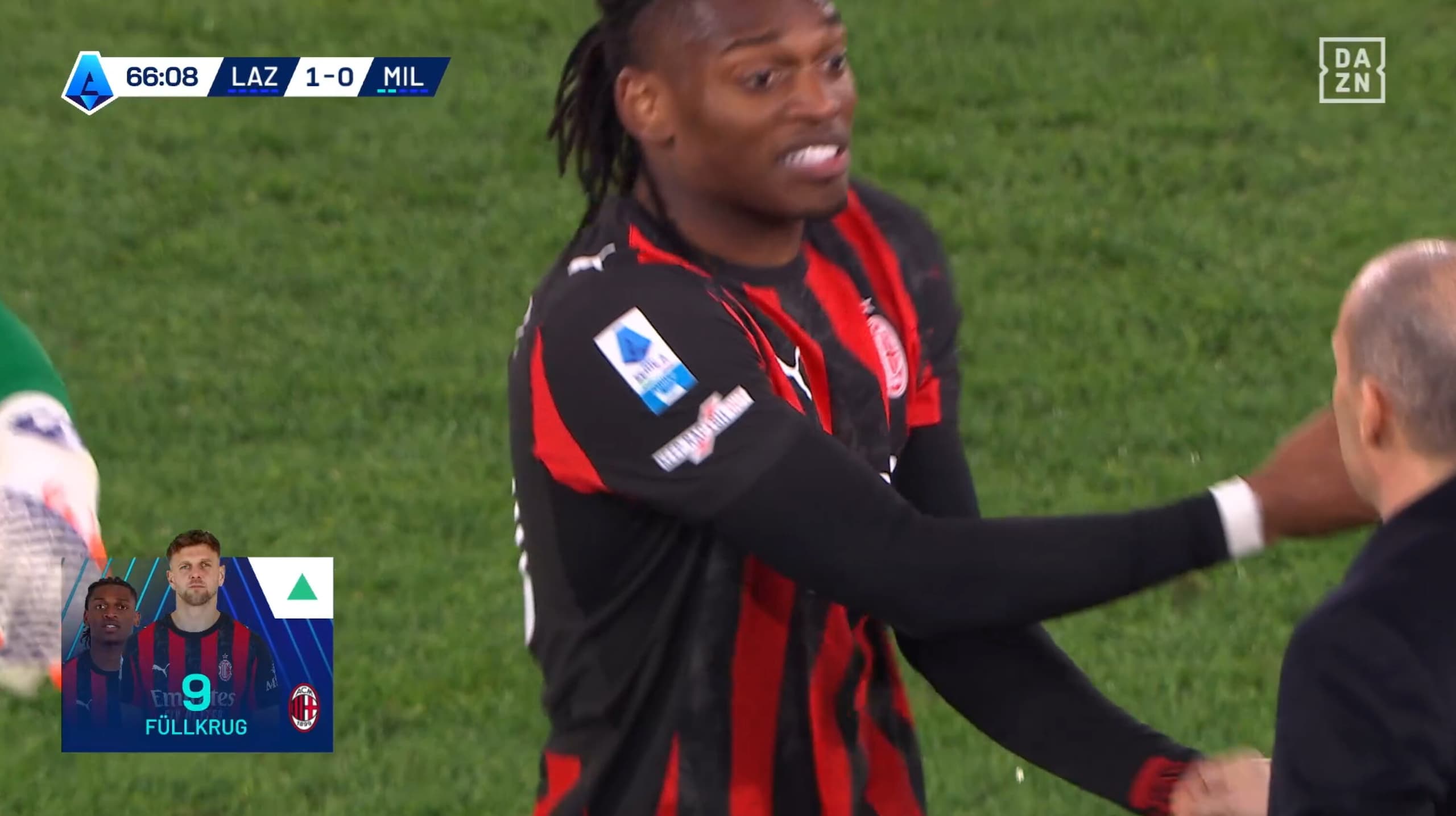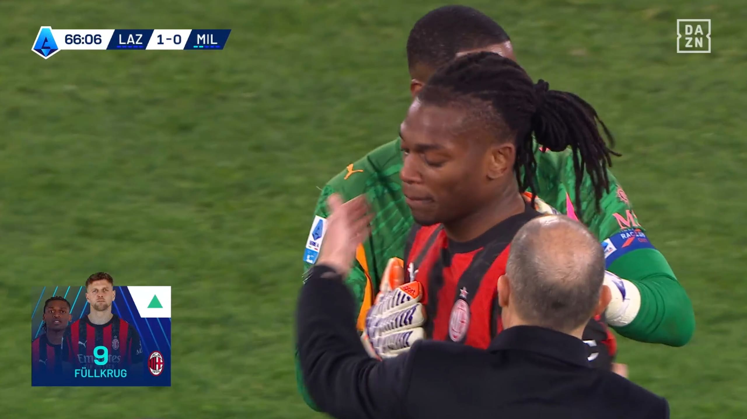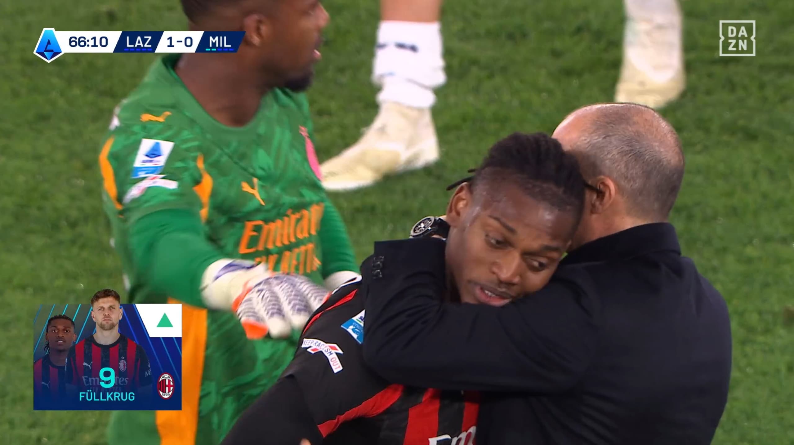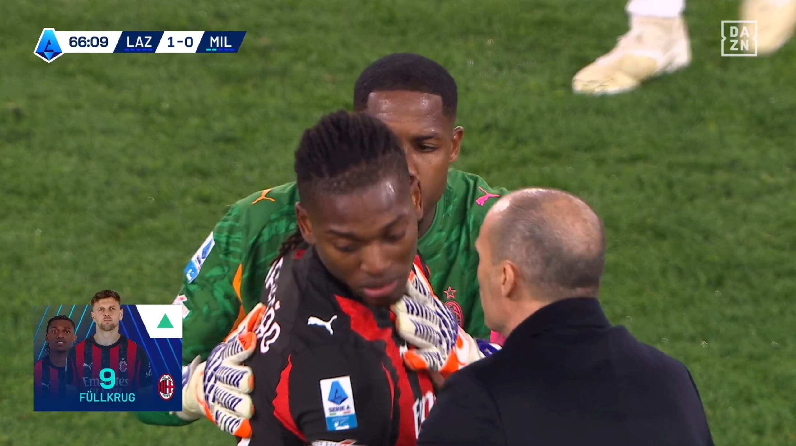 Leao stizzito dopo il cambio: Allegri e Maignan provano a calmarlo