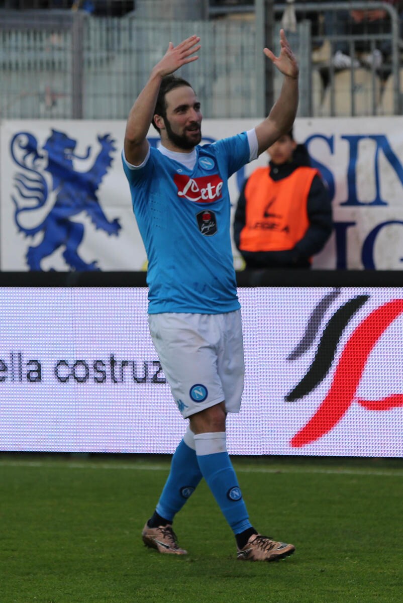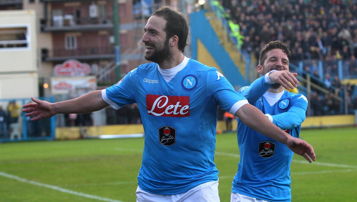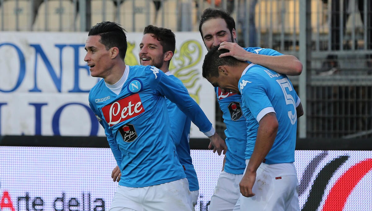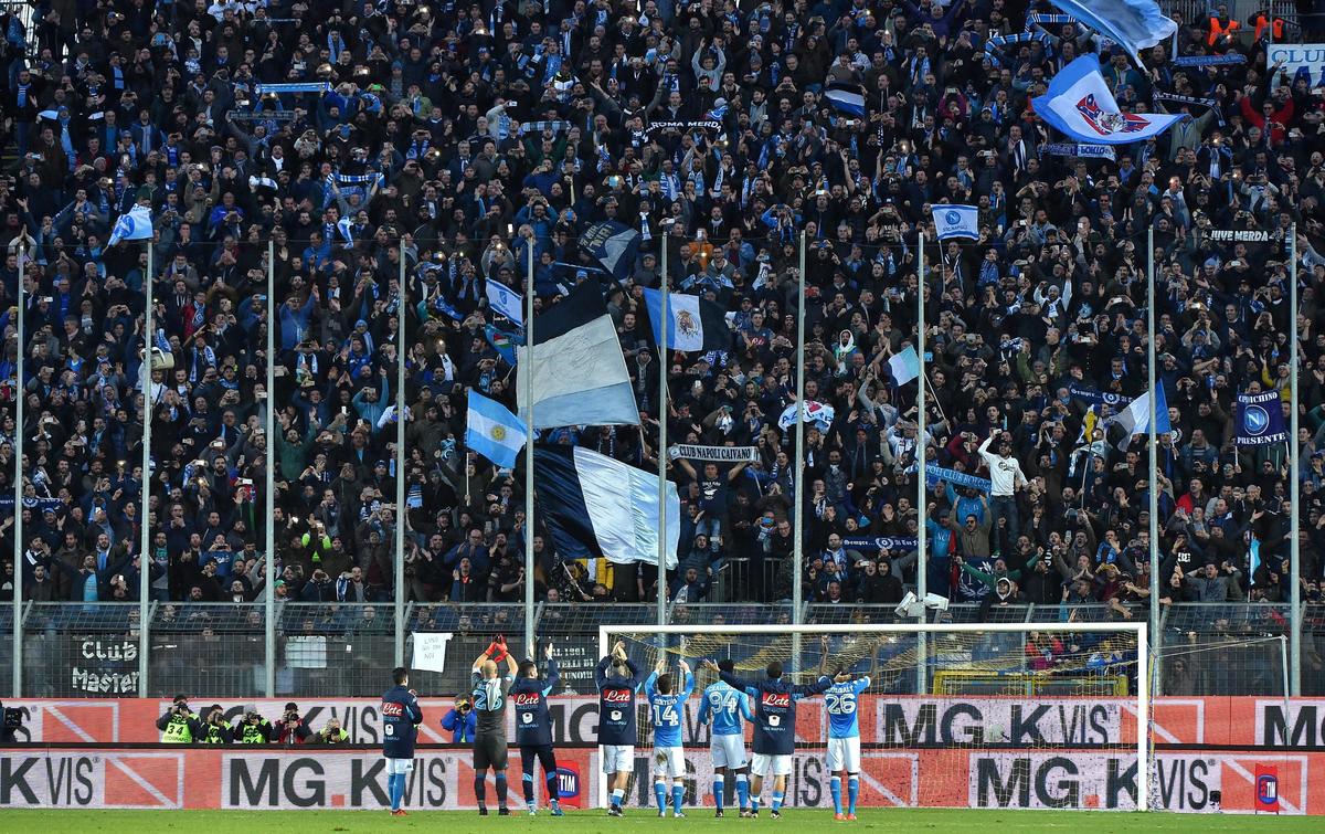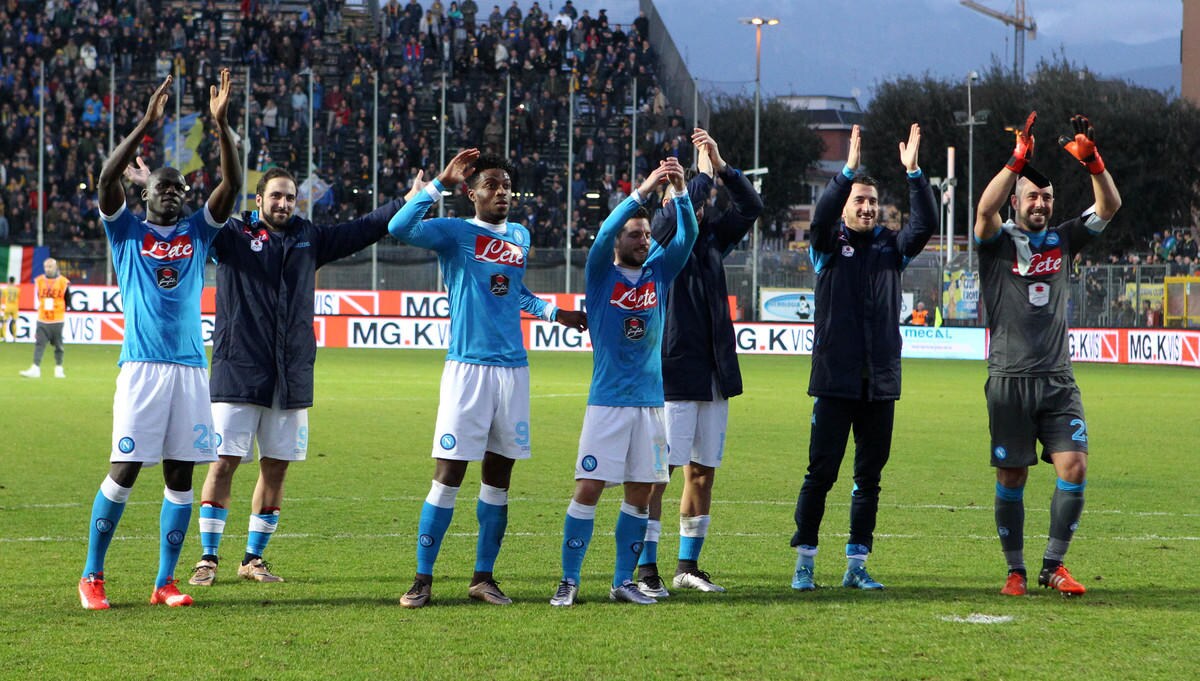 Higuain e compagni pazzi di gioia festeggiano davanti ai tifosi azzurri la vittoria contro il Frosinone e il titolo d'inverno
