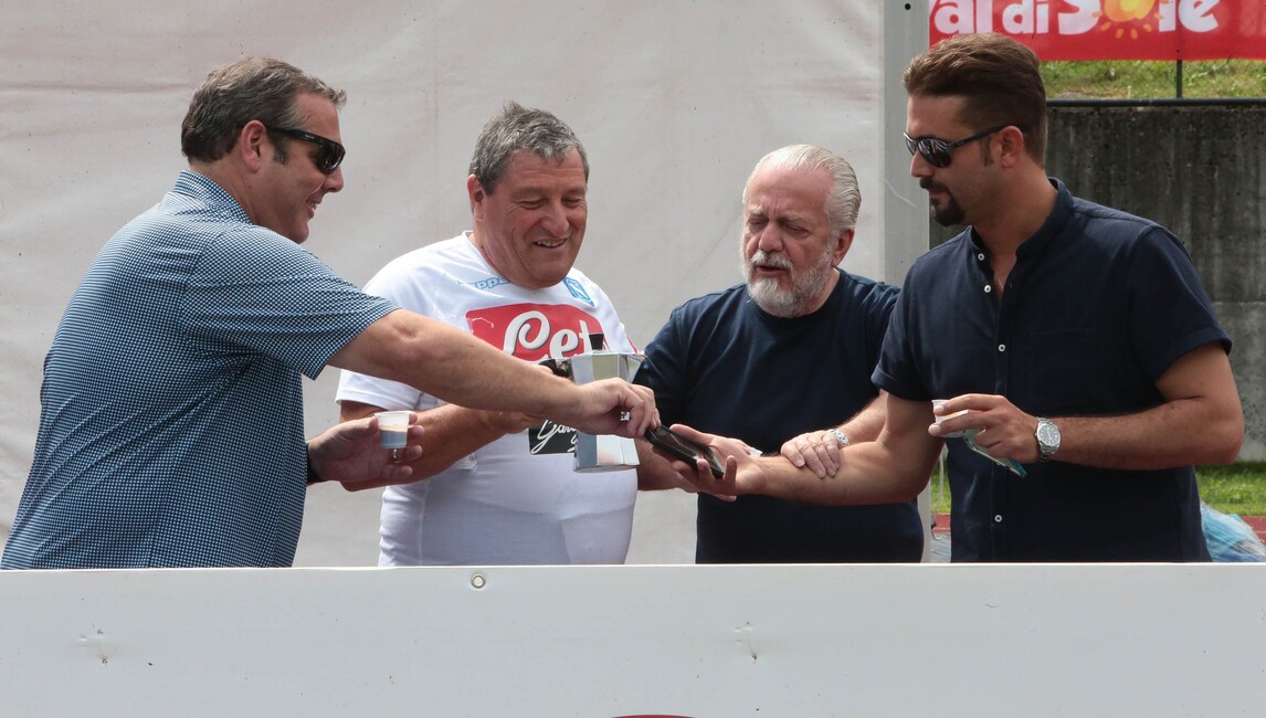 Nel giorno di Higuain alla Juve, il patron azzurro scende in campo a Dimaro, saluta i tifosi e sorseggia un caffè. Annunci in vista?