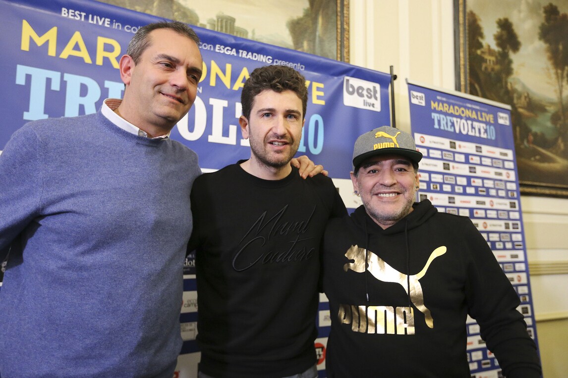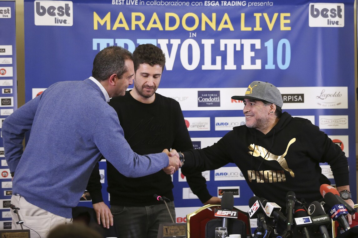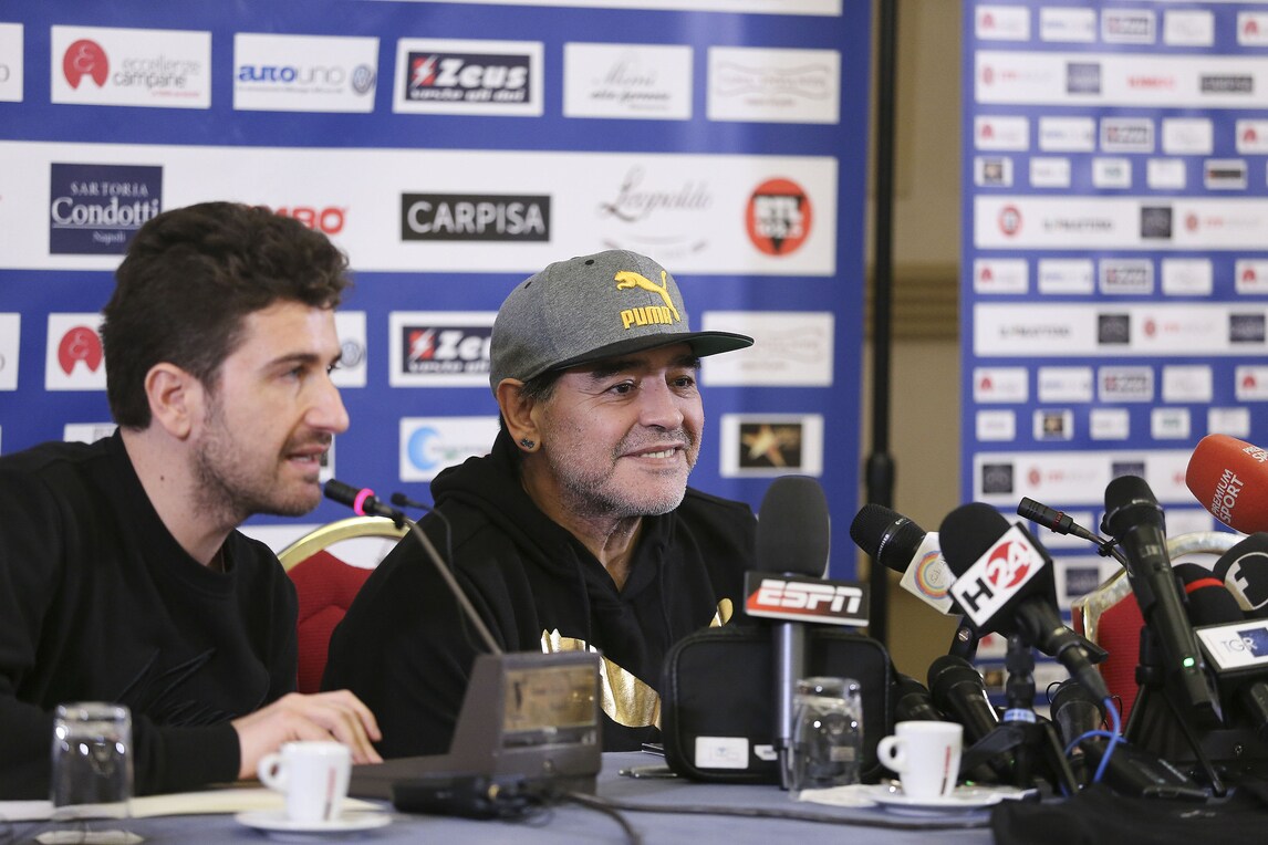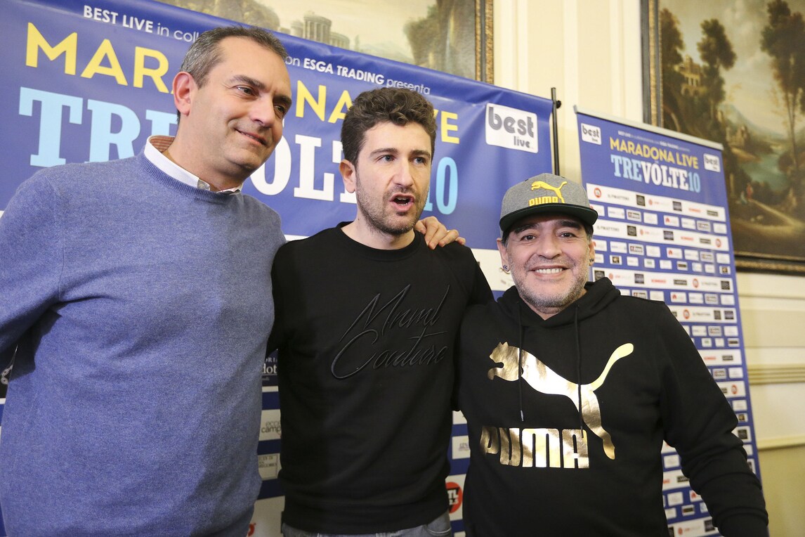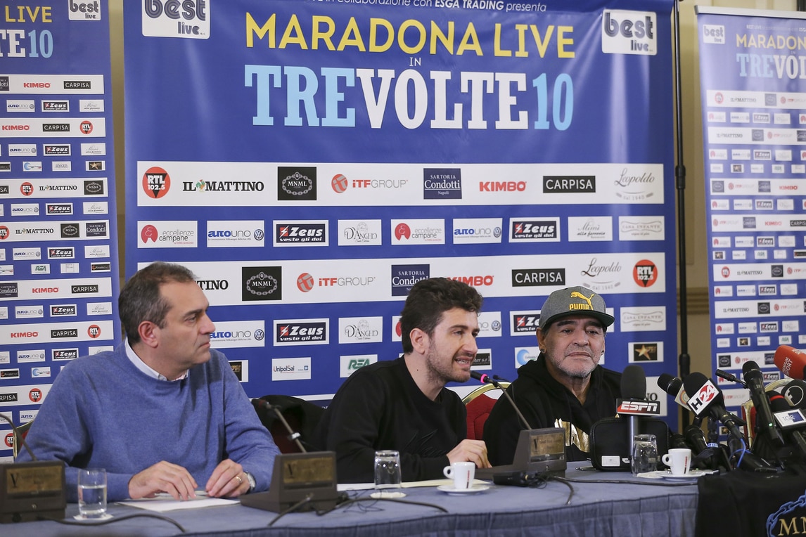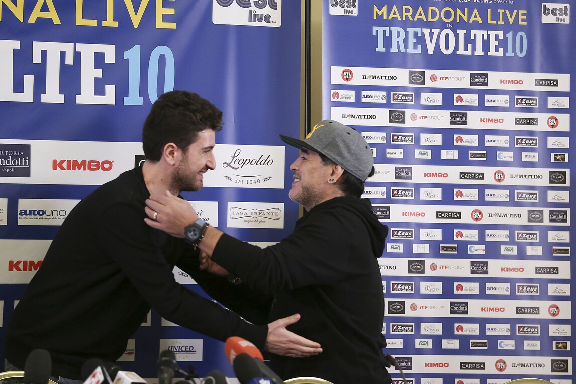 Il Pibe de Oro presenta lo spettacolo di Alessandro Siani che lo vedrà domani sera protagonista al San Carlo. Presente anche il sindaco De Magistris. Orecchini di diamanti blu e cappellino con visiera per l'argentino che dice: «Se il Napoli oggi può avere l'illusione dello scudetto è perché un giorno io decisi che questa doveva essere una squadra da scudetto. Lo dissi a un presidente»