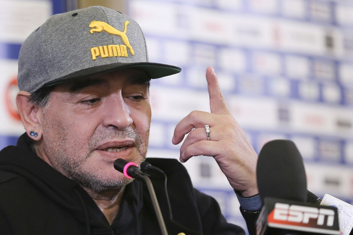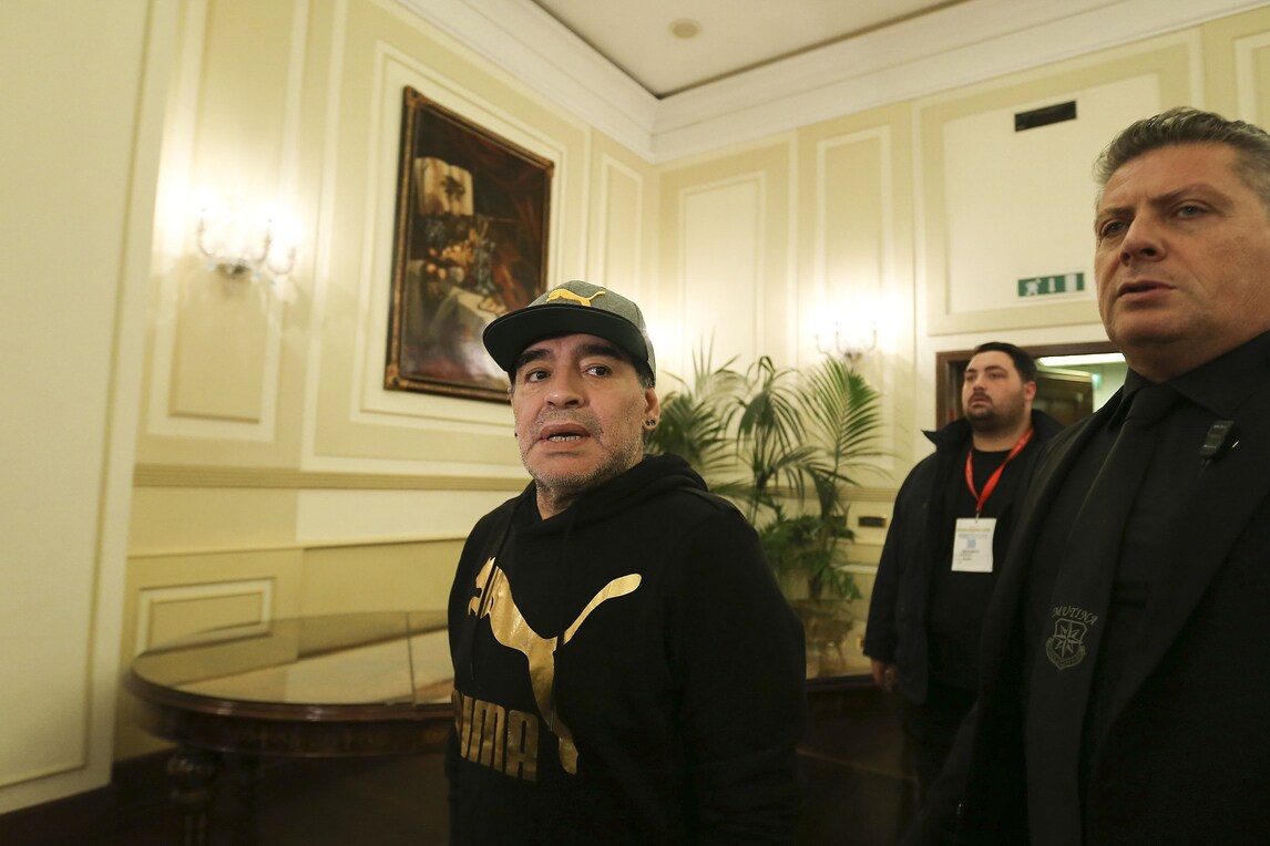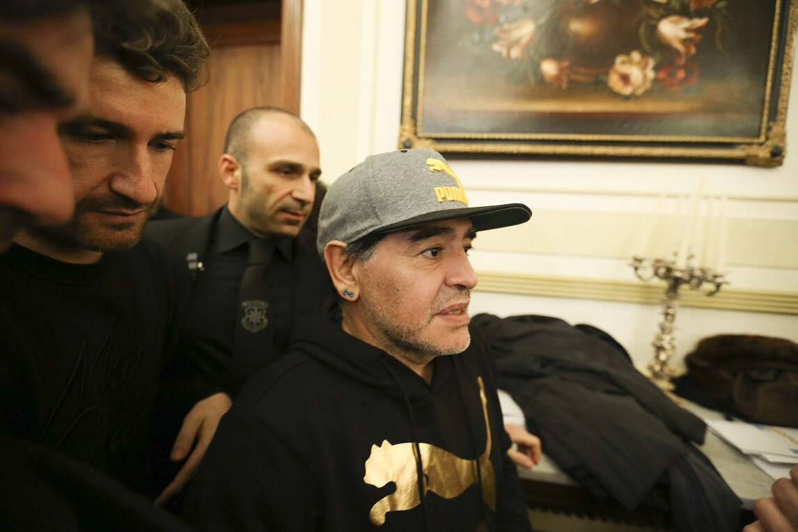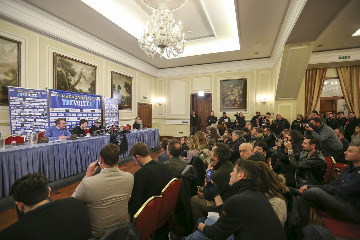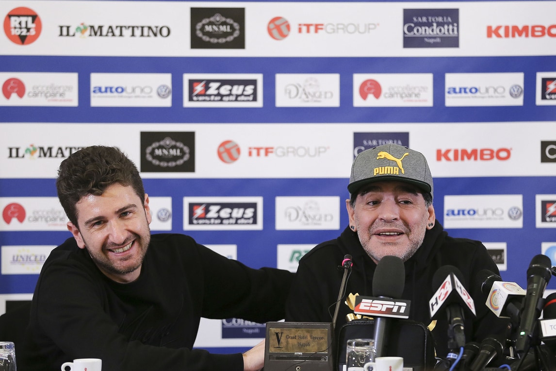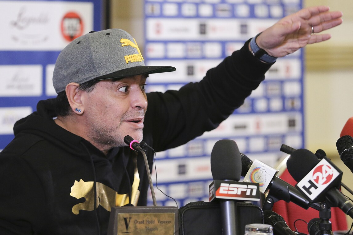 Il Pibe de Oro presenta lo spettacolo di Alessandro Siani che lo vedrà domani sera protagonista al San Carlo. Presente anche il sindaco De Magistris. Orecchini di diamanti blu e cappellino con visiera per l'argentino che dice: «Se il Napoli oggi può avere l'illusione dello scudetto è perché un giorno io decisi che questa doveva essere una squadra da scudetto. Lo dissi a un presidente»