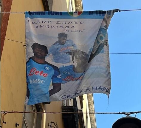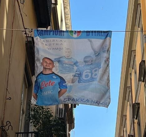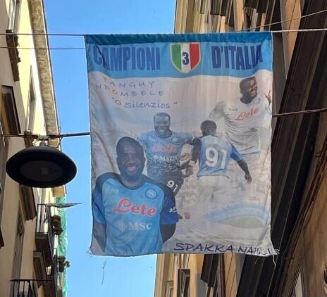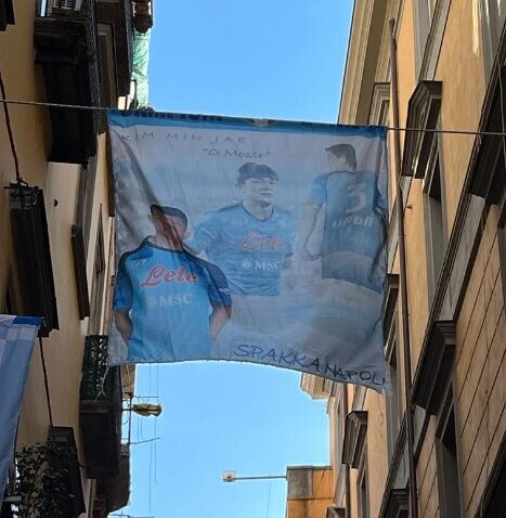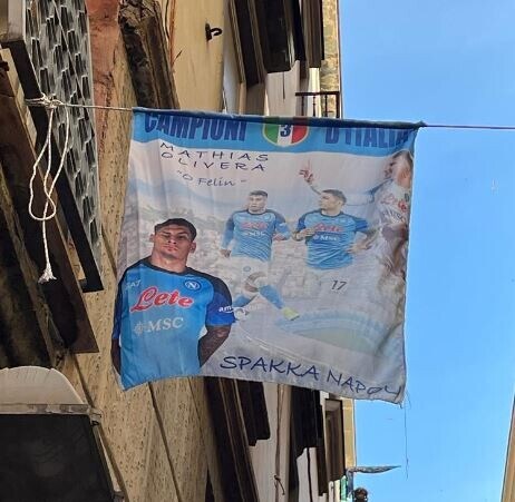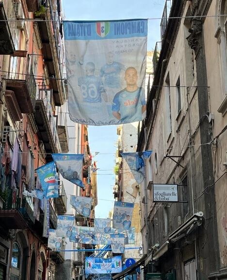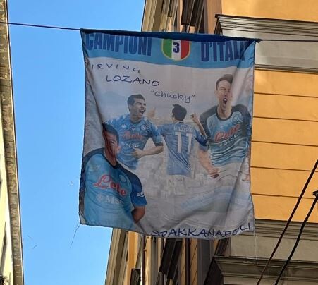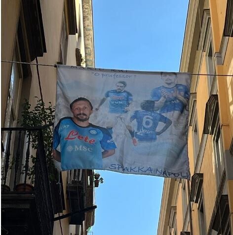 In pieno centro, in una delle strade più famose della città, i calciatori azzurri ricevono nomi alternativi con striscioni esposti tra i balconi