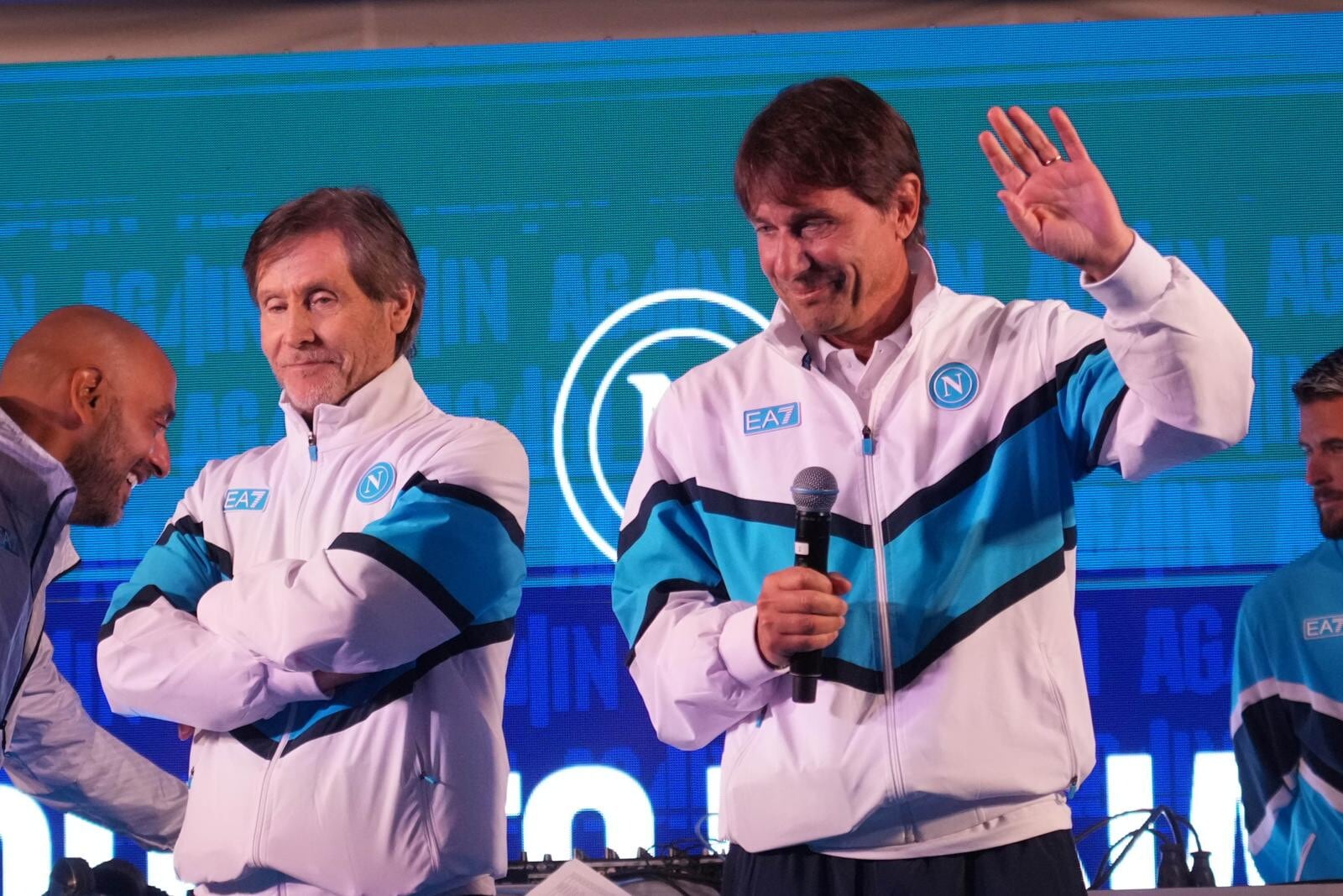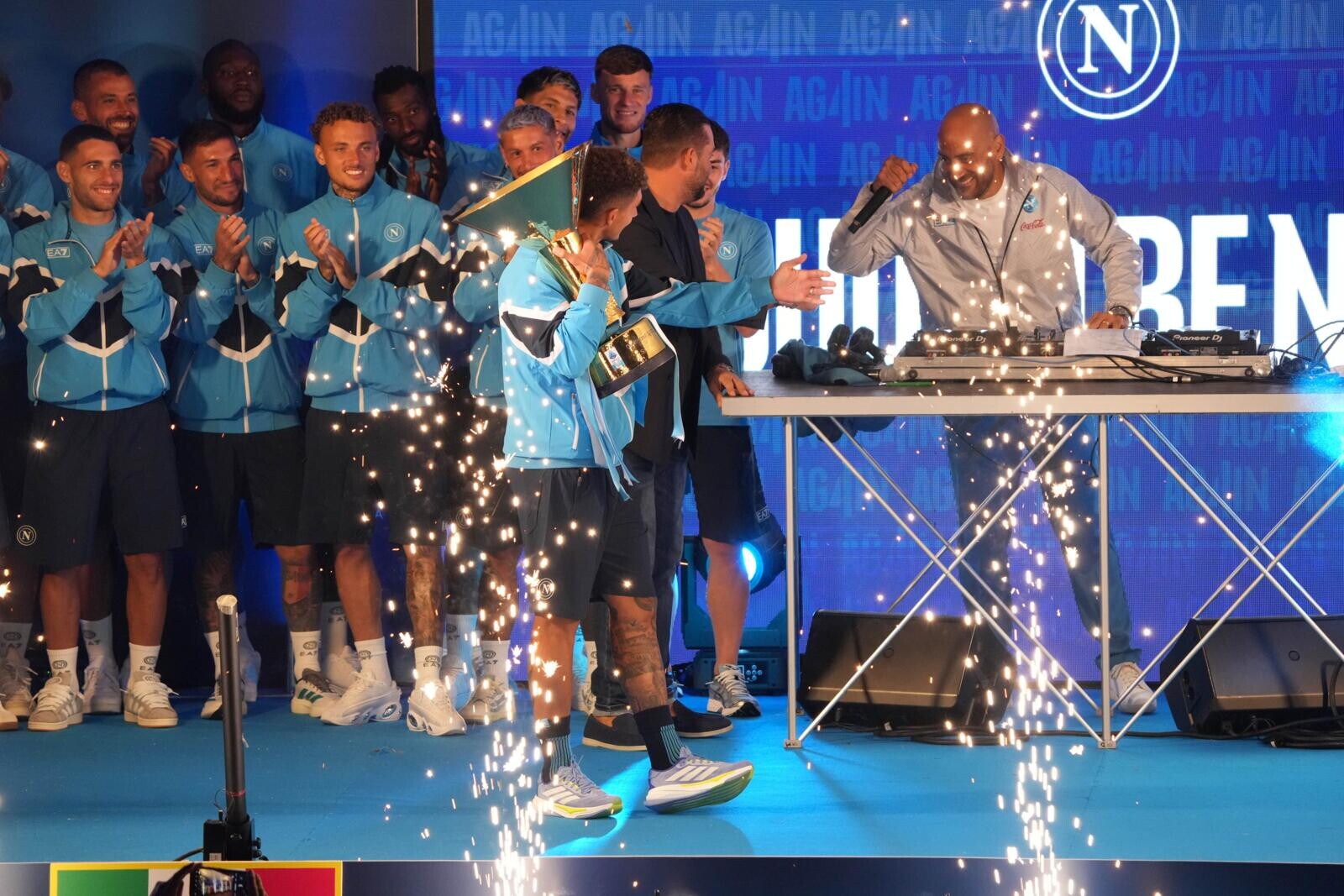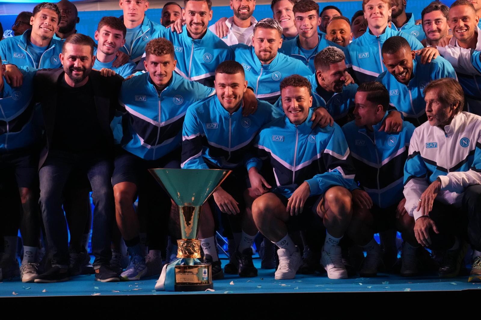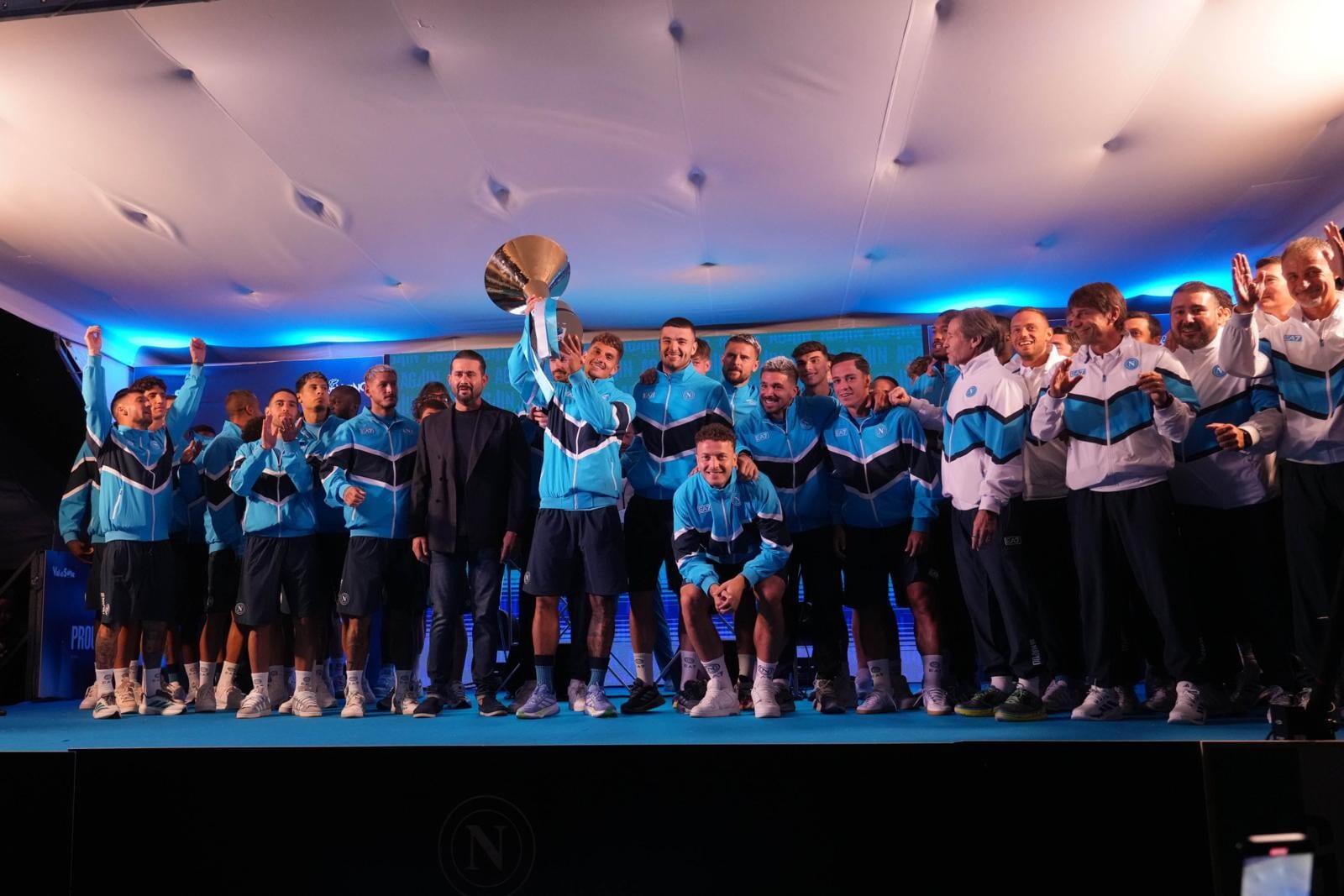 Conte, Oriali, Di Lorenzo, i nuovi acquisti e tutta la squadra salgono sul palco acclamati dai sostenitori azzurri presenti in ritiro: tutte le foto