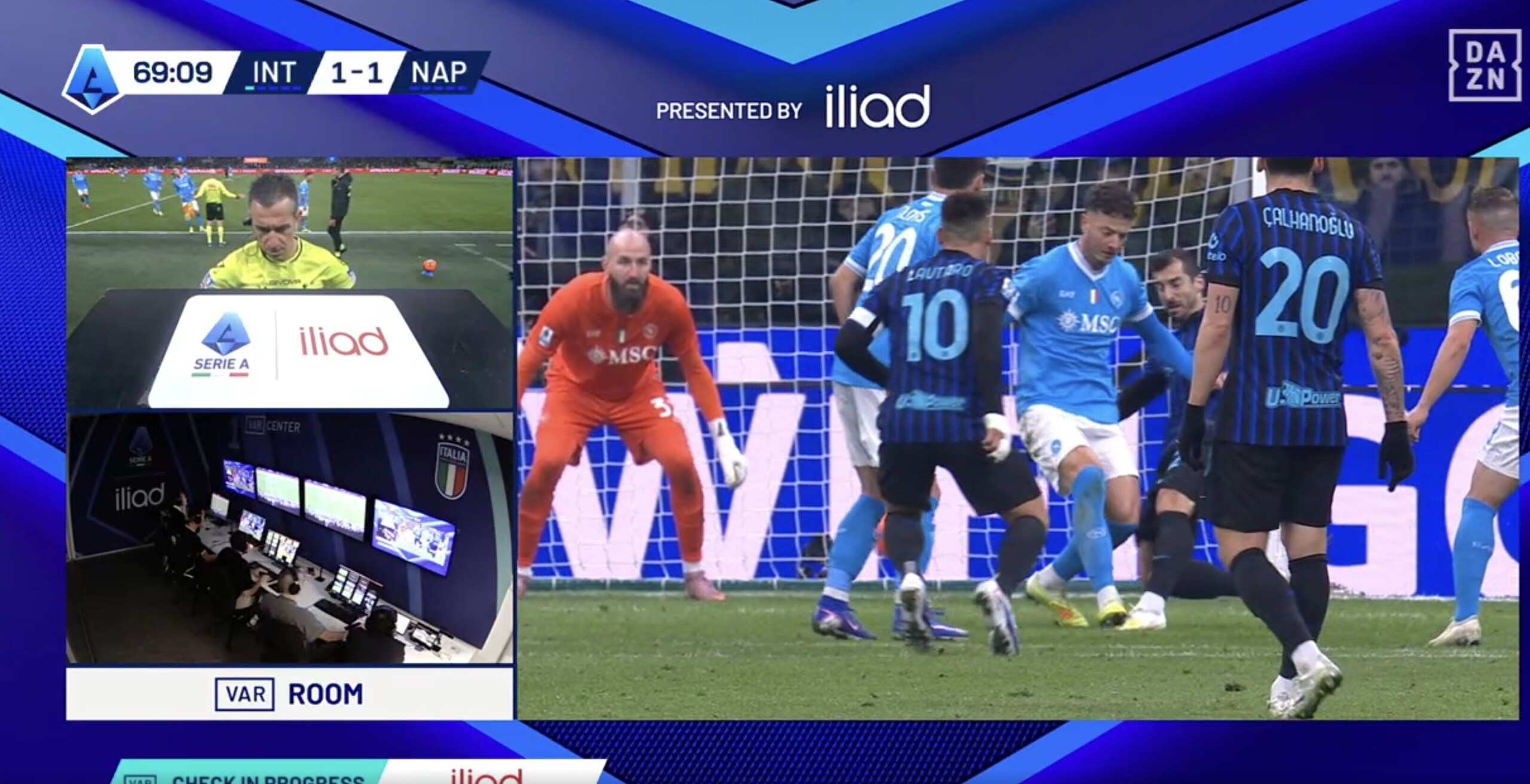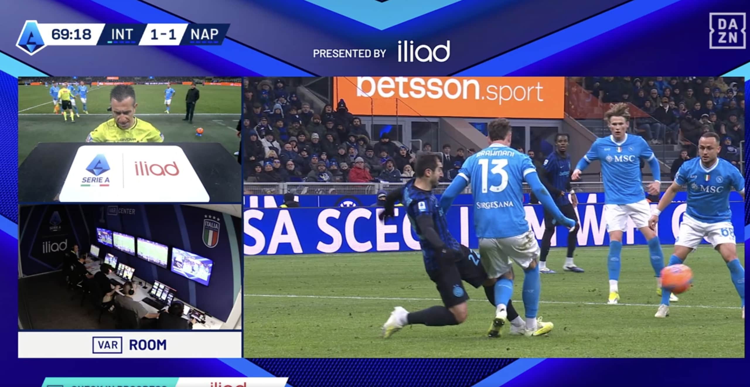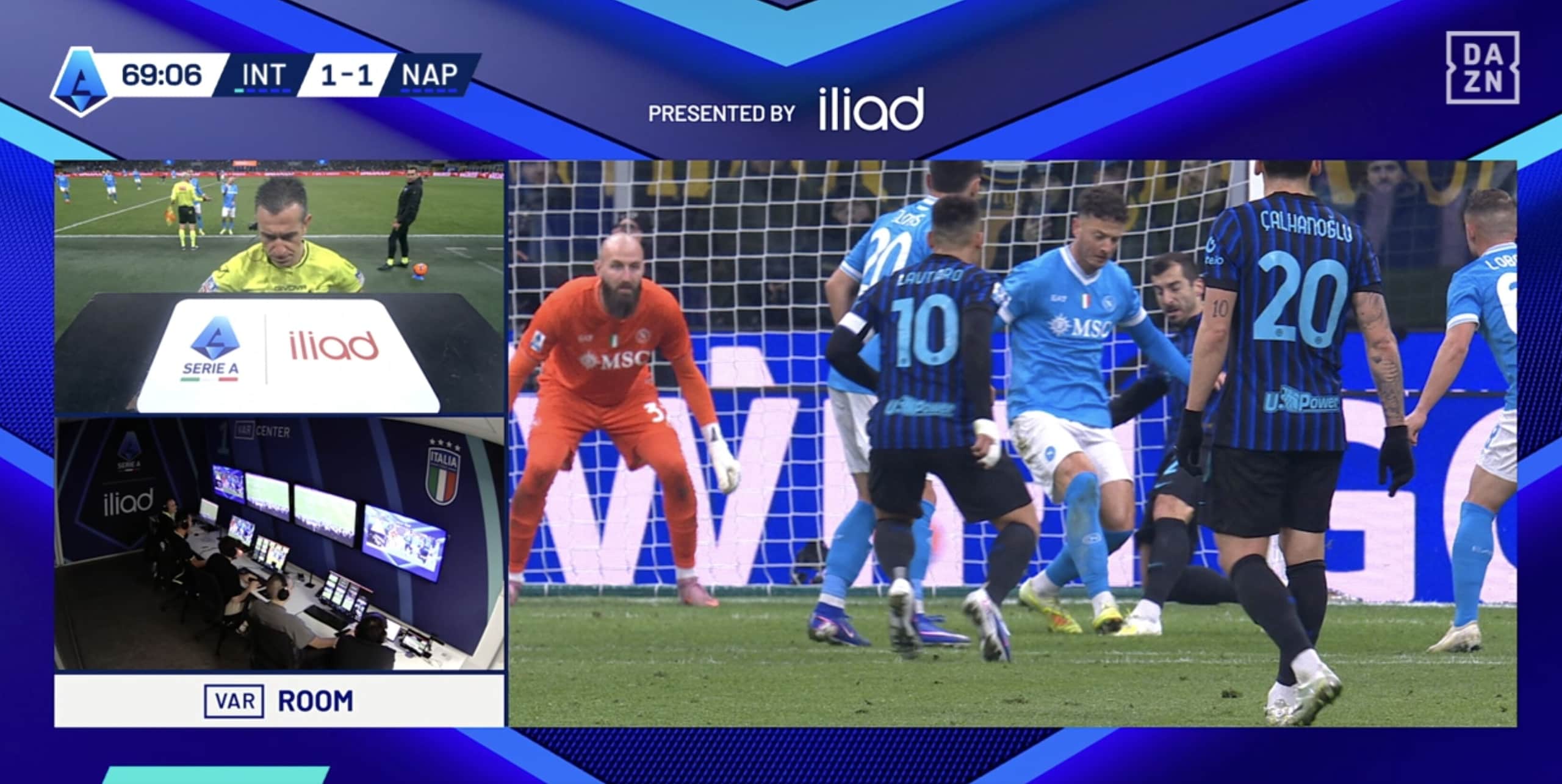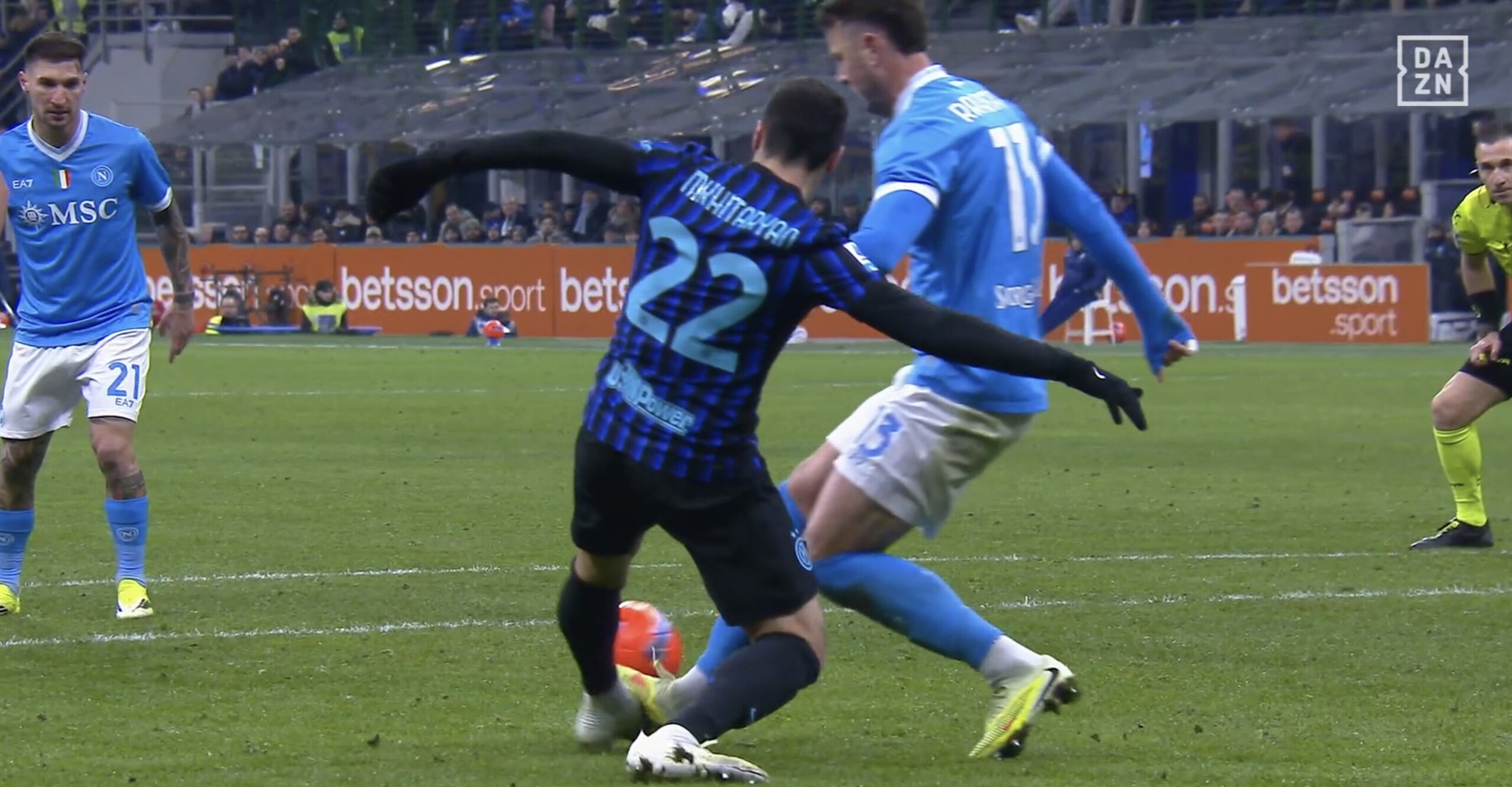 Il tecnico del Napoli si prende il rosso per le proteste dopo che l'arbitro viene richiamato al Var per il pestone di Rrhamani su Mkhitaryan