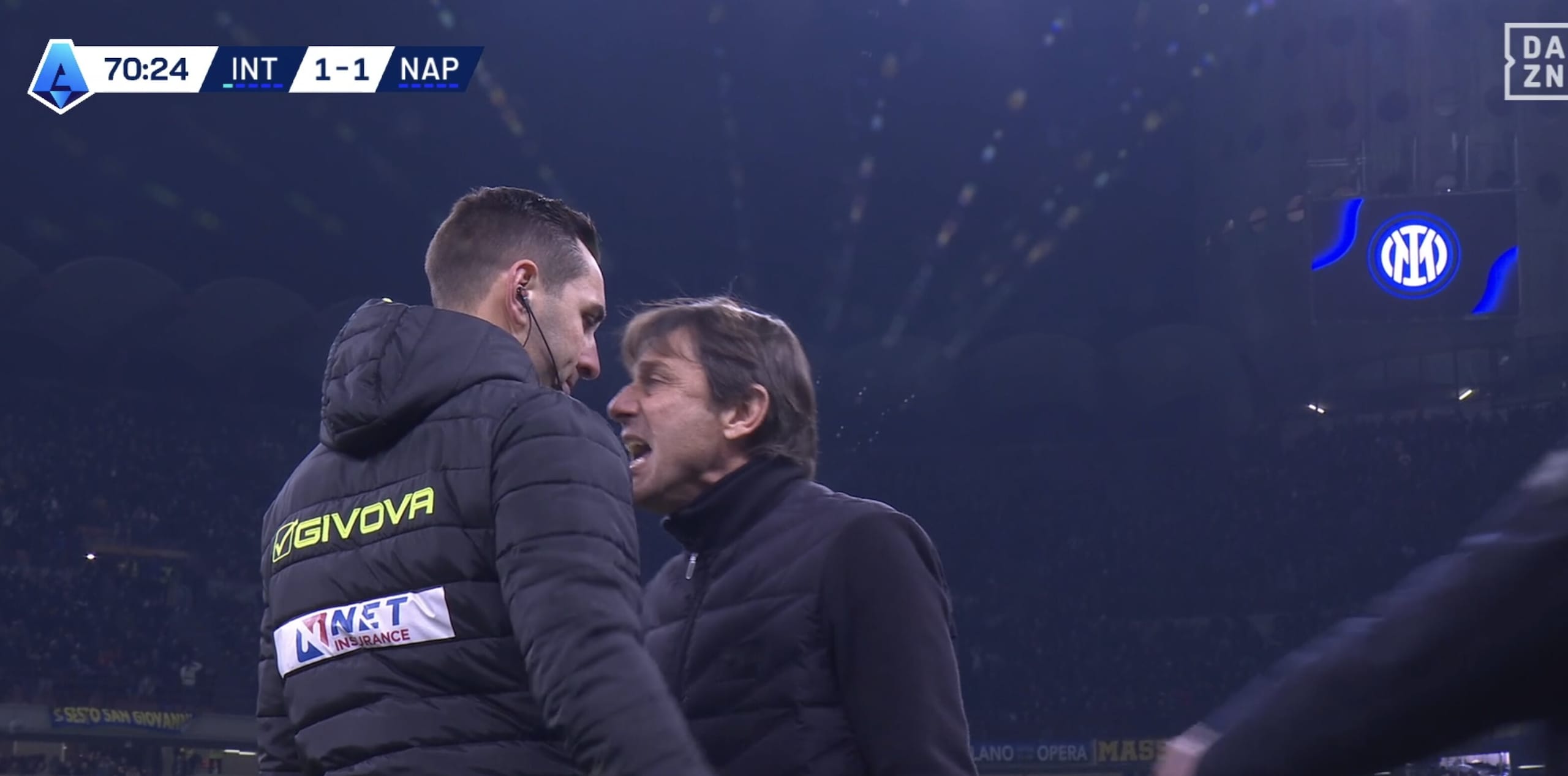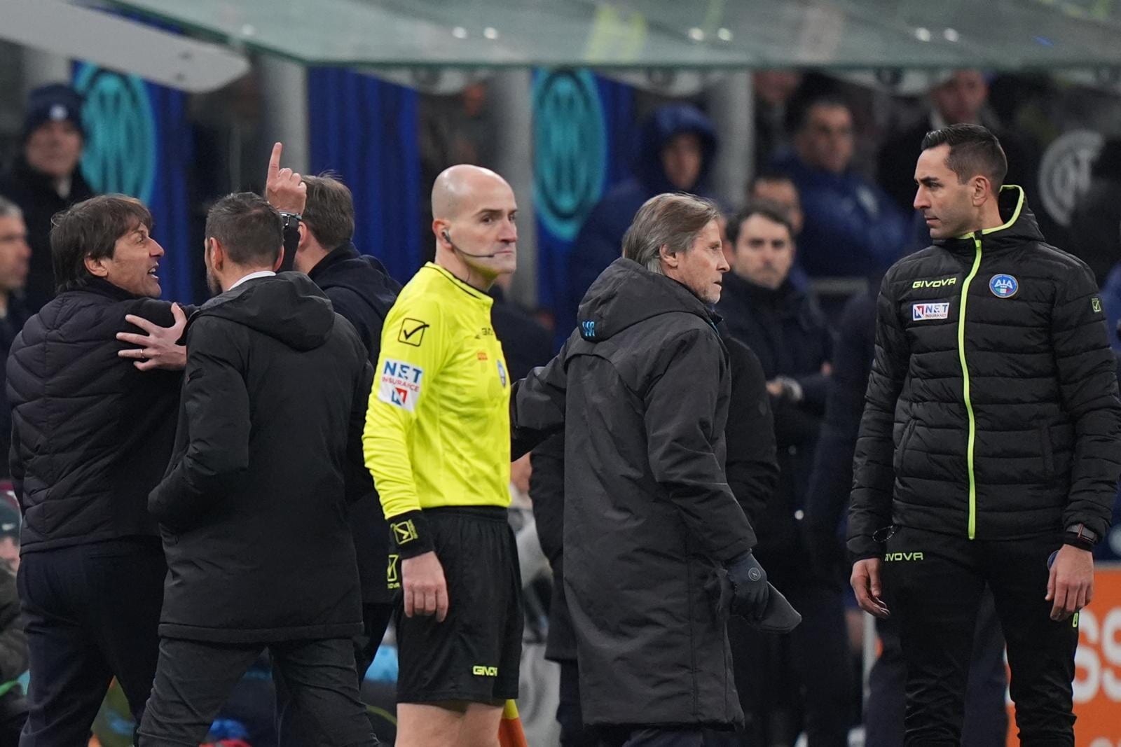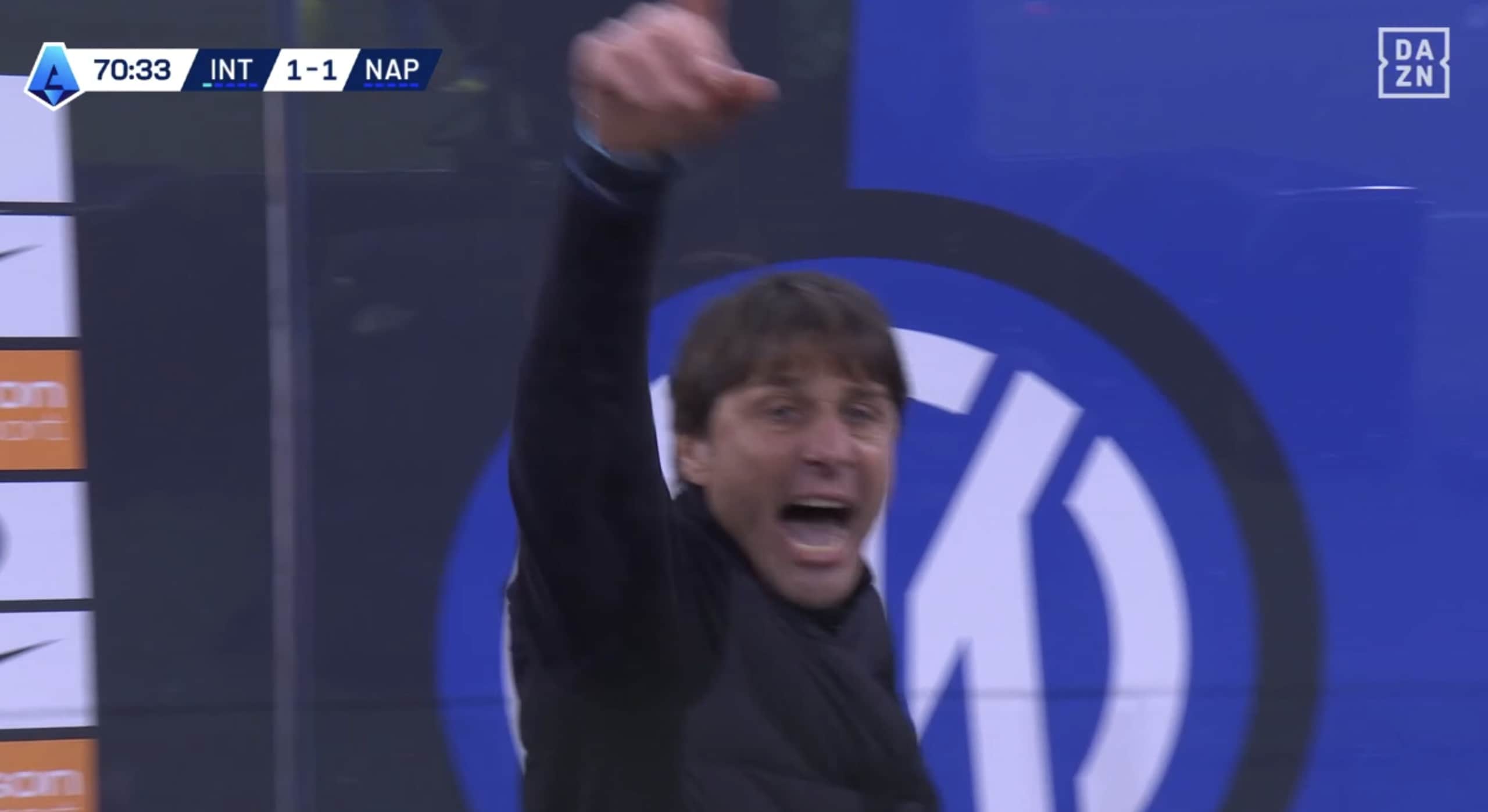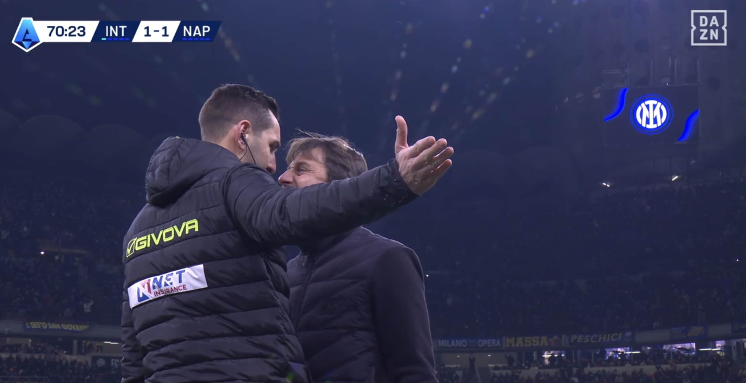 Conte faccia a faccia con il quarto uomo dopo il rigore assegnato all'Inter, Doveri estrae il rosso: la fotosequenza