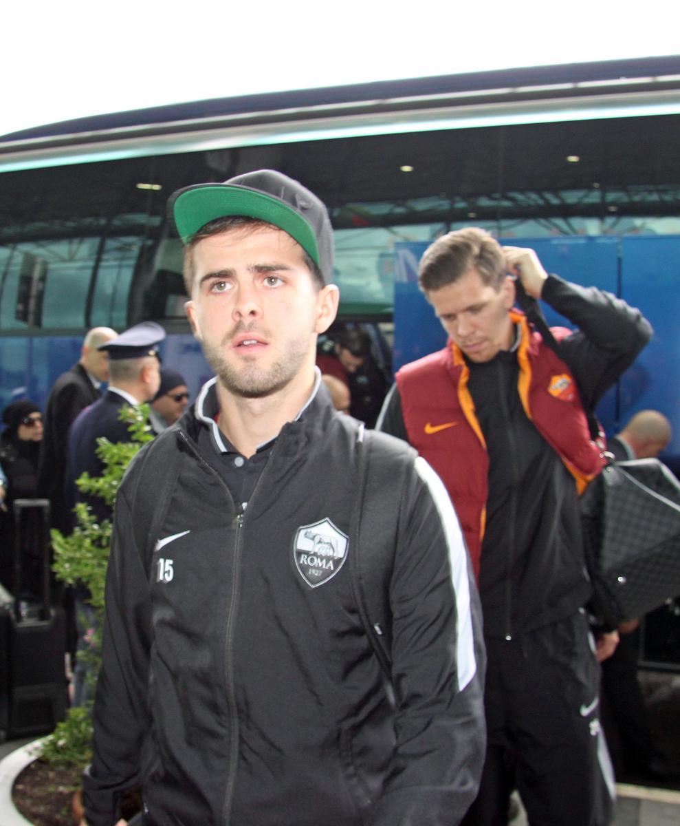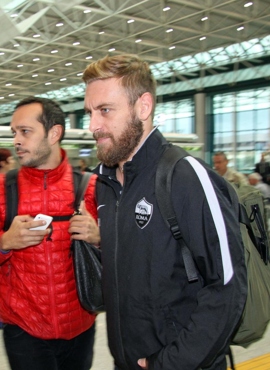 I giocatori giallorossi a Fiumicino pronti per volare in Spagna dove sfideranno il club di Luis Enrique
