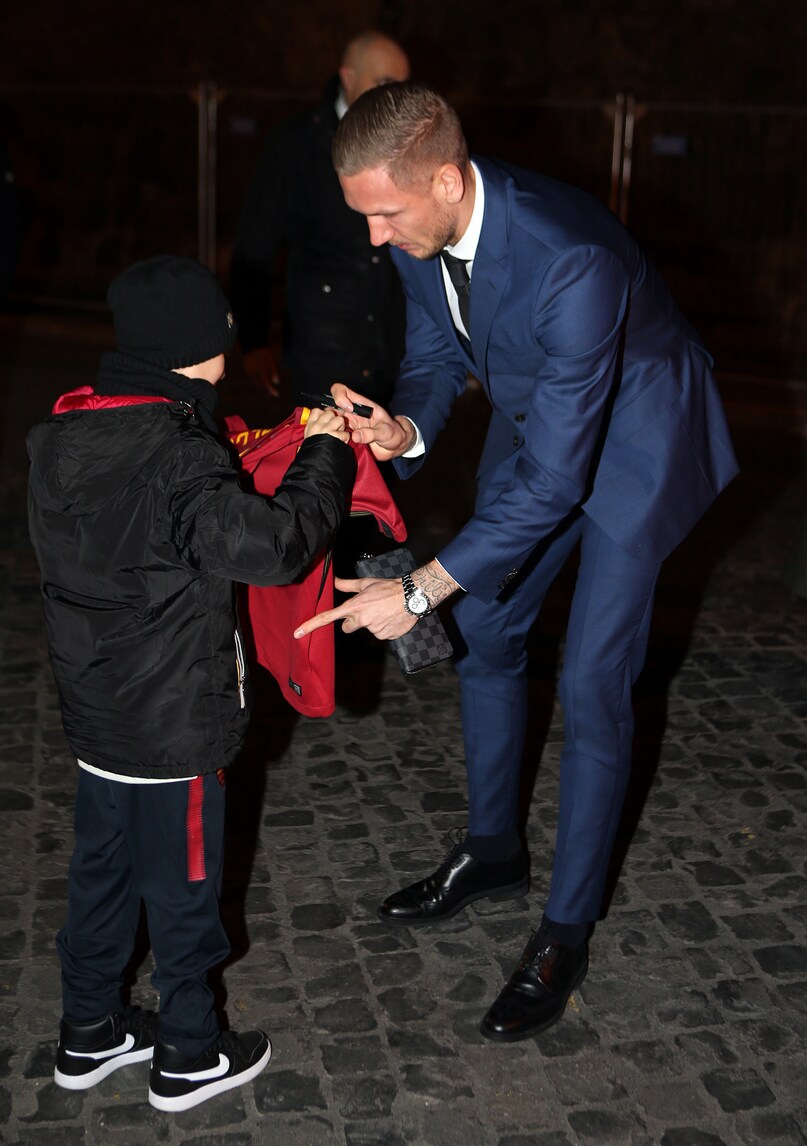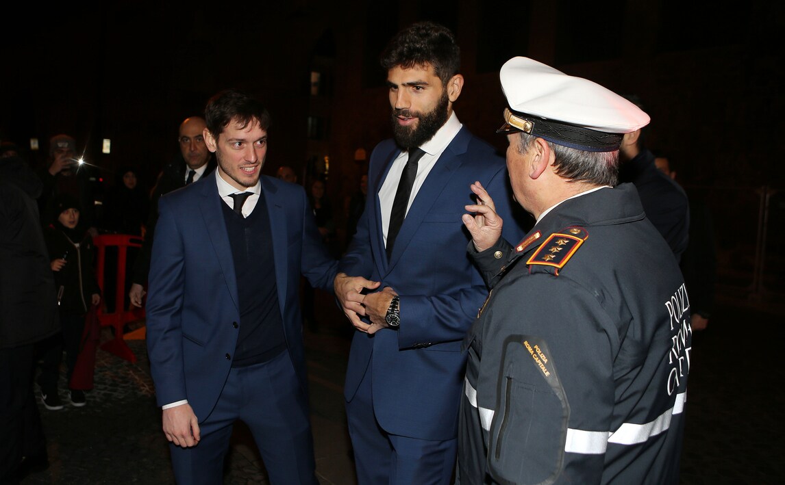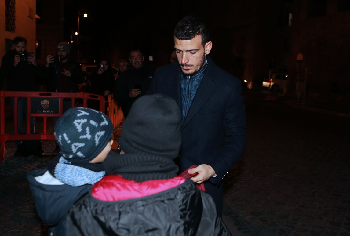 La squadra giallorossa si è ritrovata all'Auditorium della Conciliazione per una cena prima delle feste. Il difensore Federico Fazio è stato protagonista di un siparietto con un vigile dopo aver percorso una strada sbagliata: "Se non segni di testa ti tolgo la patente", ha detto l'agente