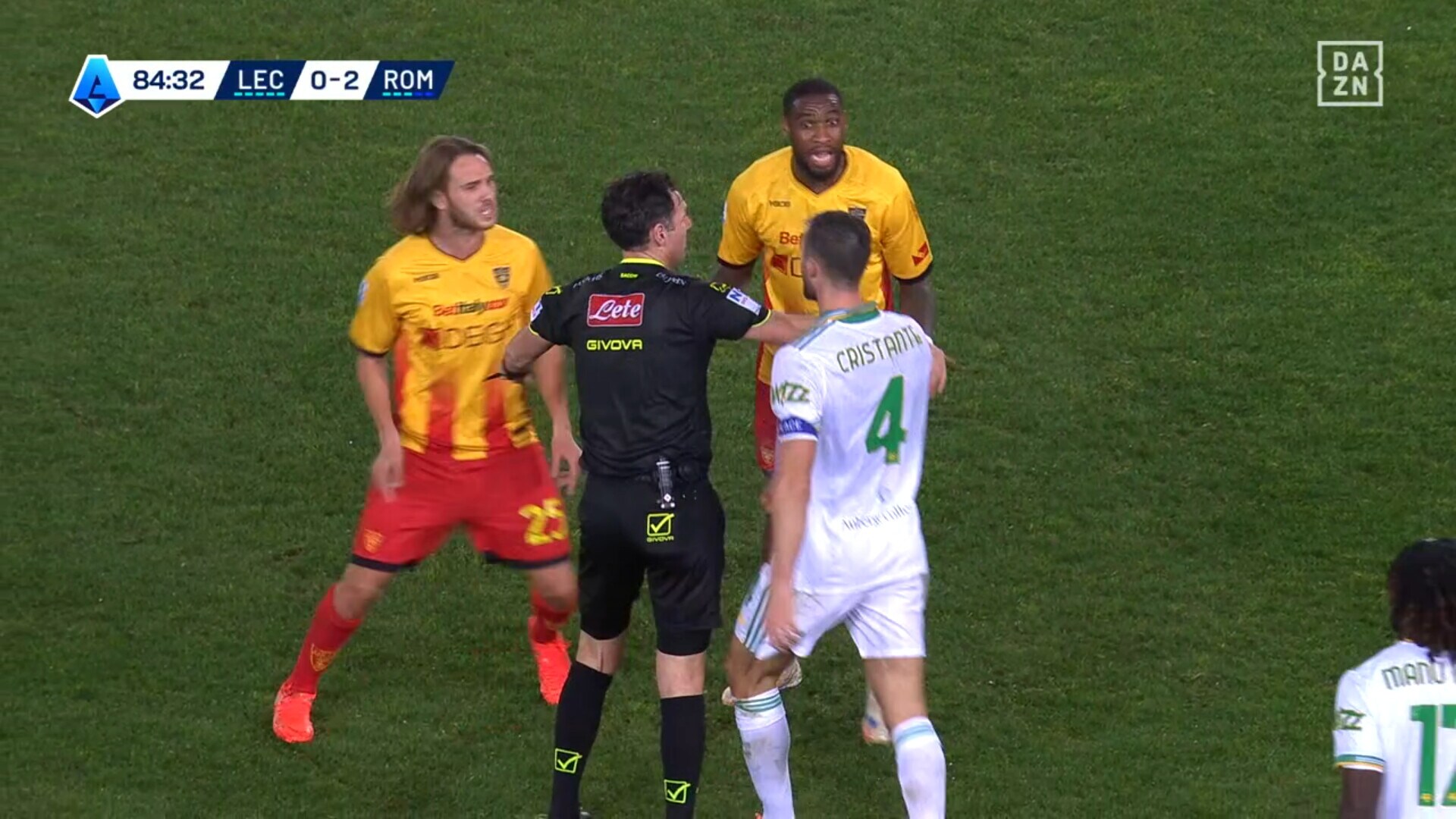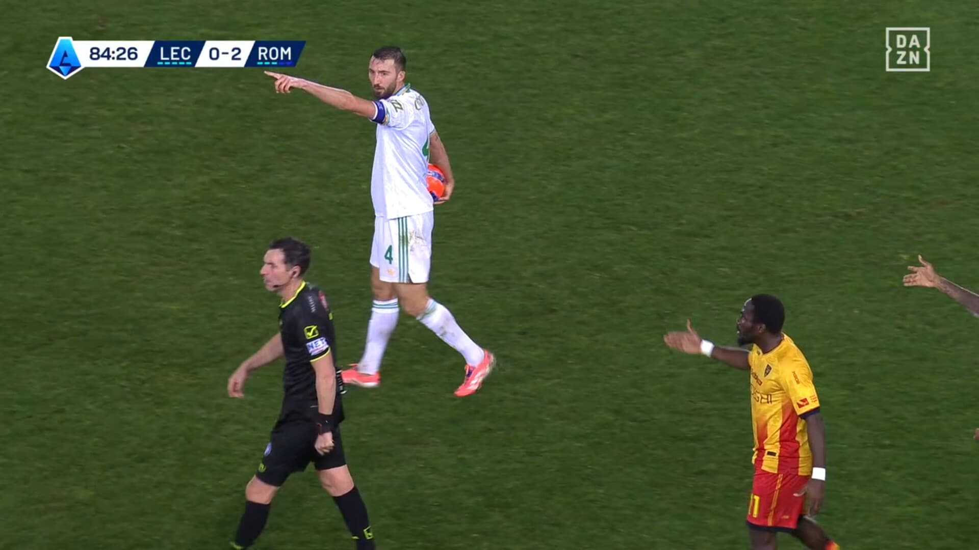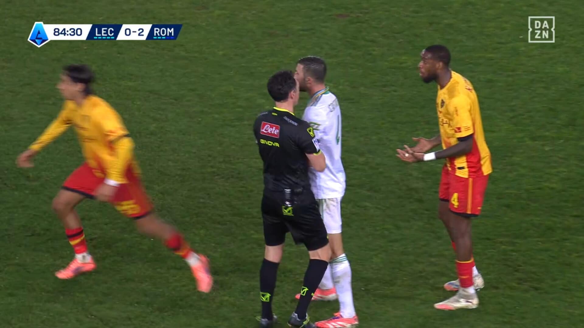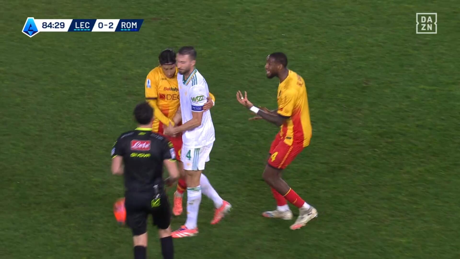 Attimi concitati dopo uno scontro di gioco in Lecce-Roma, ammonizione che fa arrabbiare il capitano dei giallorossi capitolini: era in diffida, salterà la sfida con il Sassuolo