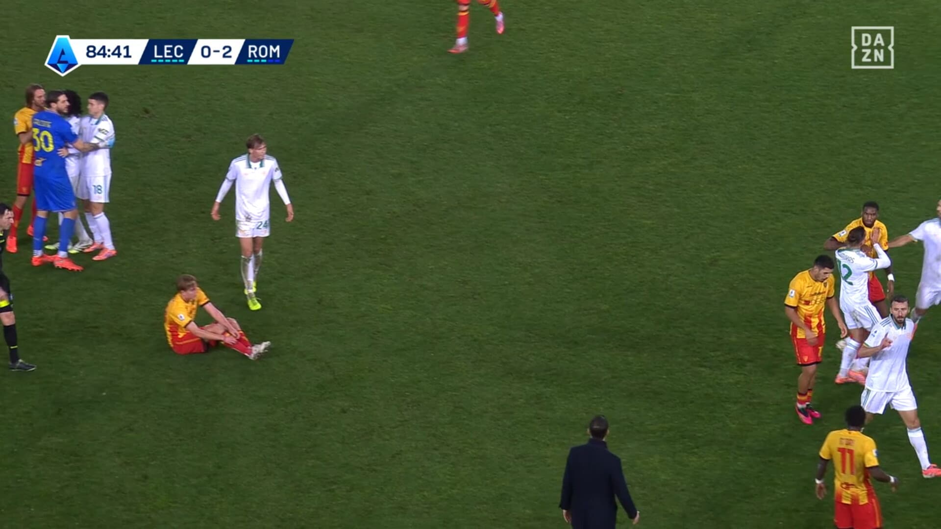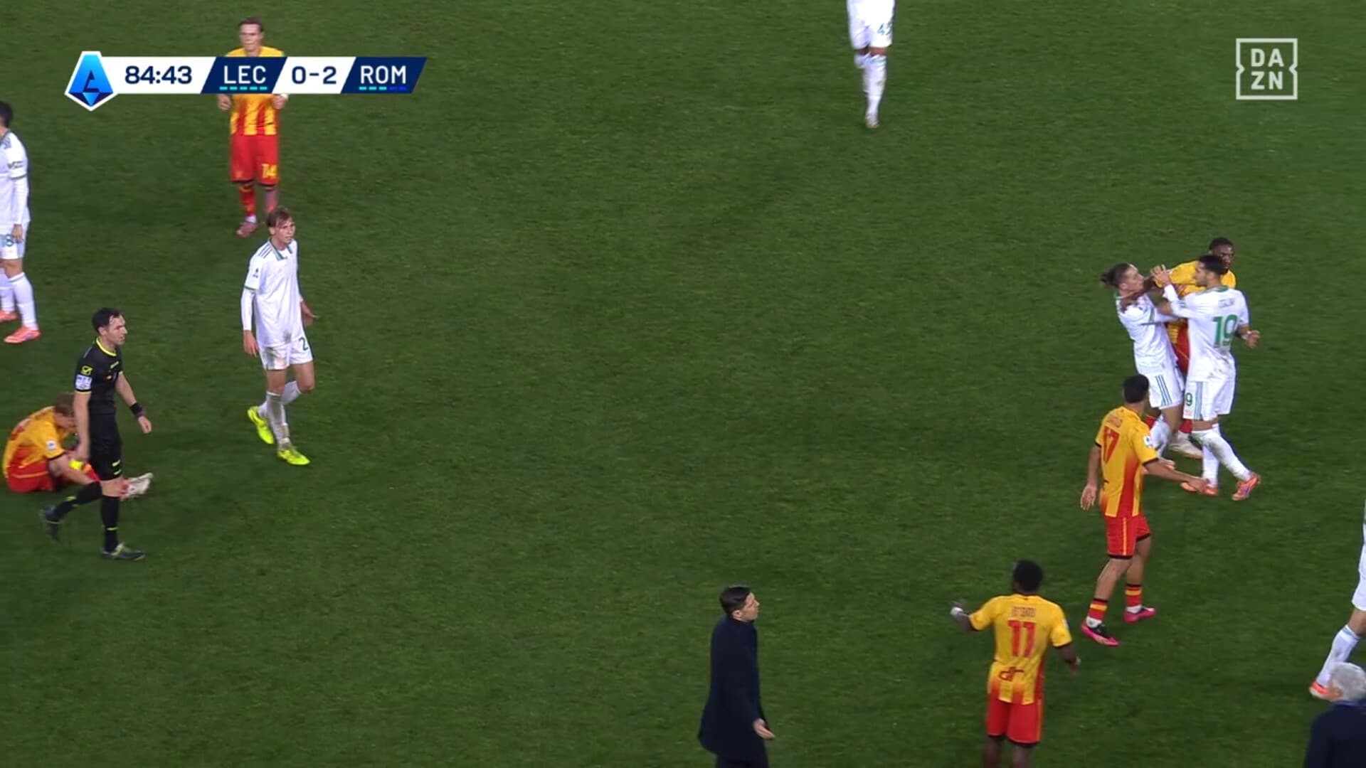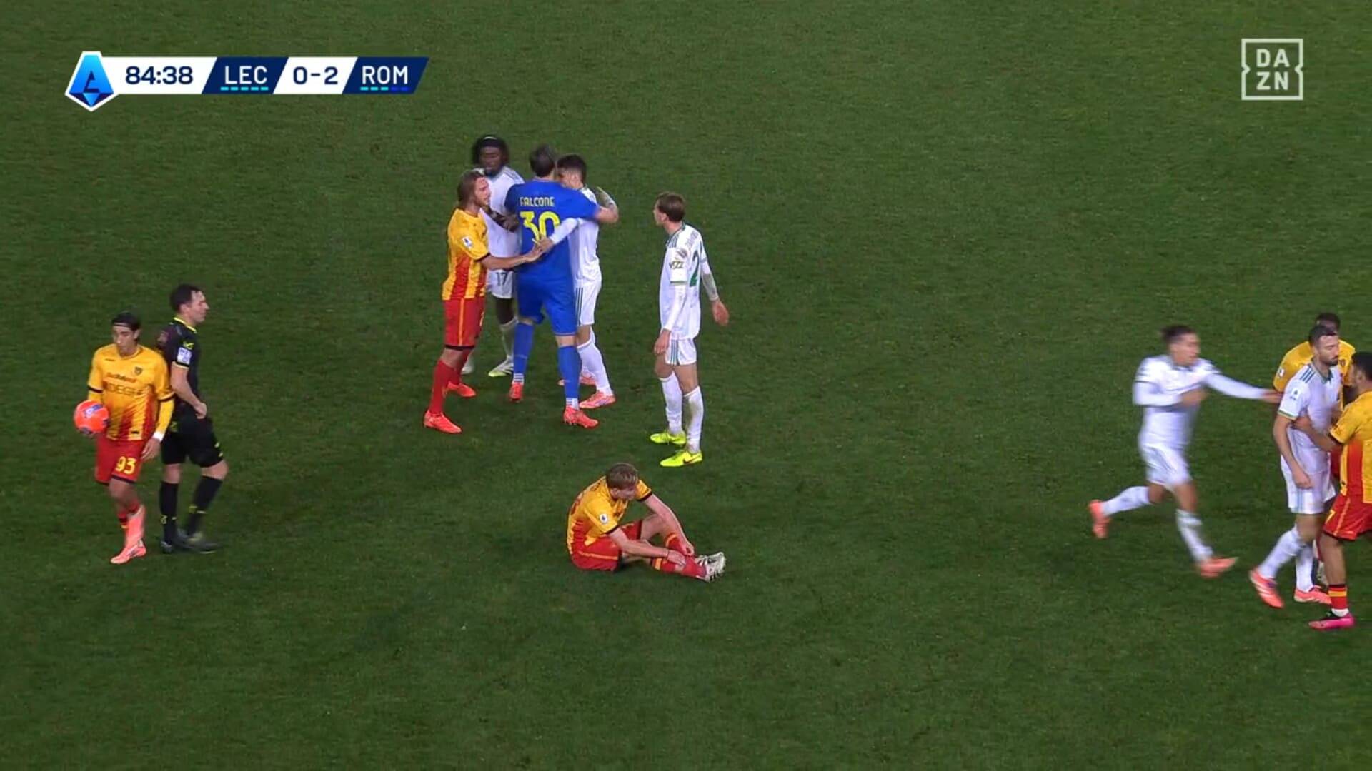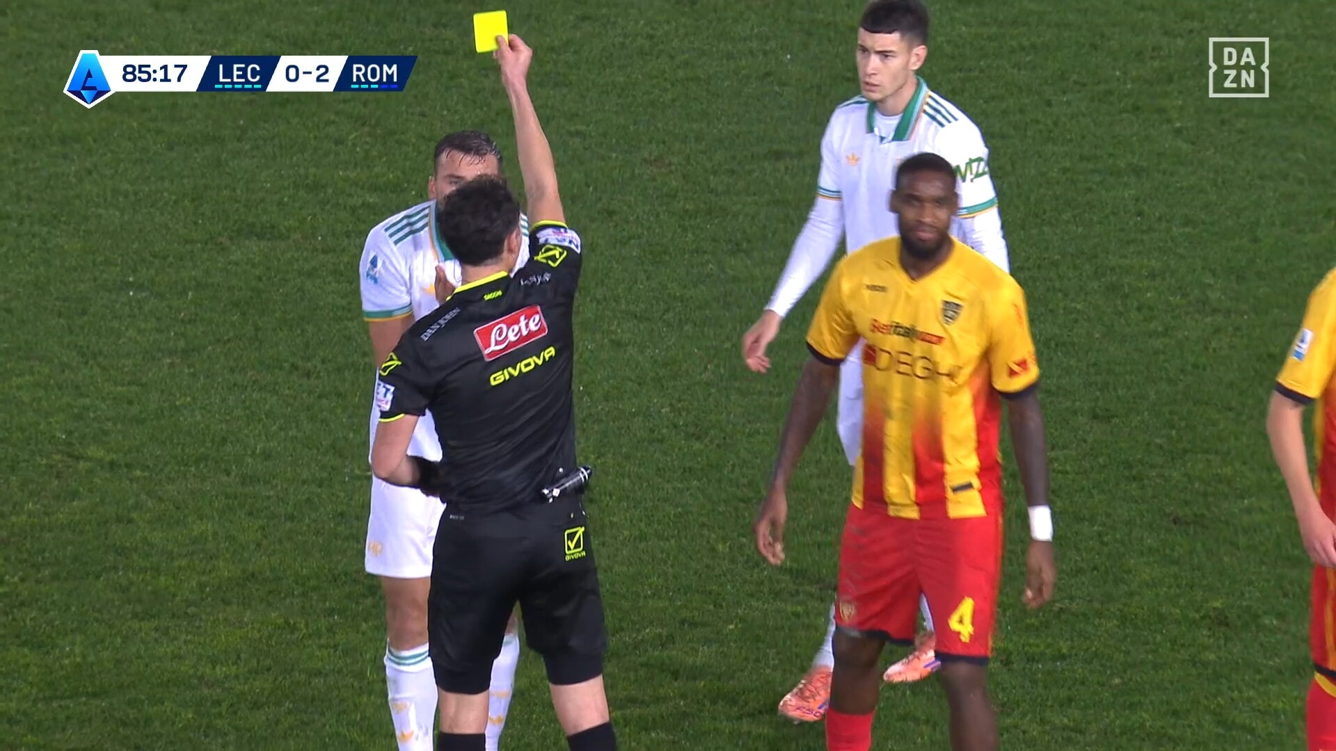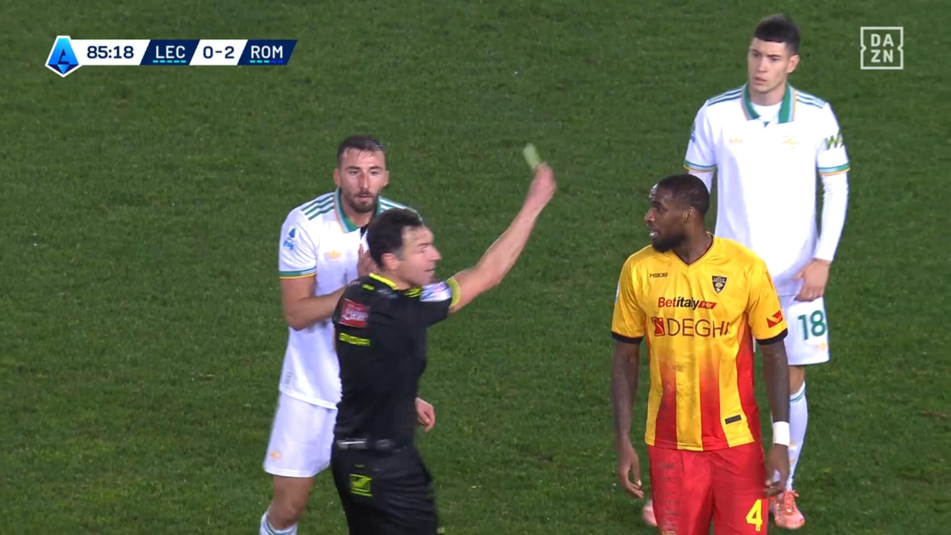 Attimi concitati dopo uno scontro di gioco in Lecce-Roma, ammonizione che fa arrabbiare il capitano dei giallorossi capitolini: era in diffida, salterà la sfida con il Sassuolo