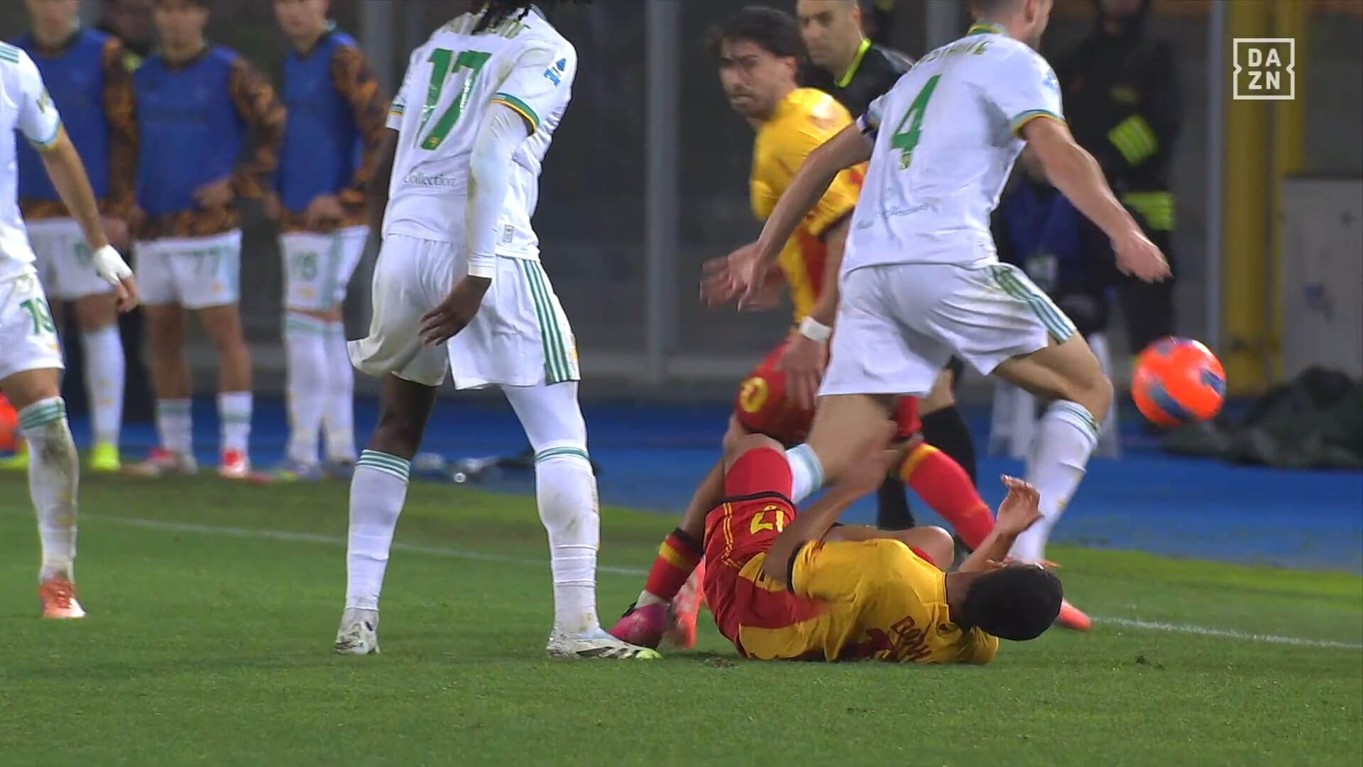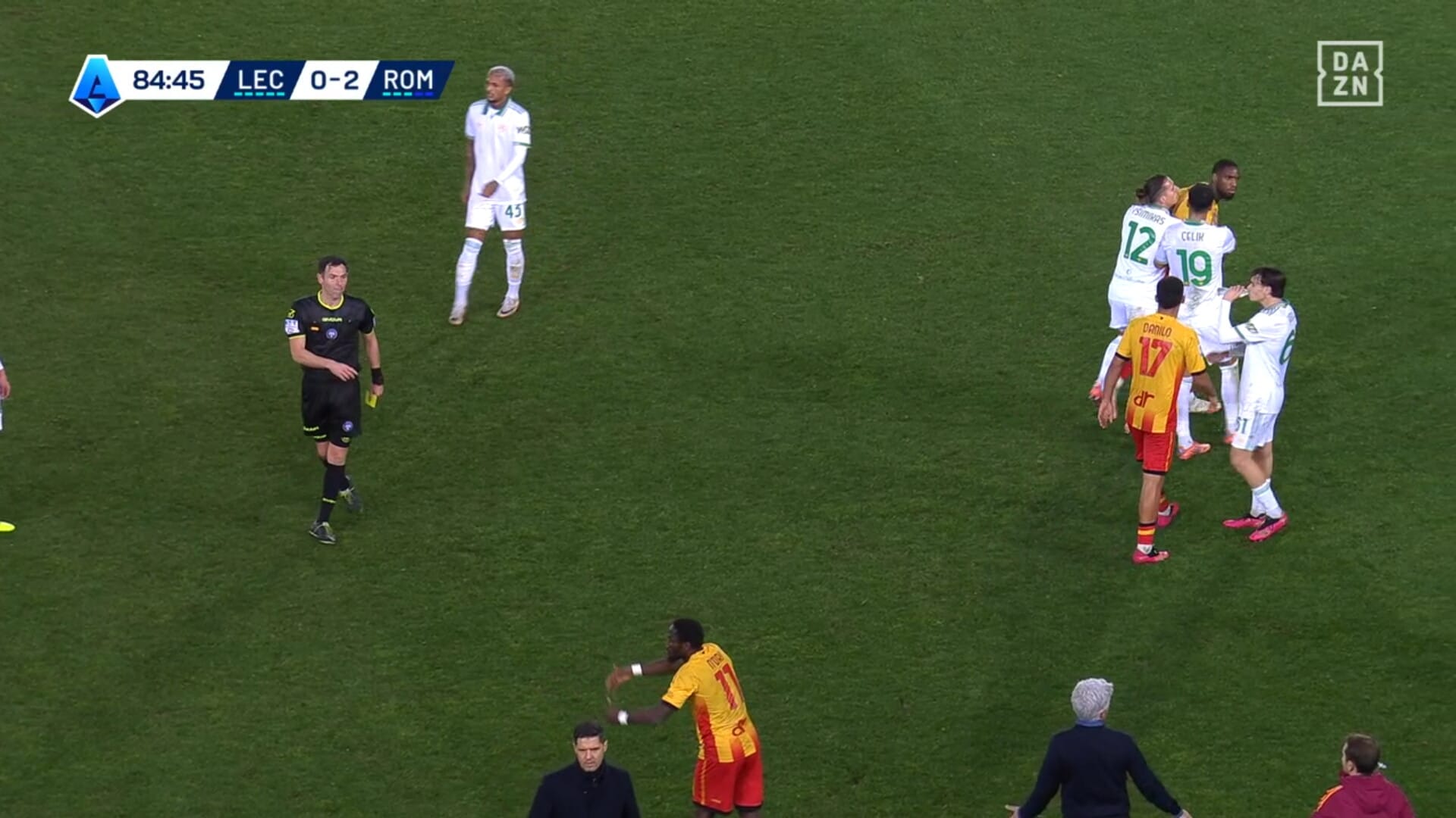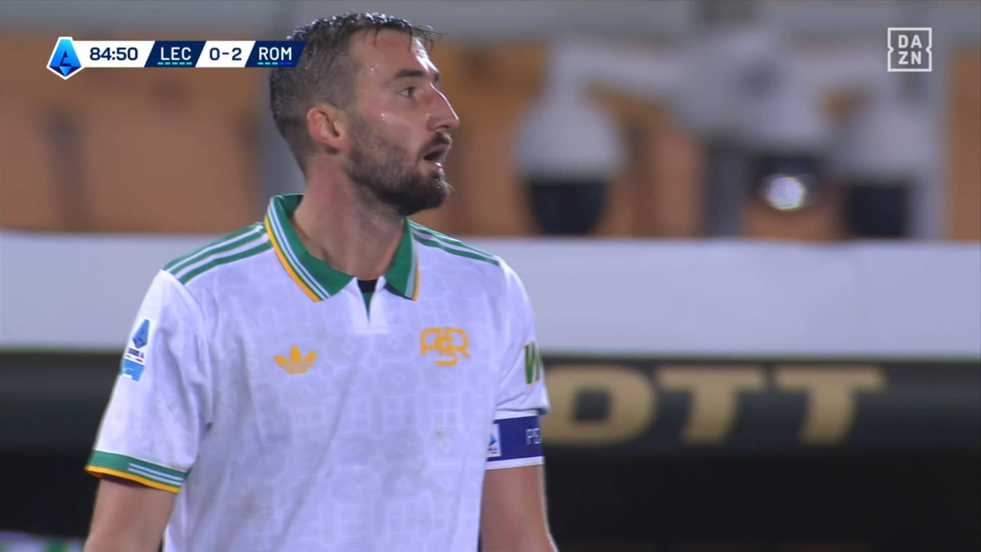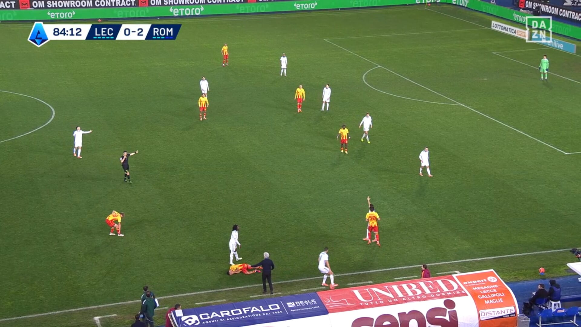 Attimi concitati dopo uno scontro di gioco in Lecce-Roma, ammonizione che fa arrabbiare il capitano dei giallorossi capitolini: era in diffida, salterà la sfida con il Sassuolo