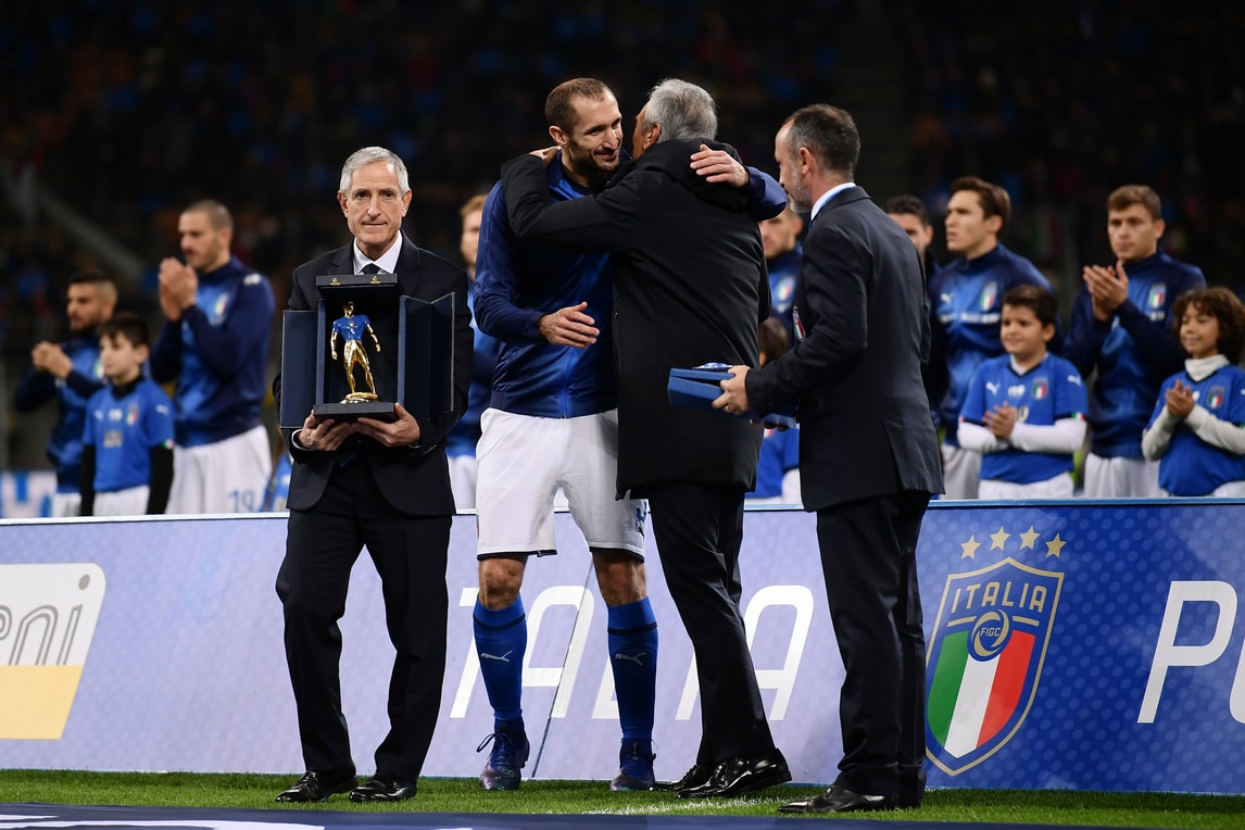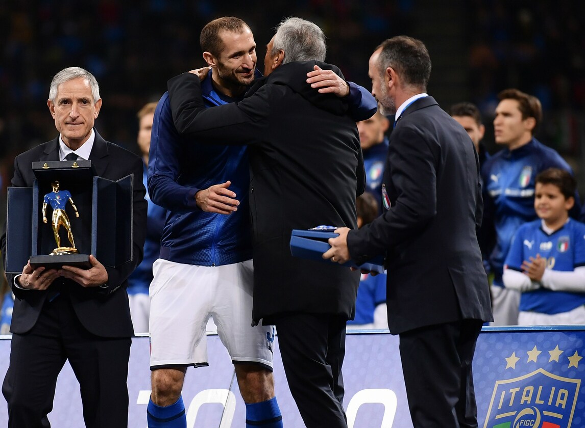 Il capitano dell'Italia è entrato nell'esclusivo club dei 100 diventando così il settimo centenario della selezione azzurra: «Stasera a tratti abbiamo giocato più con il cuore che con la testa, esponendoci anche a qualche contropiede: dobbiamo crescere». Davanti allo juventino ci sono Gianluigi Buffon con 176, Fabio Cannavaro con 136, Paolo Maldini con 126, Daniele De Rossi con 117, Andrea Pirlo con 116 e Dino Zoff con 112. Prima del fischio d'inizio di Italia-Portogallo è stato premiato dal presidente della Federcalcio, Gabriele Gravina
