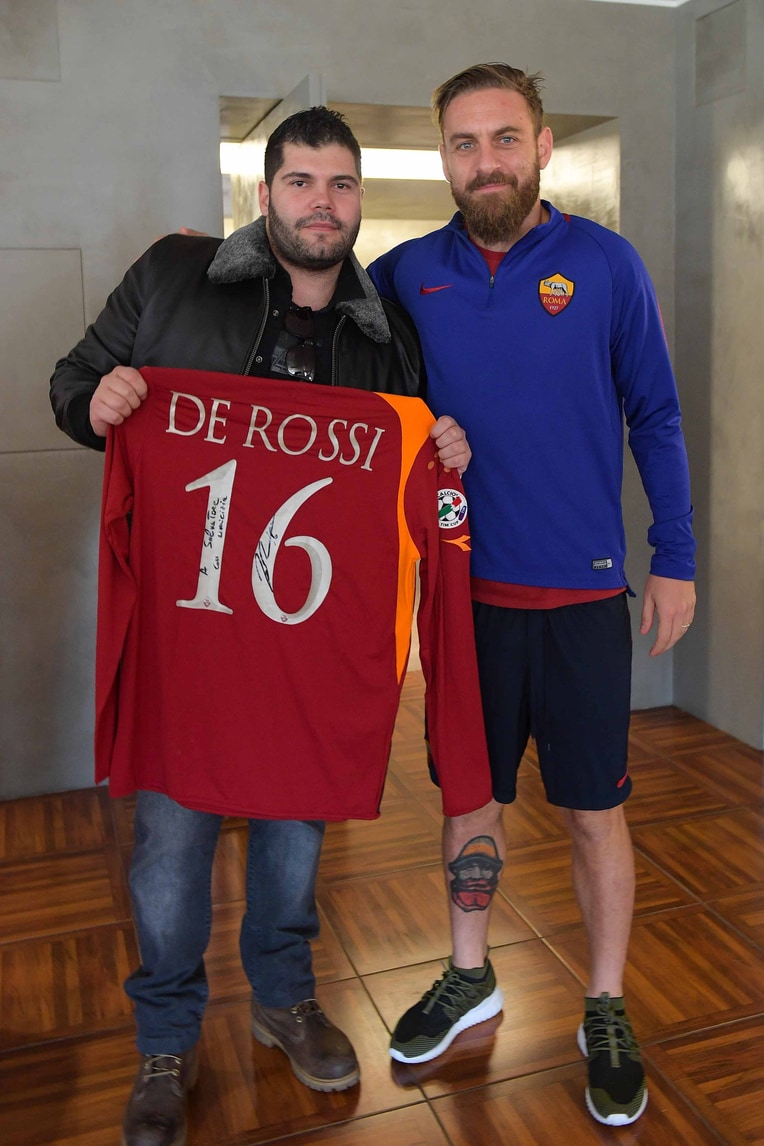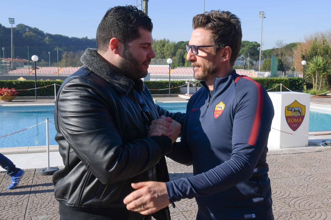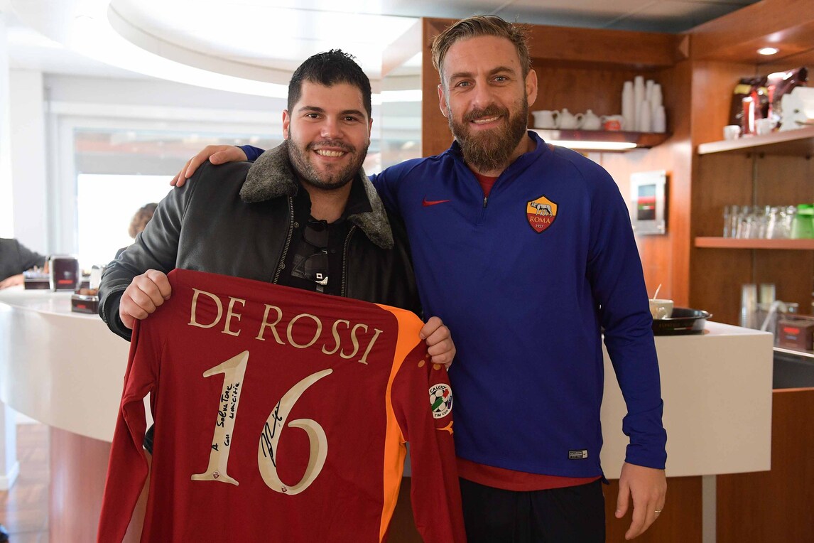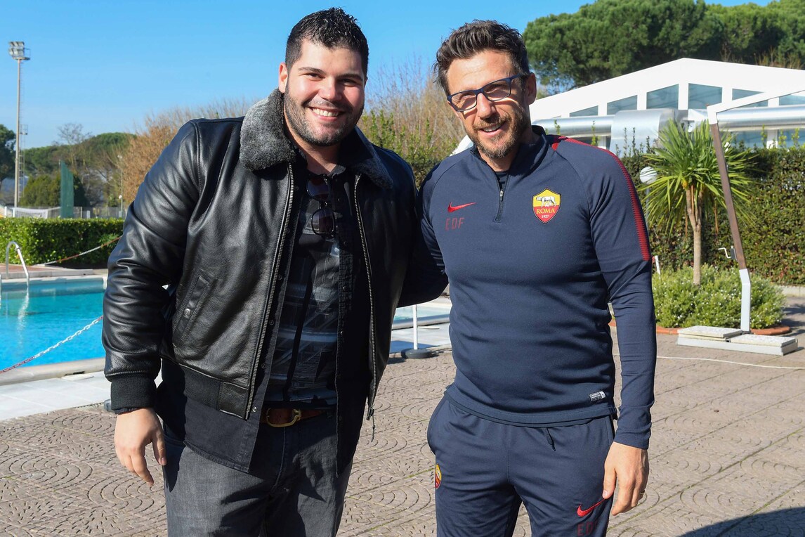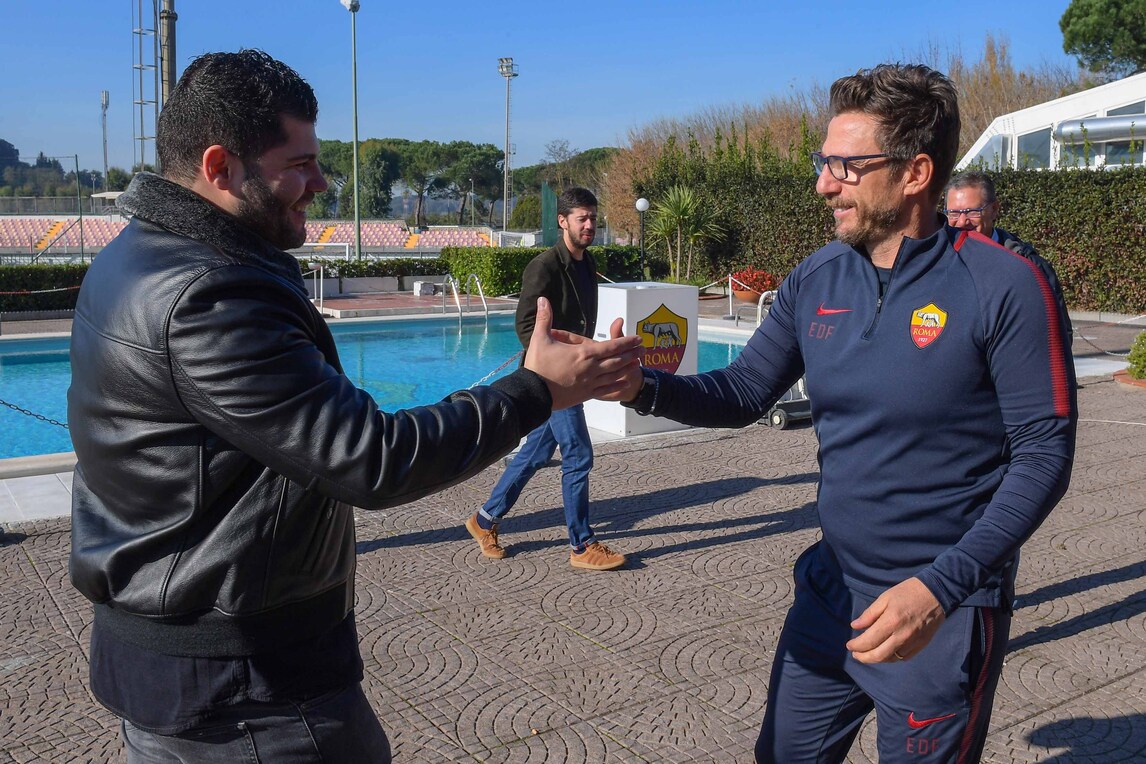 Il protagonista della serie tv Gomorra ha fatto visita alla squadra giallorossa a Trigoria