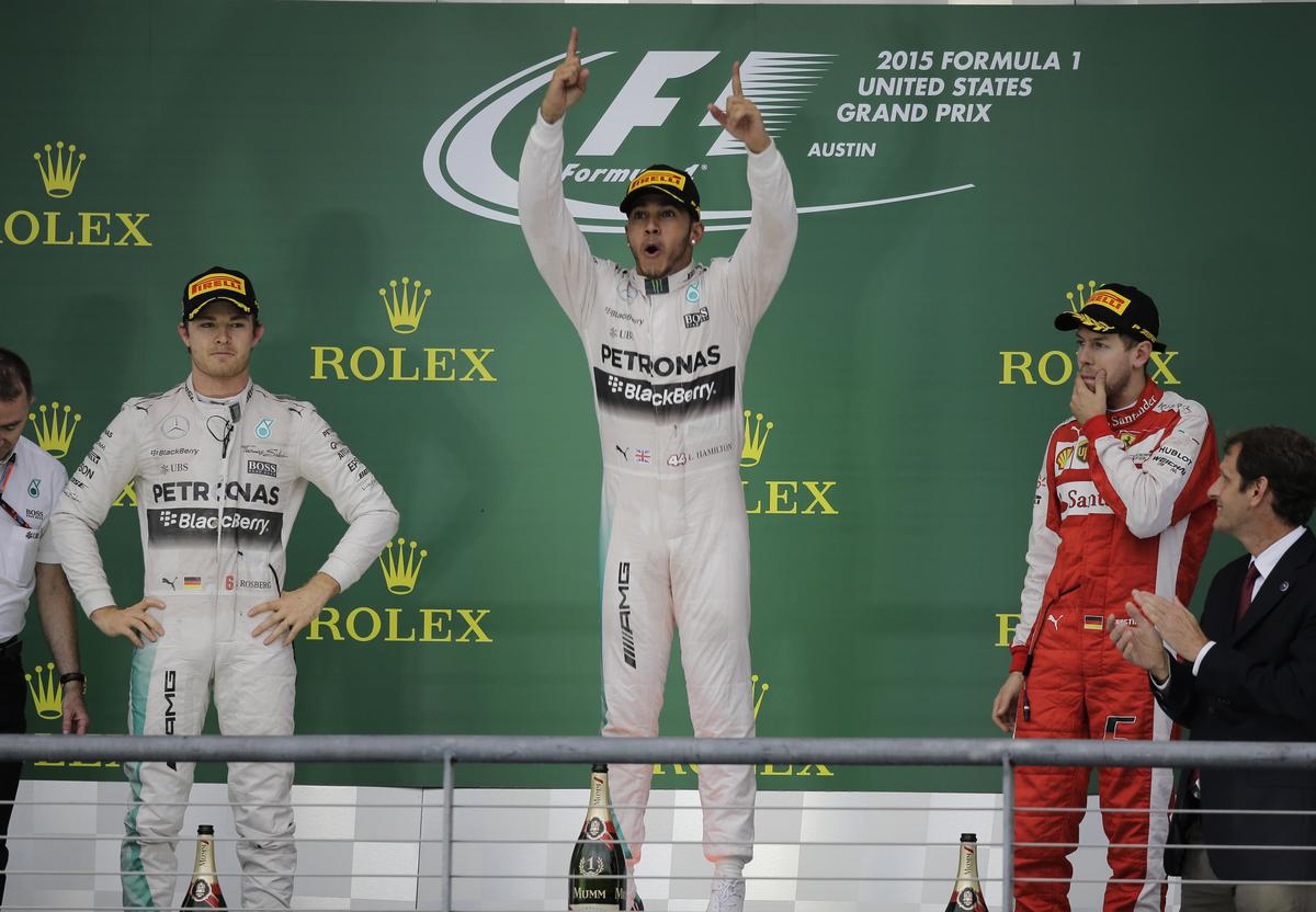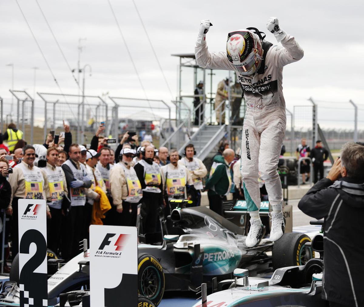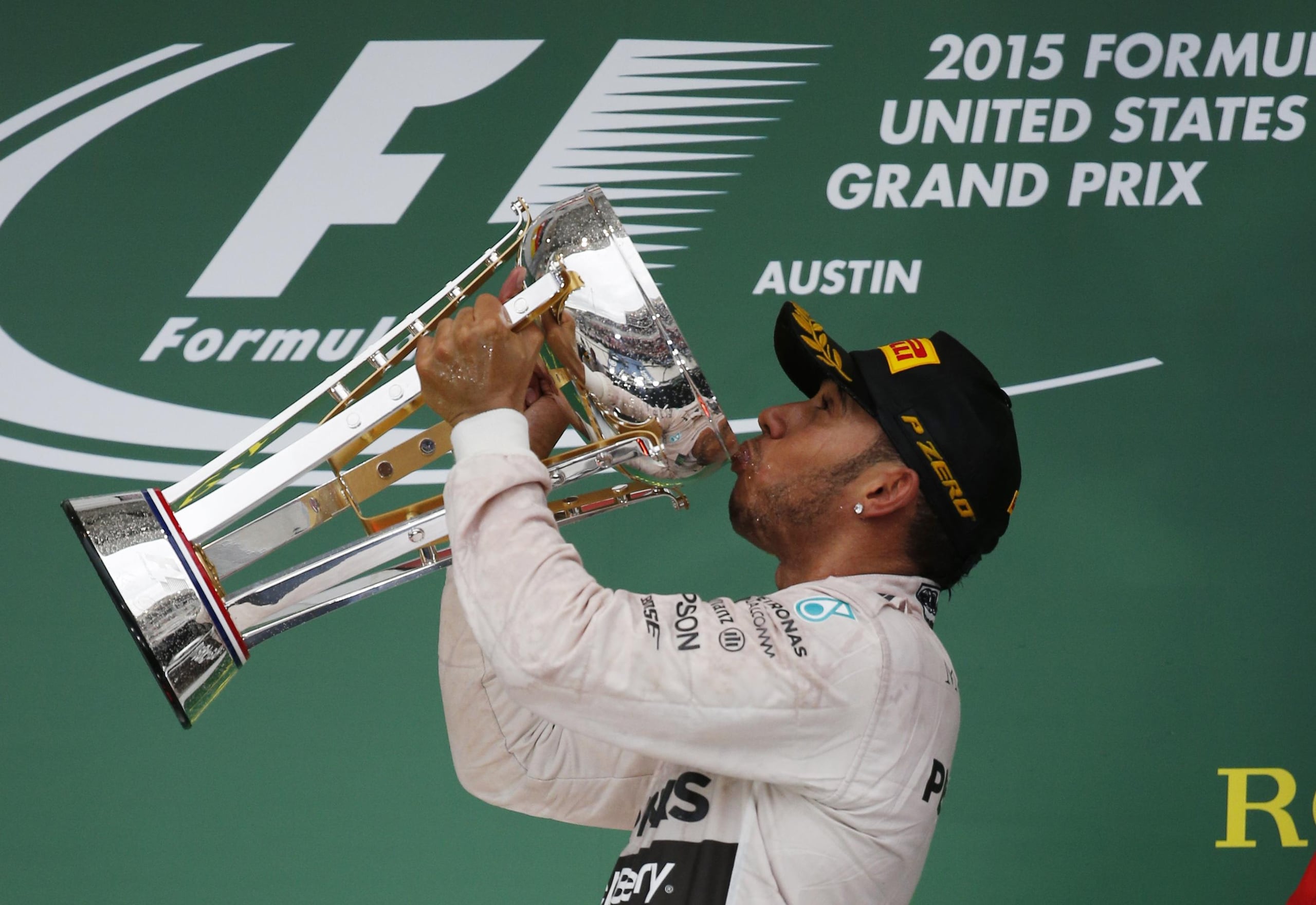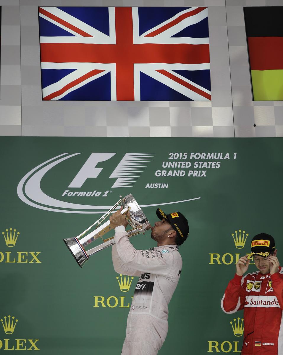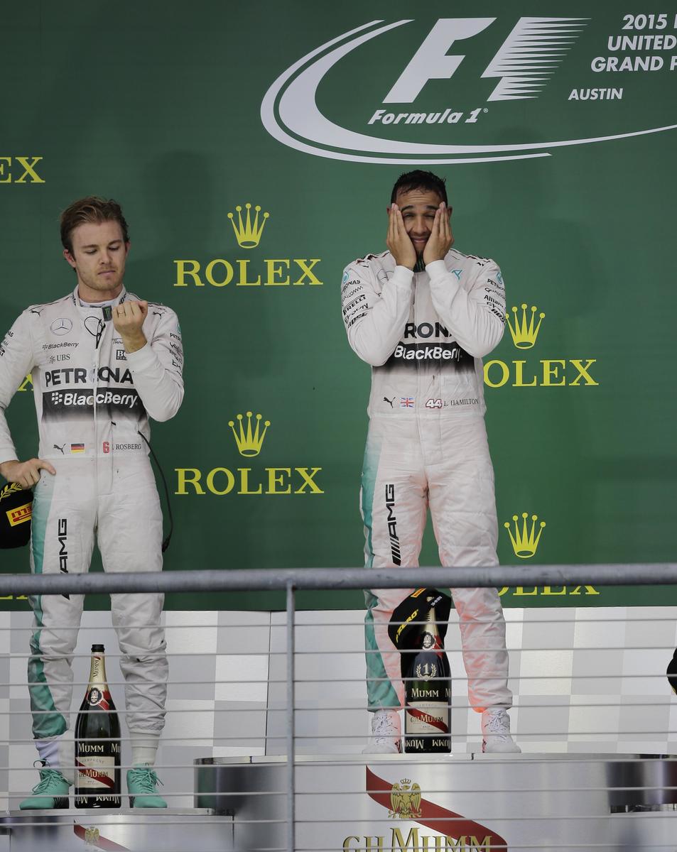 Lewis Hamilton trattiene a stento le lacrime, ma riesce anche a sorridere, dal gradino più alto del podio del Gp degli Usa, che gli ha regalato il terzo titolo consecutivo