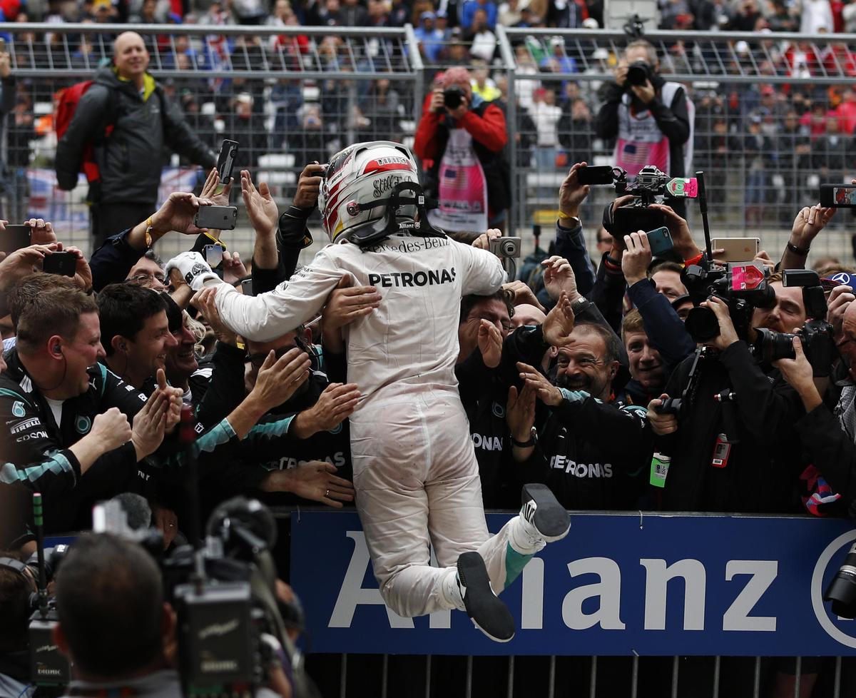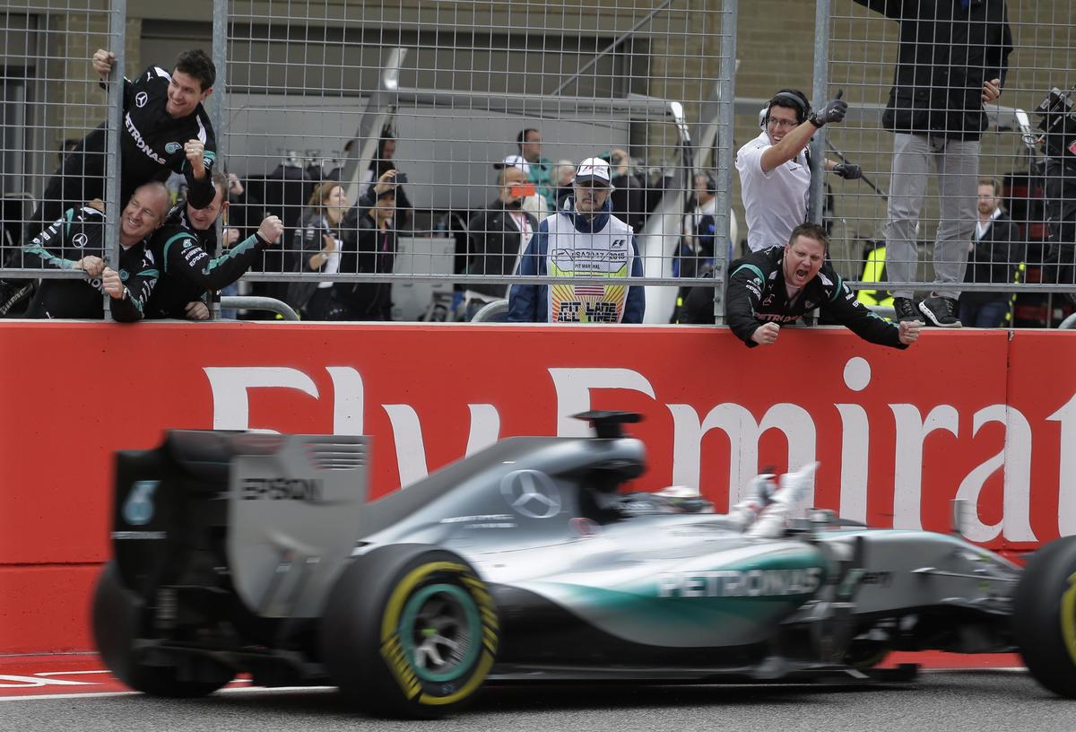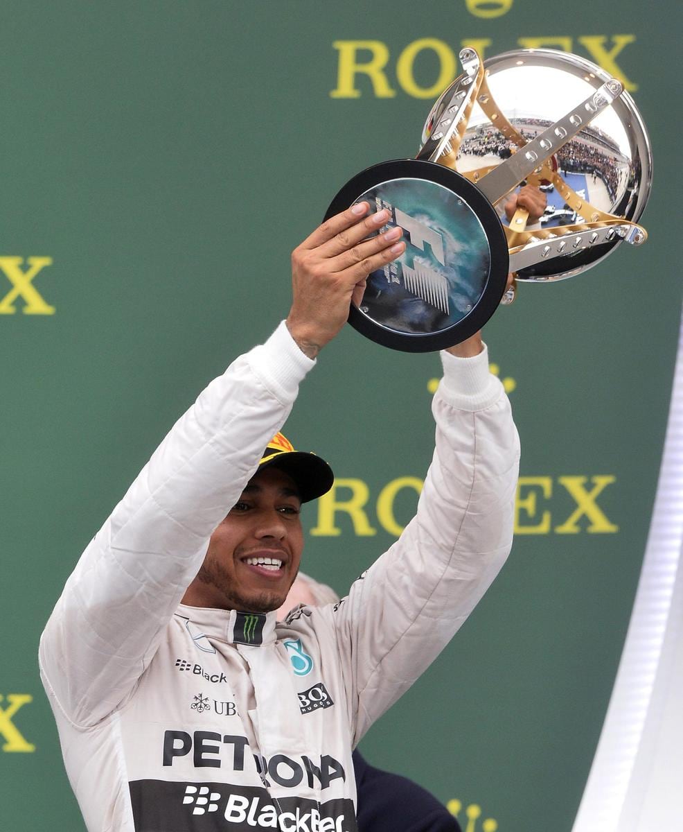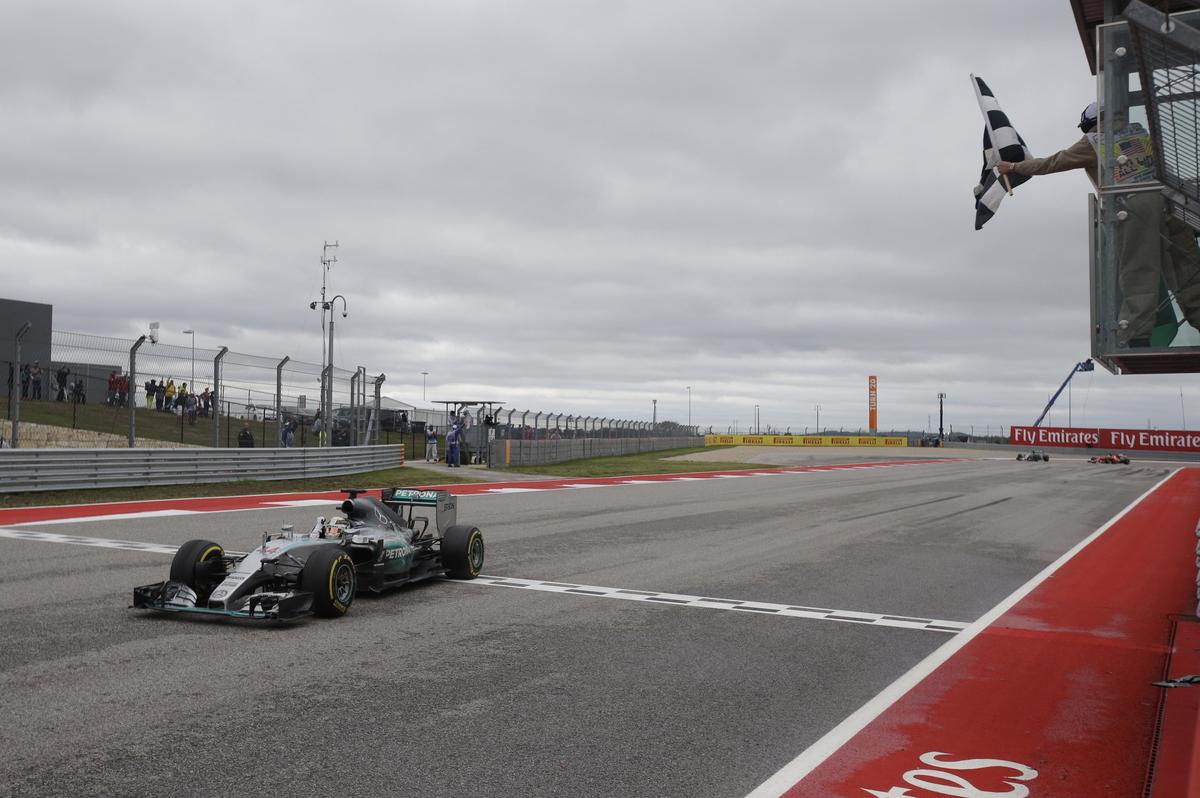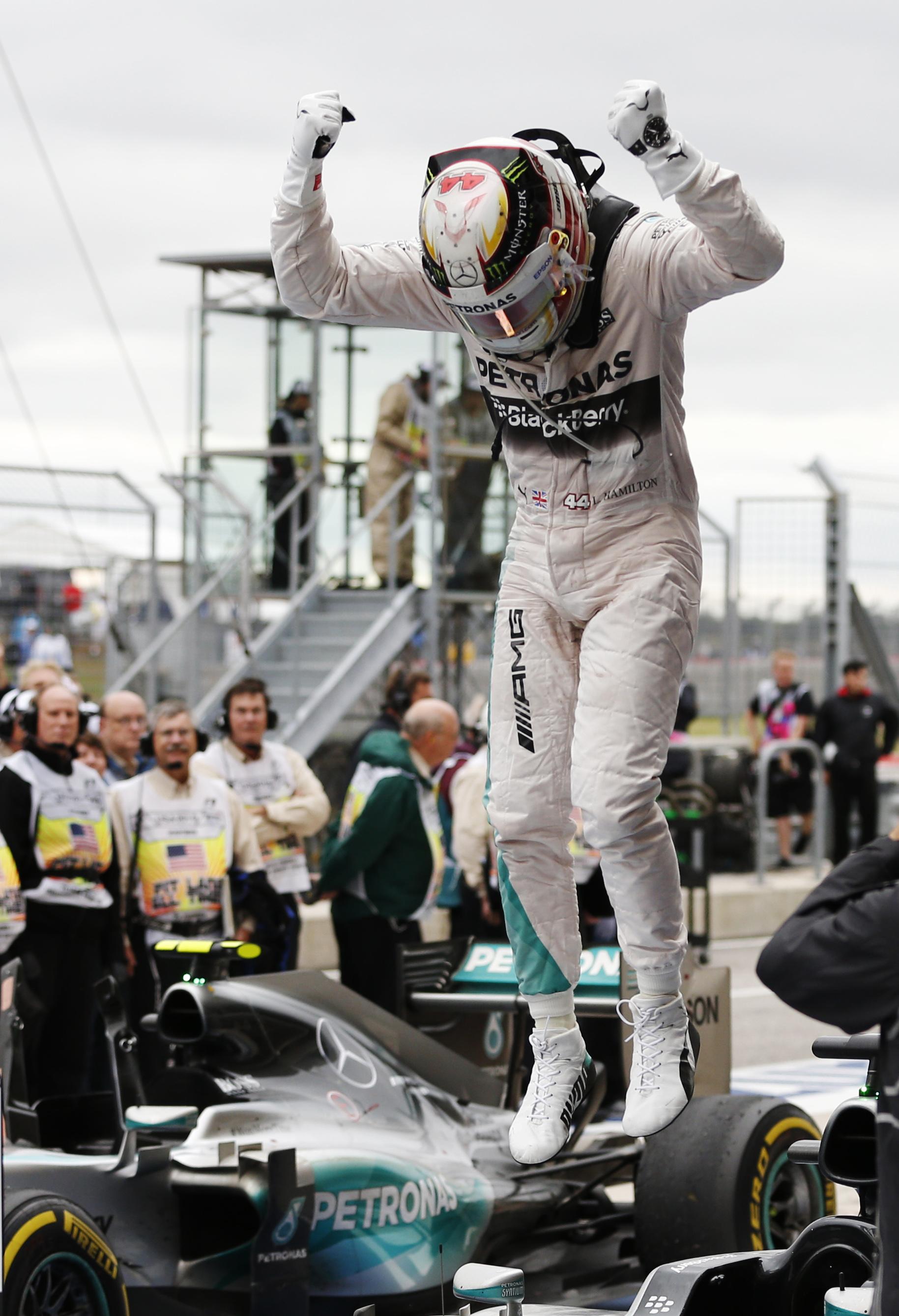 Lewis Hamilton trattiene a stento le lacrime, ma riesce anche a sorridere, dal gradino più alto del podio del Gp degli Usa, che gli ha regalato il terzo titolo consecutivo
