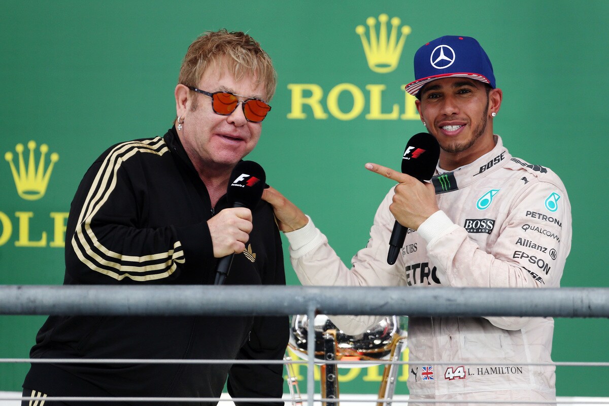Hamilton campione del mondo si commuove sul podio con Elton John