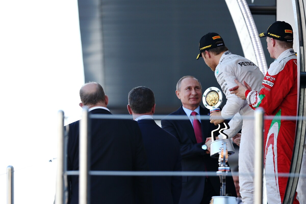 Il premier russo alla premiazione del Gp di Mosca. Nell'anticamera verso il podio, Putin incontra lo sguardo del pilota finlandese. I due si parlano e il ferrarista trova miracolosamente il sorriso...