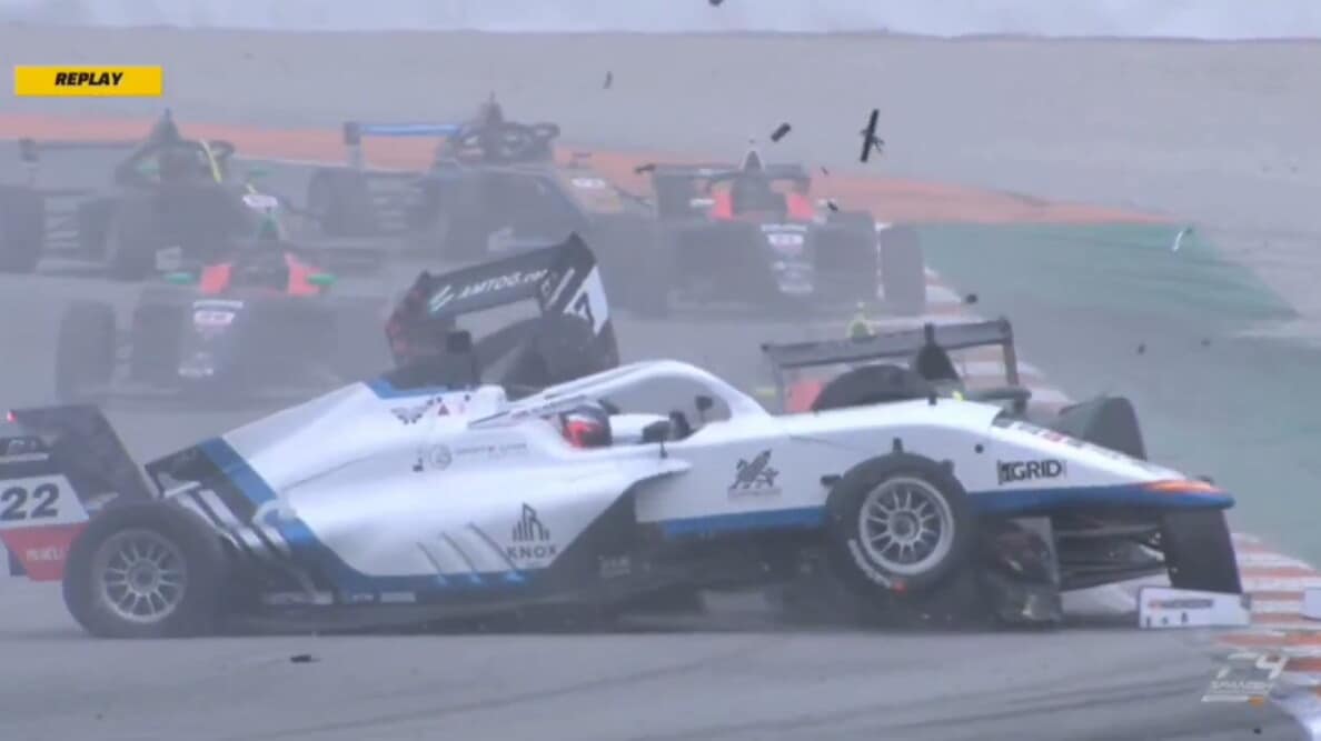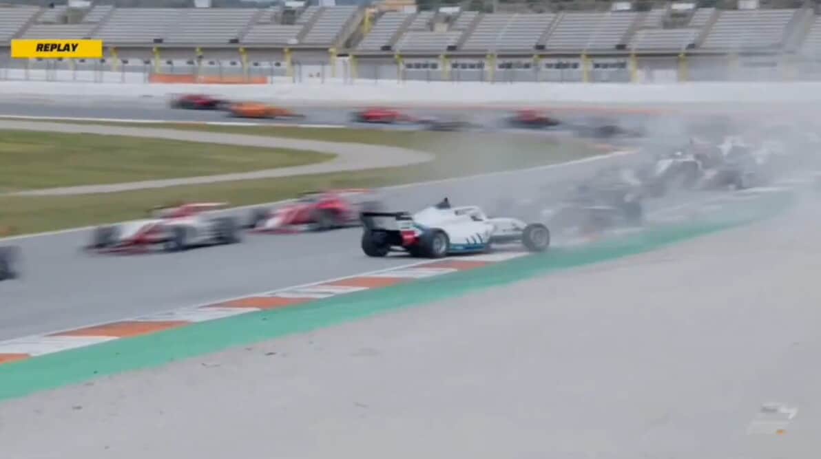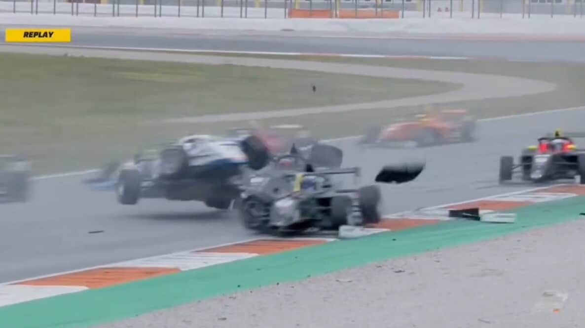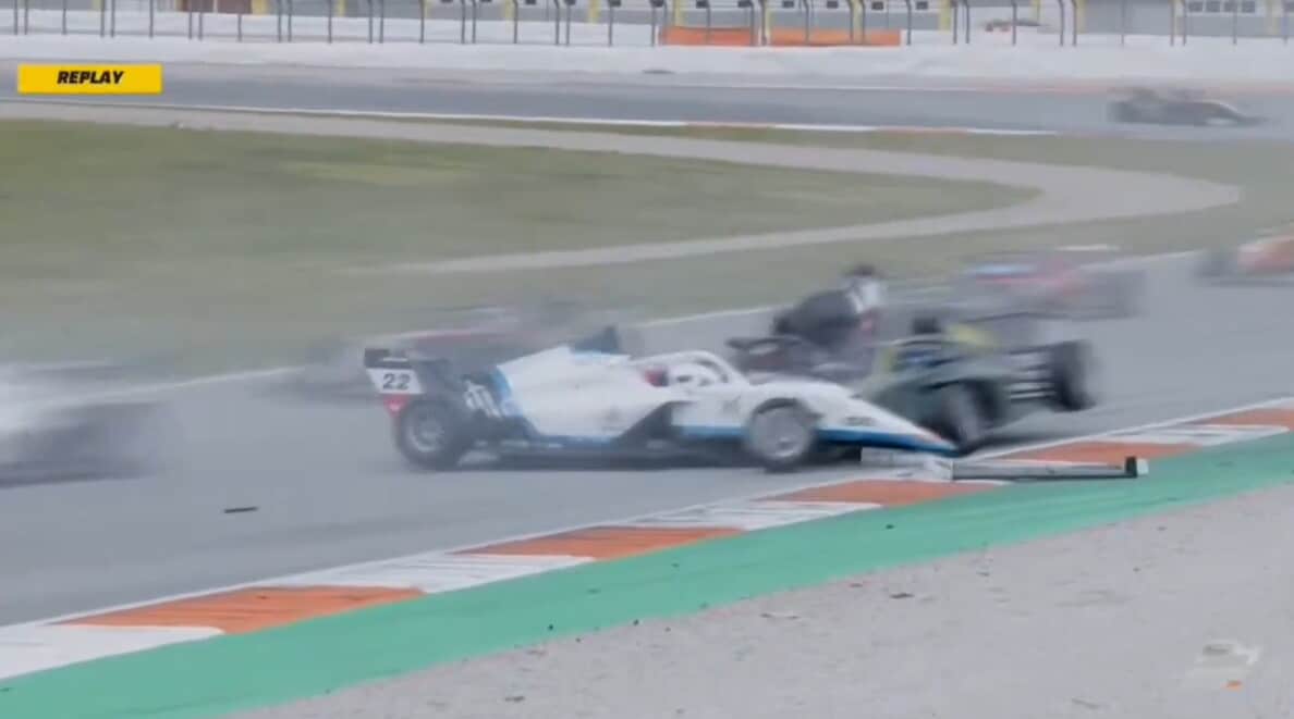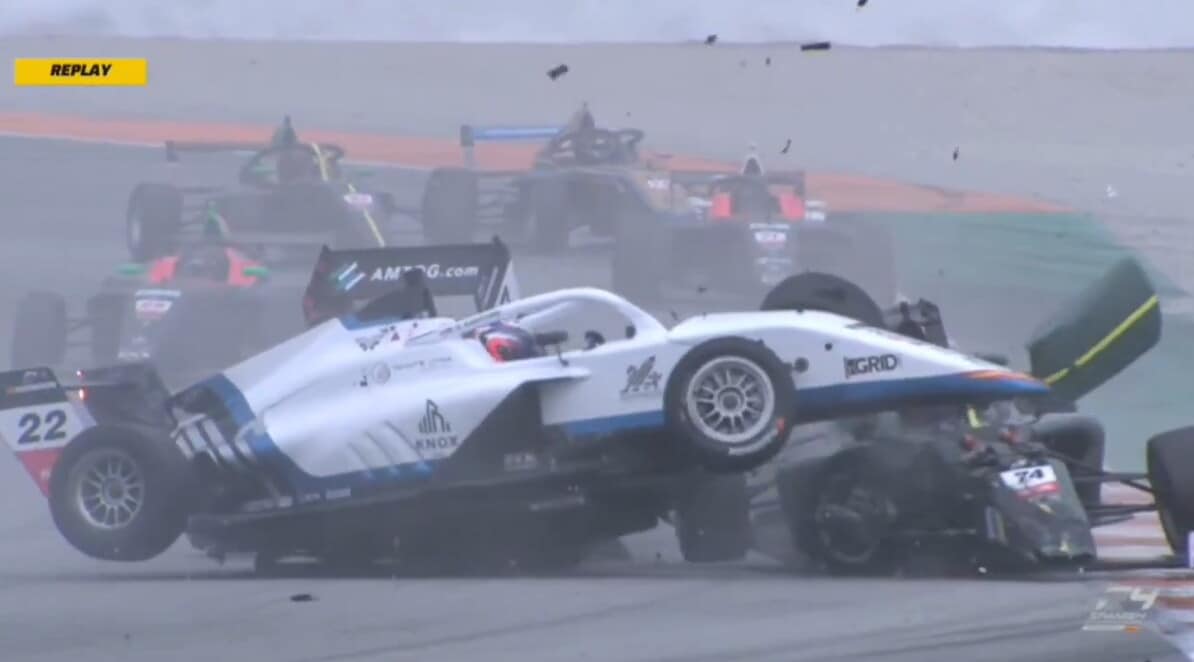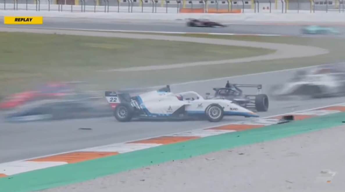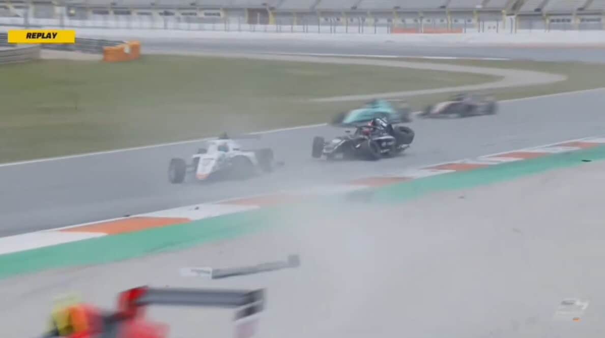 Le immagini dalla F4 spagnola, con la gara sul circuito di Valencia che è stata subito sospesa con bandiera rossa: l'impatto è durissimo ma i piloti, fortunatamente, stanno bene