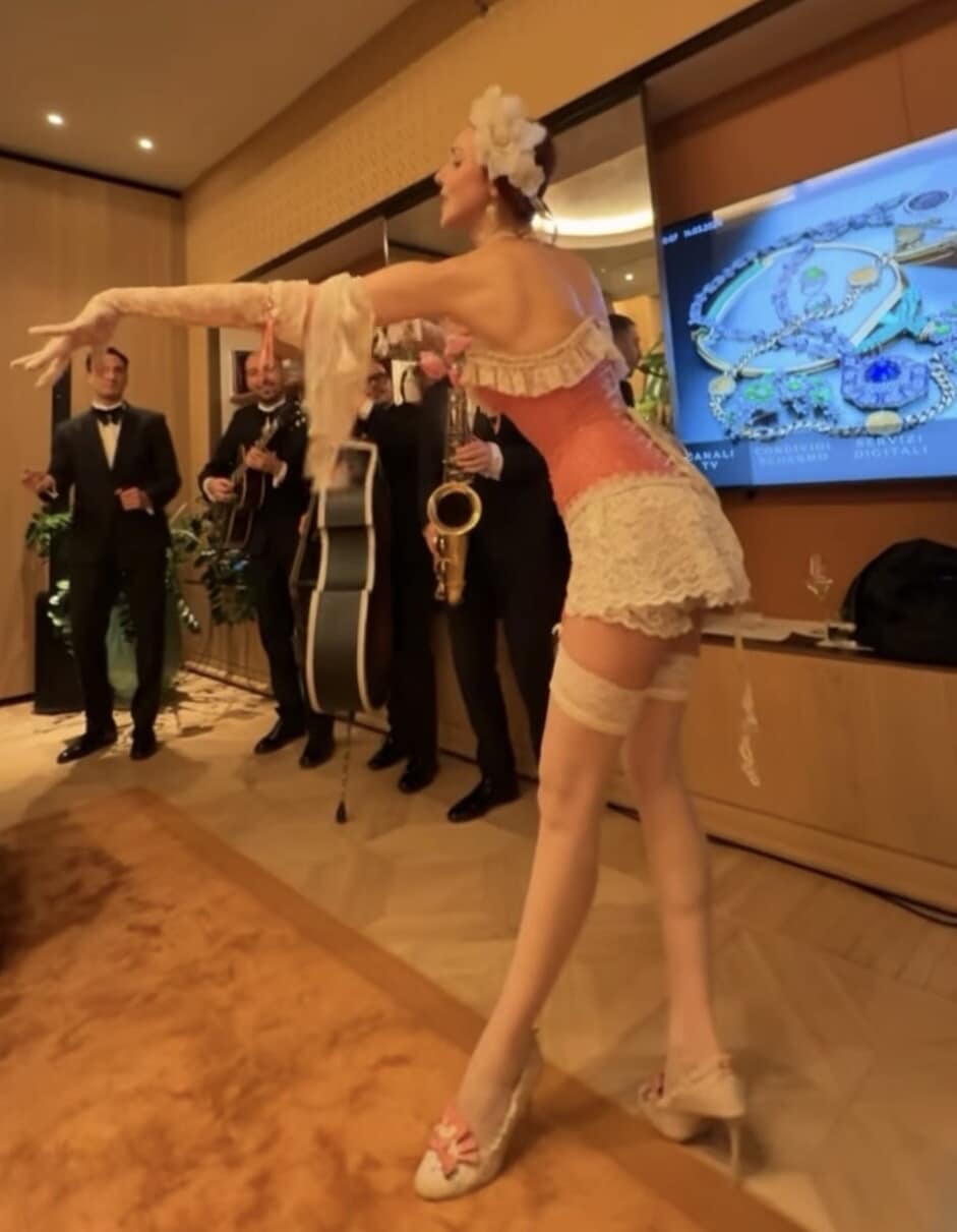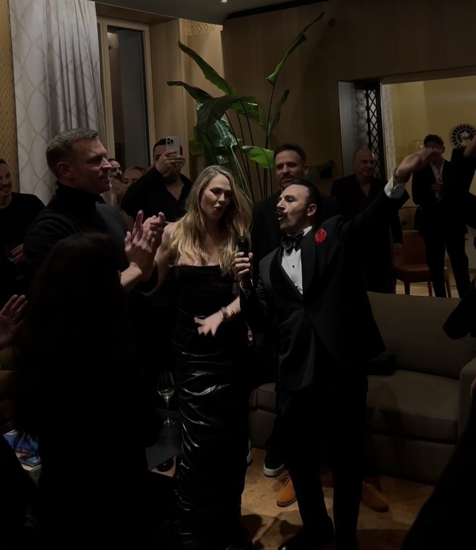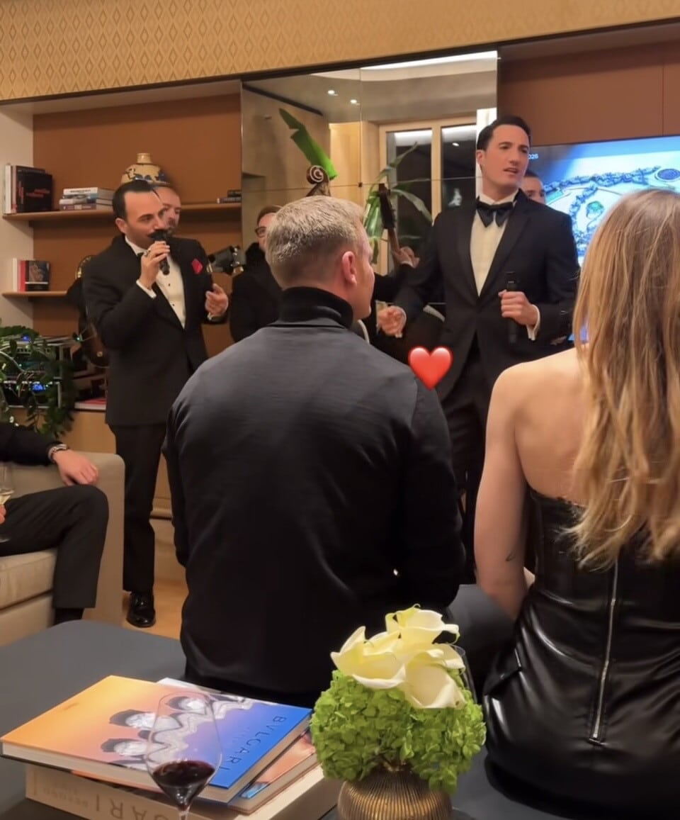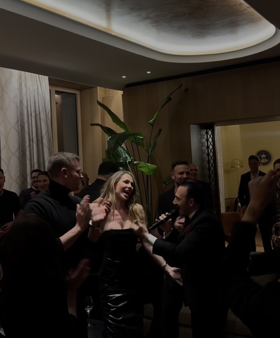 All'Hotel Bulgari di Roma la conduttrice ha festeggiato il futuro marito: con lei i figli, la nuora, i parenti e tanti amici
