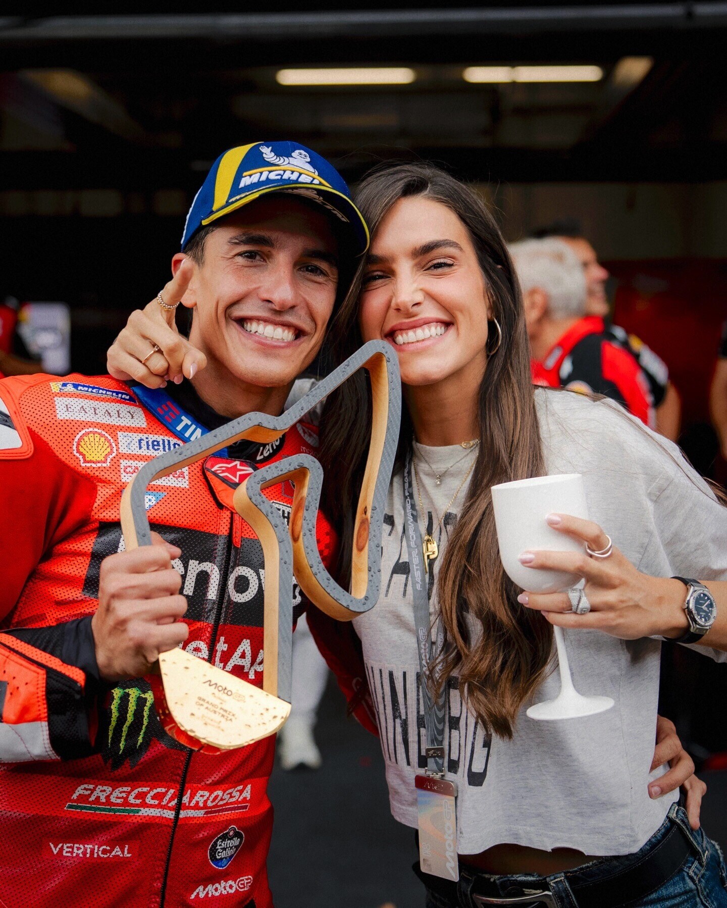 La fidanzata del pilota spagnolo festeggia il nono titolo mondiale in carriera vinto dal campione di Cervera: tutte le foto