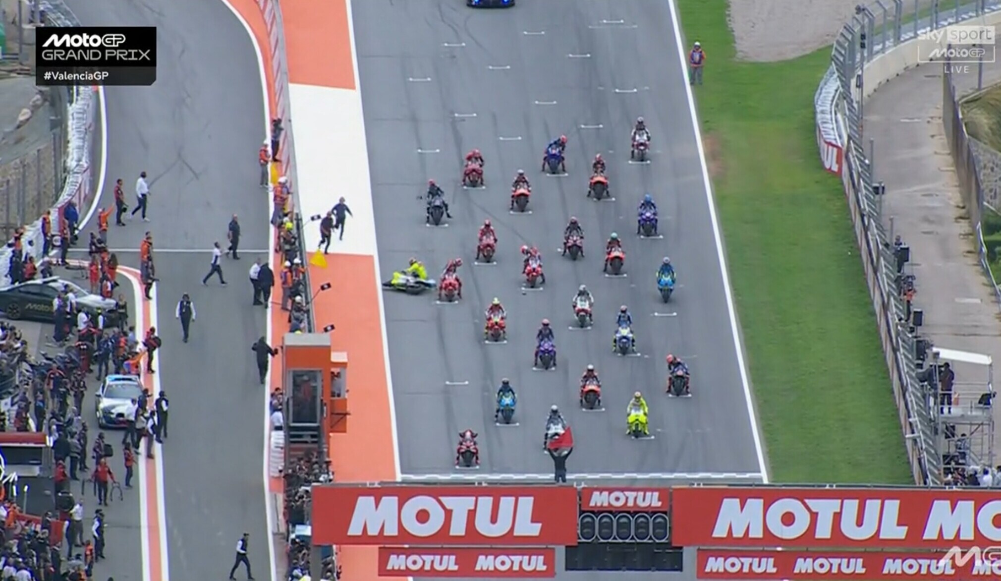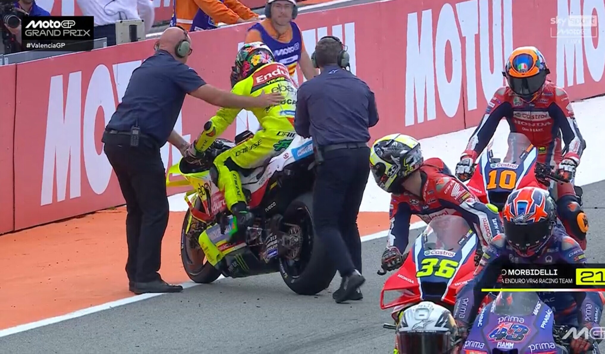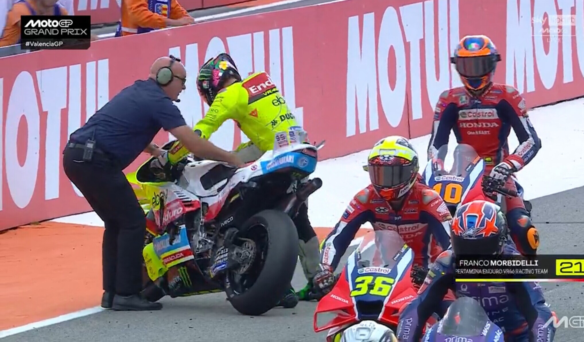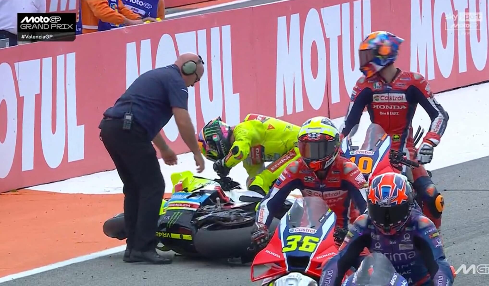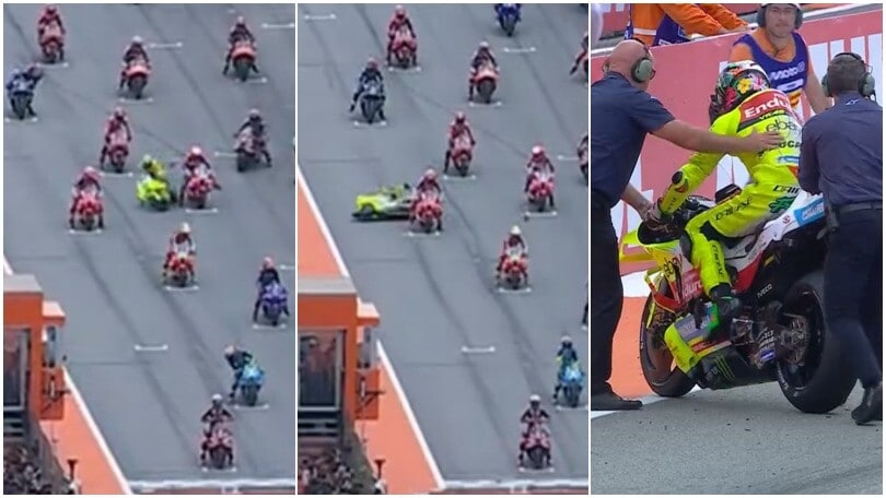 Il pilota della VR46 prima della partenza va a sbattere contro la moto dello spagnolo: è stato poi costretto ad andare nell'infermiera mobile per un infortunio alla mano