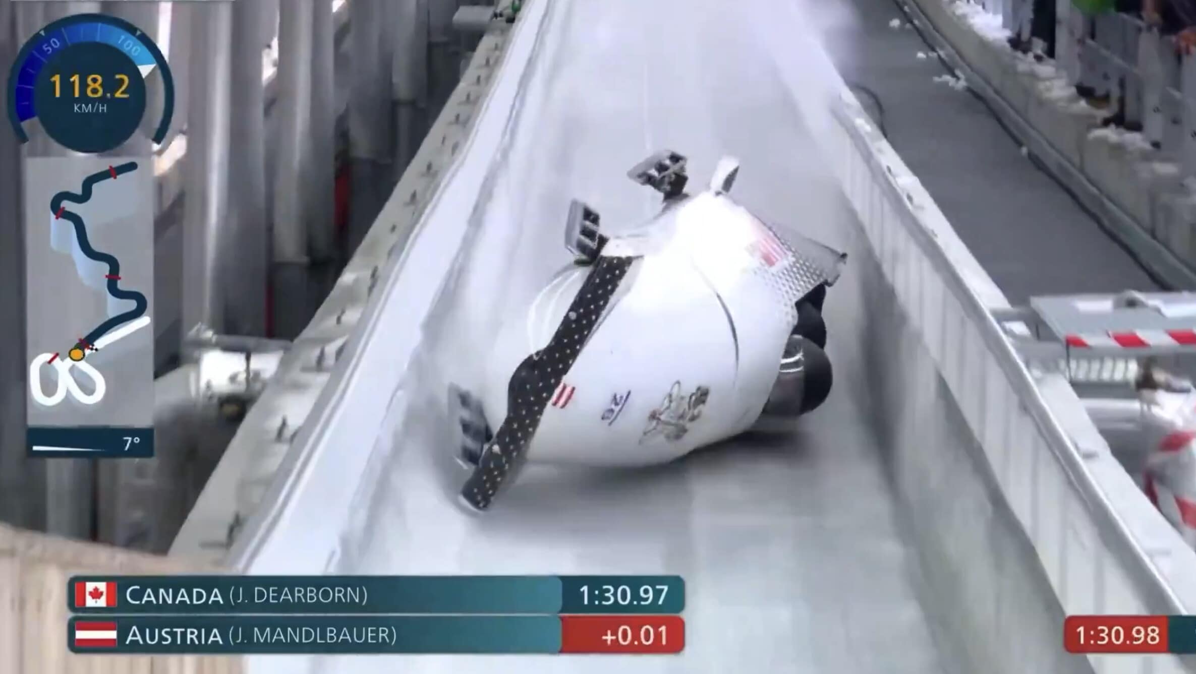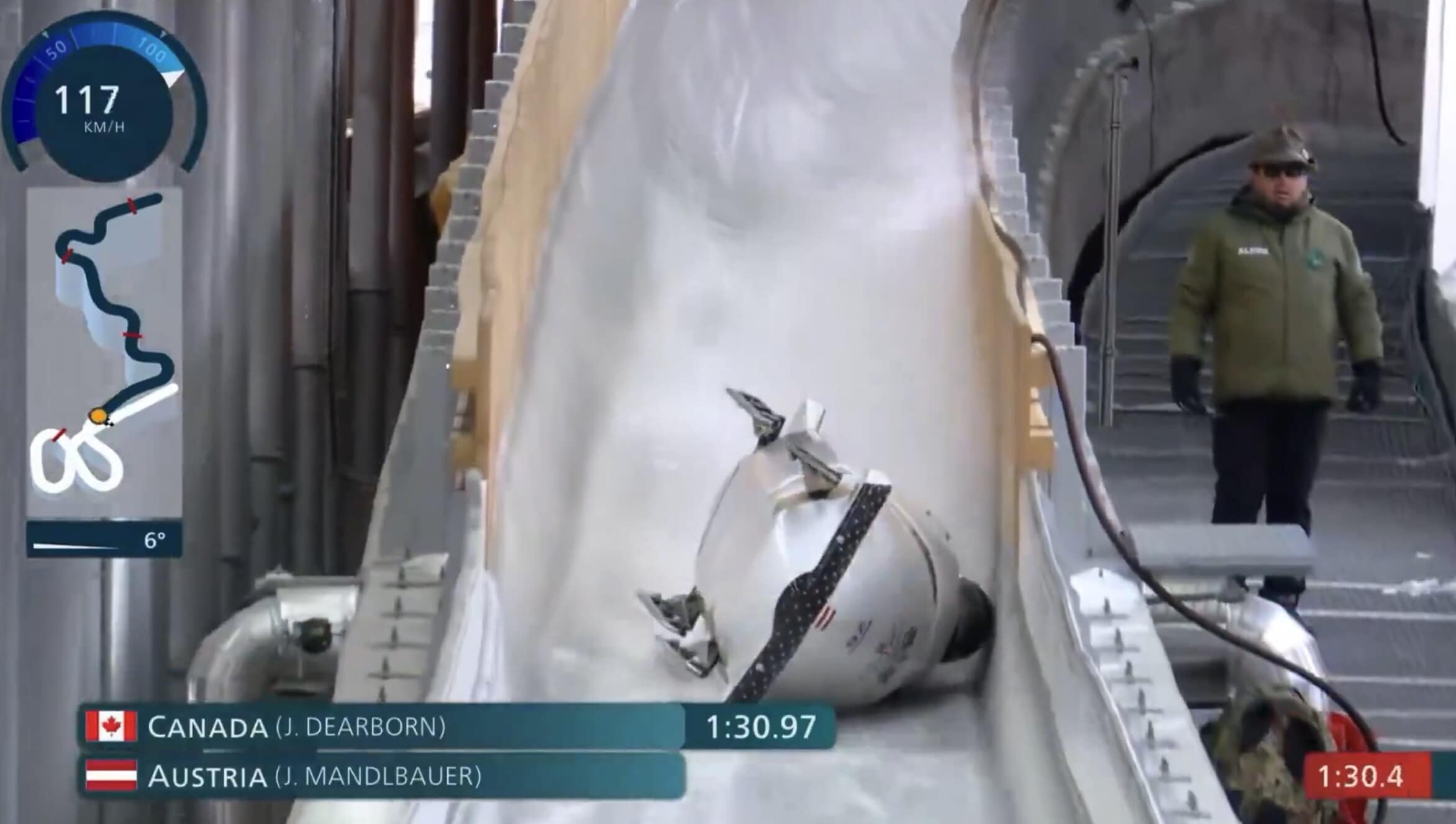 Incidente per il team Austria nella seconda manche del bob a quattro ai Giochi Olimpici Invernali di Milano-Cortina 2026. Il team si è completamente ribaltato all'arrivo e sono rimasti coinvolti i quattro atleti Jakob Mandlbauer, Daniel Bertschler, Sebastian Mitterer e Daiyehan Nichols-Bardi. In tre si sono rialzati senza problemi, mentre è stato soccorso Mandlbauer, sempre rimasto coscente e in grado di muovere testa e corpo, e poi trasportato in ospedale per ulteriori controlli. Poco dopo la gara è stata fermata nuovamente per il ribaltamento dell'equipaggio della Francia, i quattro si sono alzati autonomamente e diretti a piedi in zona d'arrivo, e di Trinidad e Tobago, che non è arrivato al traguardo e per fortuna gli atleti non hanno riportato conseguenze
