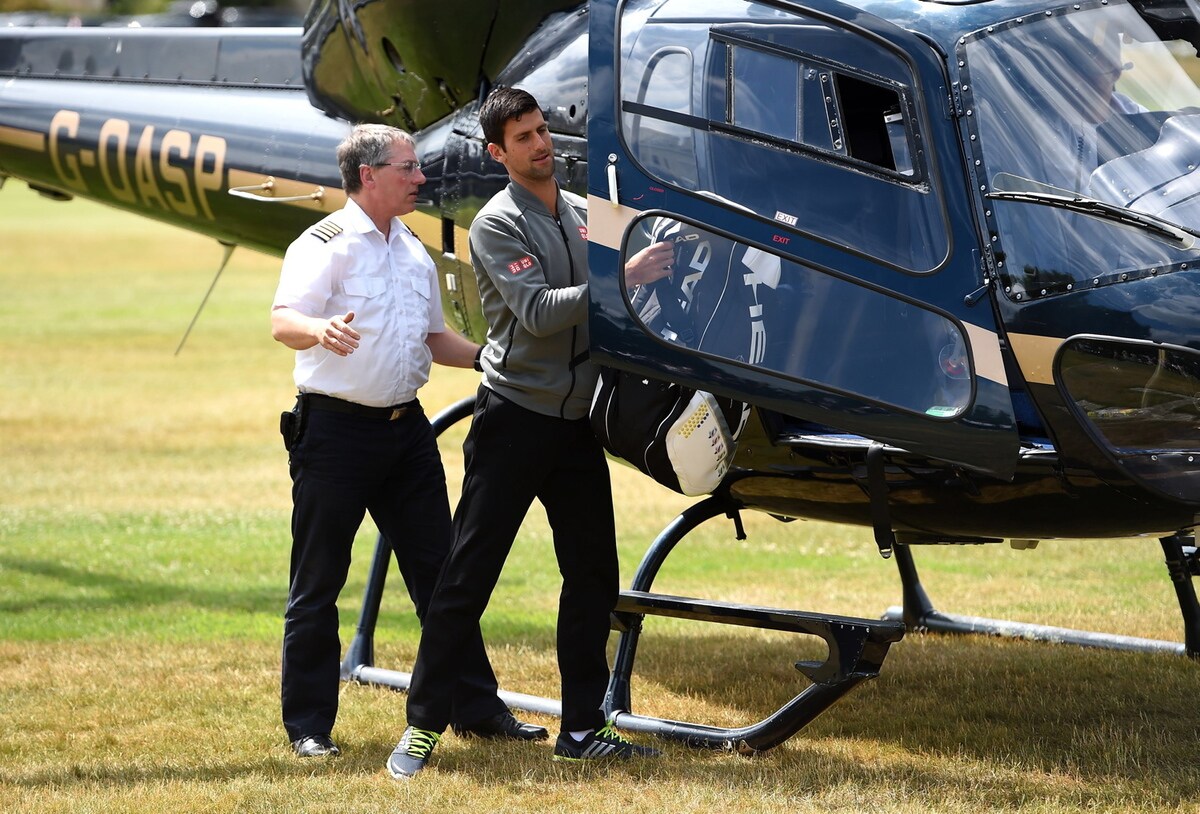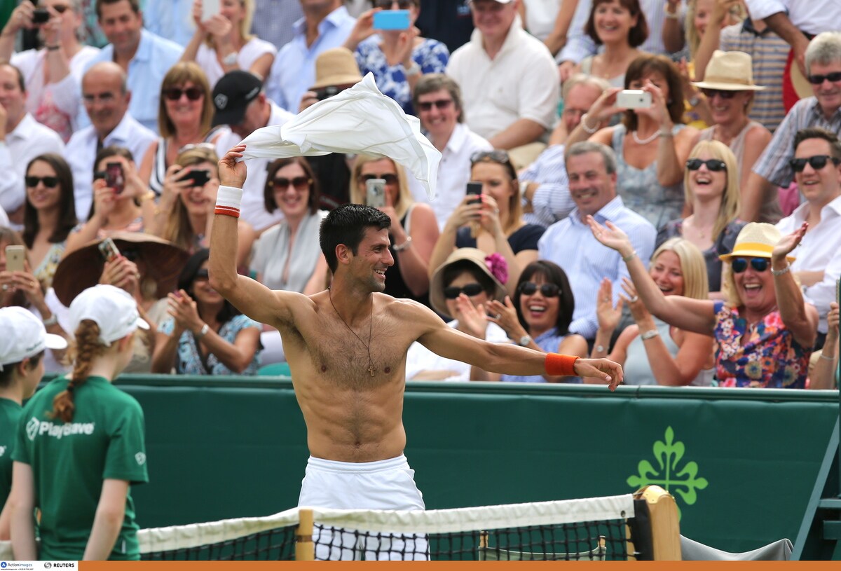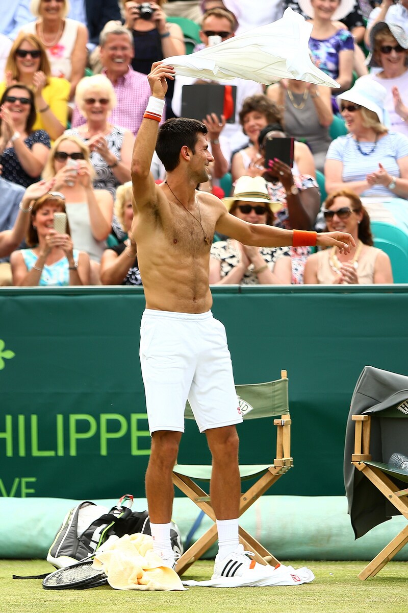 Il tennista serbo arriva in elicottero al Boodles Tennis Challenge, un torneo di esibizione che si svolge in Inghilterra. Durante il match concede al pubblico un piccolo "spogliarello", lancia la maglia ad una esuberante fan e poi la bacia sugli spalti