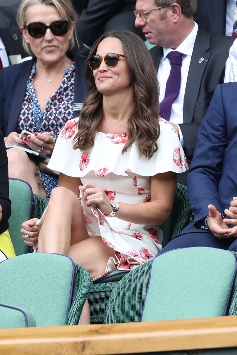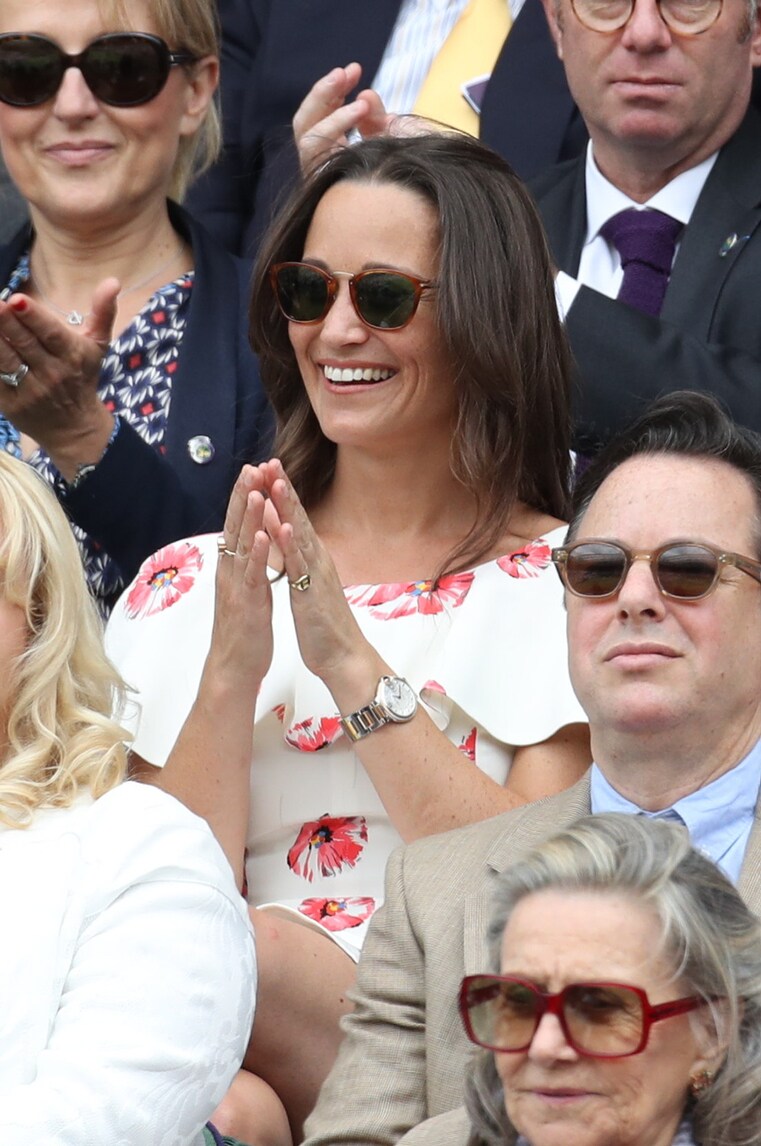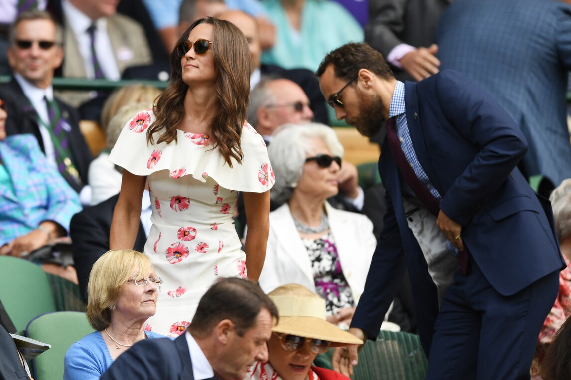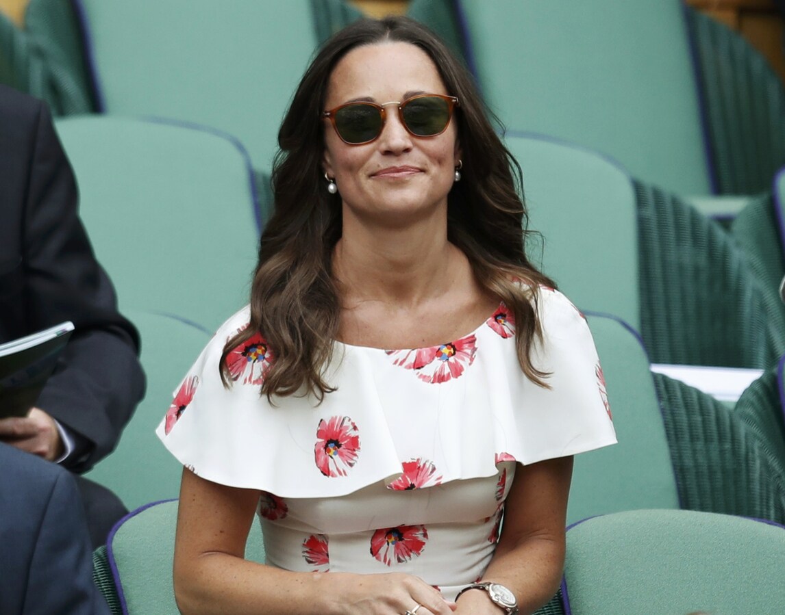 Ecco la sorella di Kate, duchessa di Cambridge e moglie del principe William, in tribuna al torneo di Tennis in abito bianco e rosso mentre accavalla le gambe...
