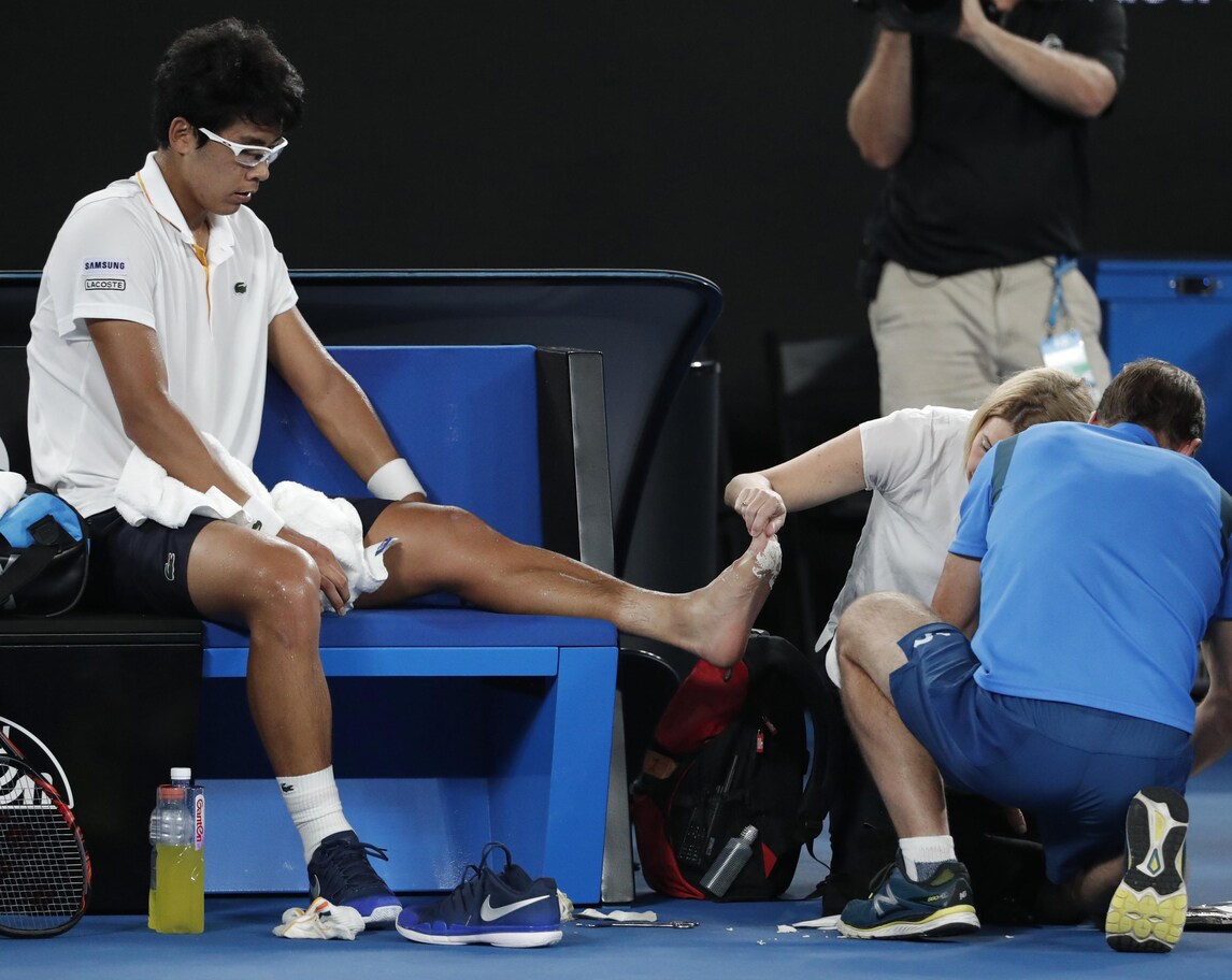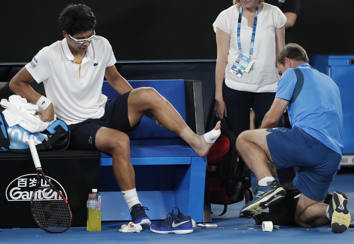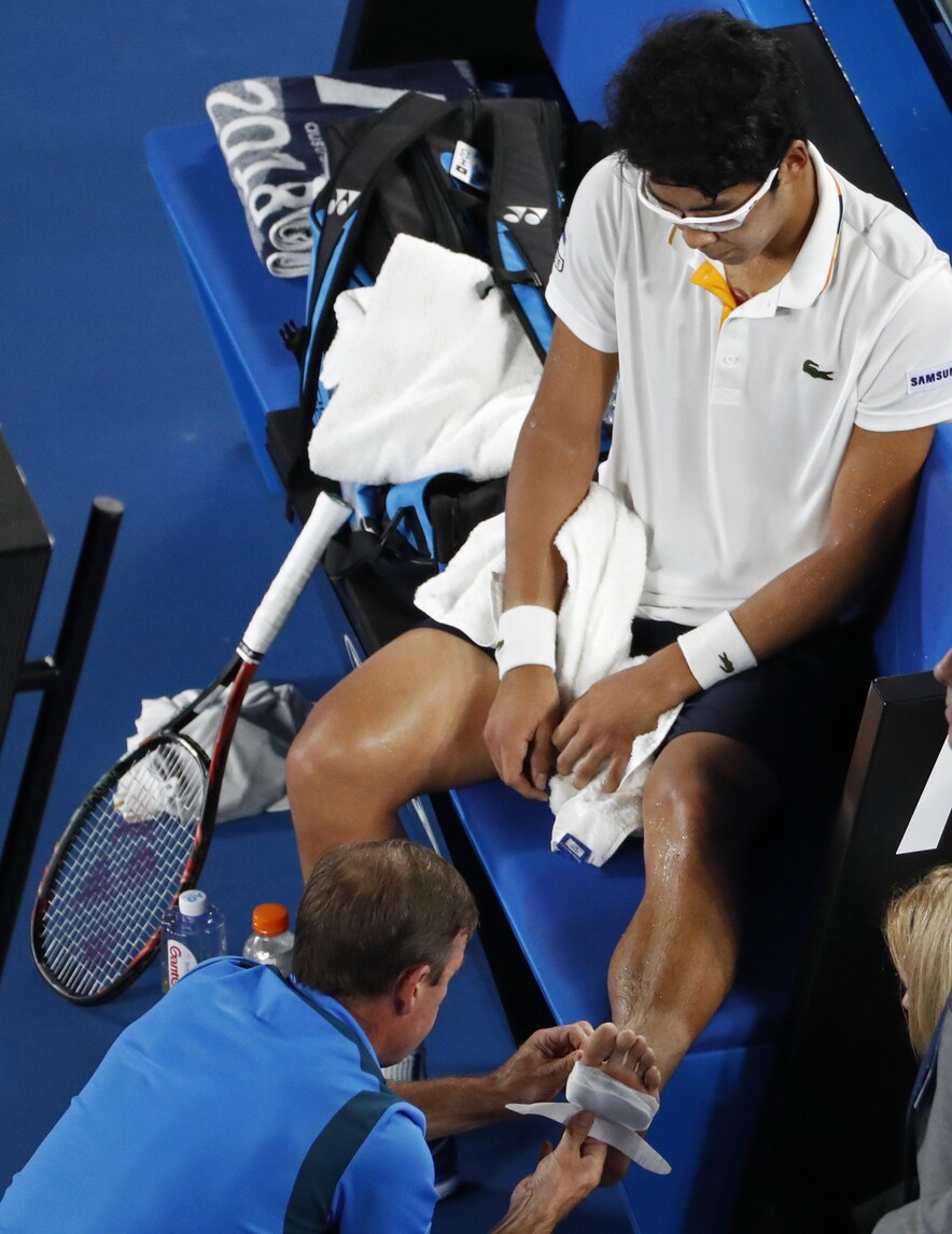 La rivelazione del torneo non supera l'esame Federer. Il 21enne sul 6-1 5-2 dichiara bandiera bianca dopo 63 minuti mandando lo svizzero in finale con Cilic. Ritiro causato da dolorose vesciche sotto il piede