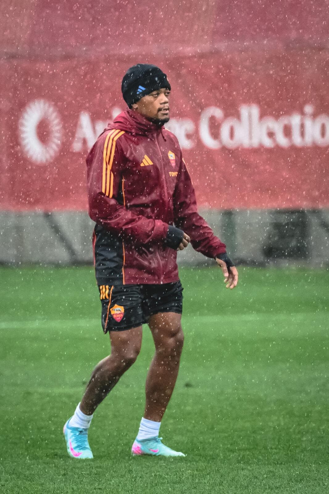 I giallorossi corrono a mille sotto una pioggia battente: il tecnico al centro del campo prova a proteggersi come può