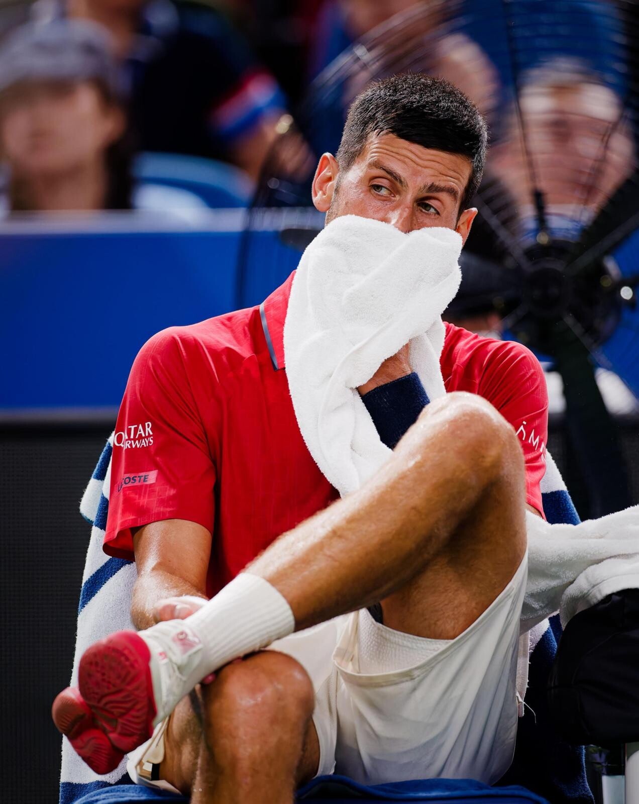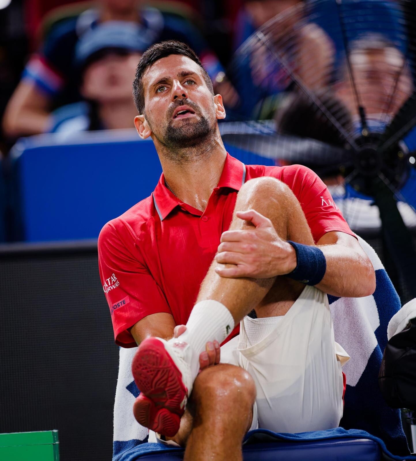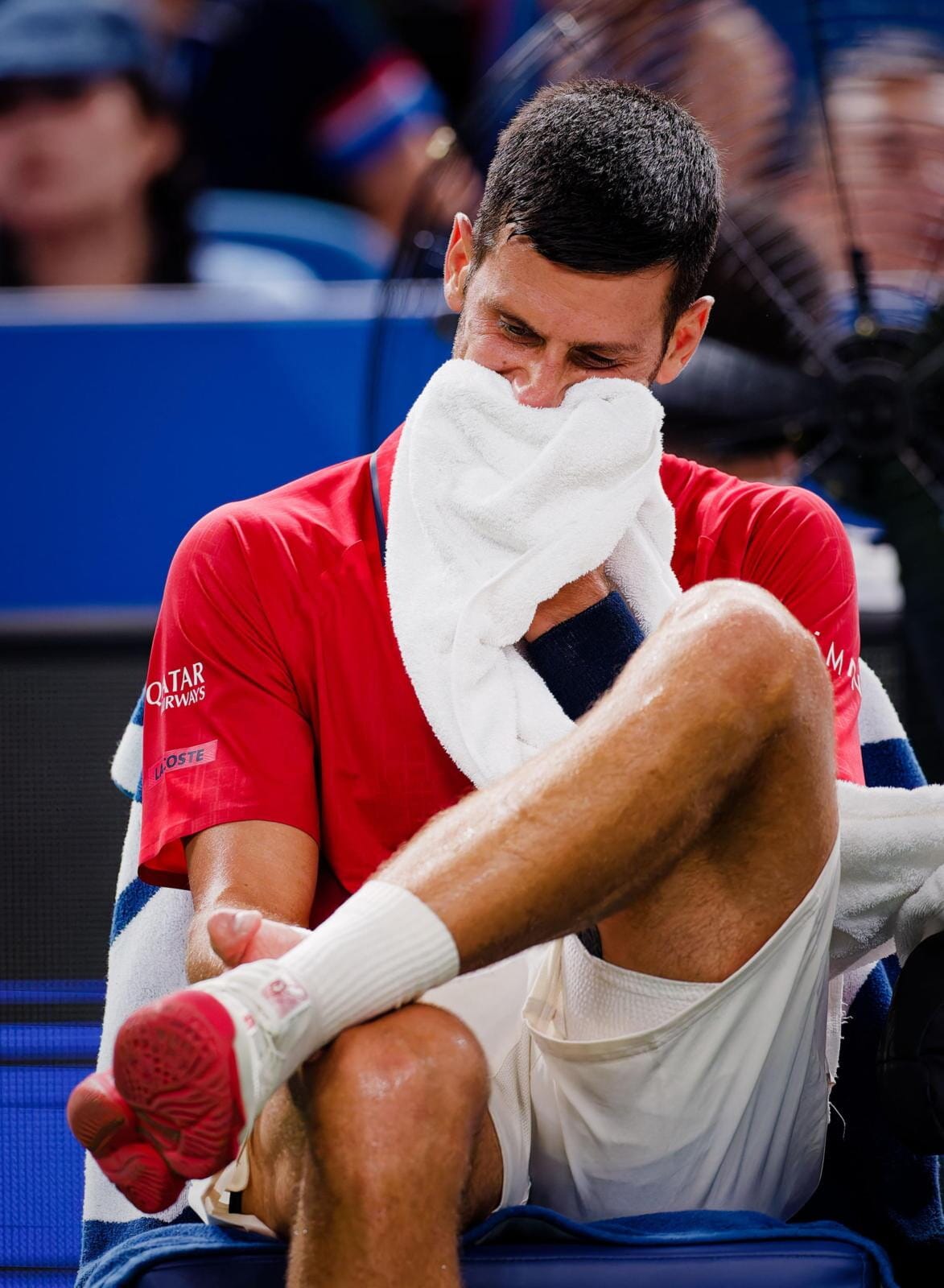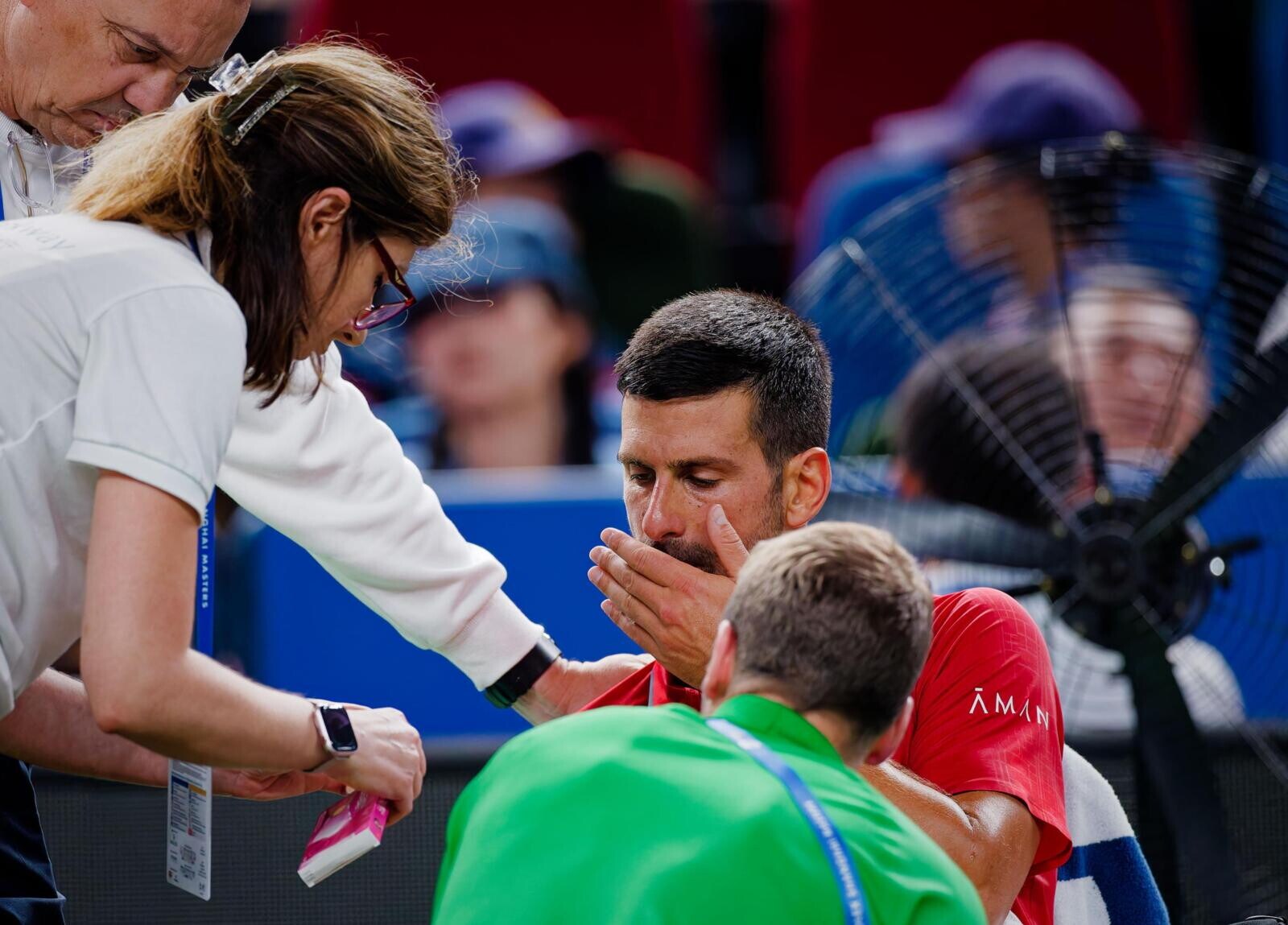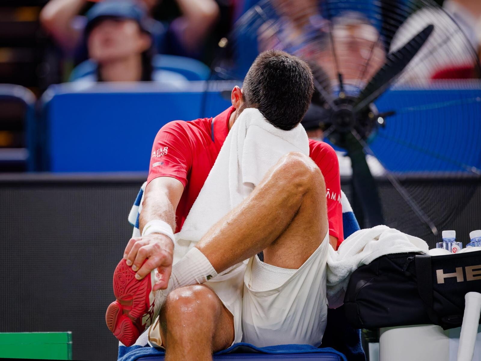 Il tennista serbo alle prese con un dolore al polpaccio e le poche energie per il caldo estremo nel Masters 1000 in Cina giocato in condizioni difficilissime per tutti