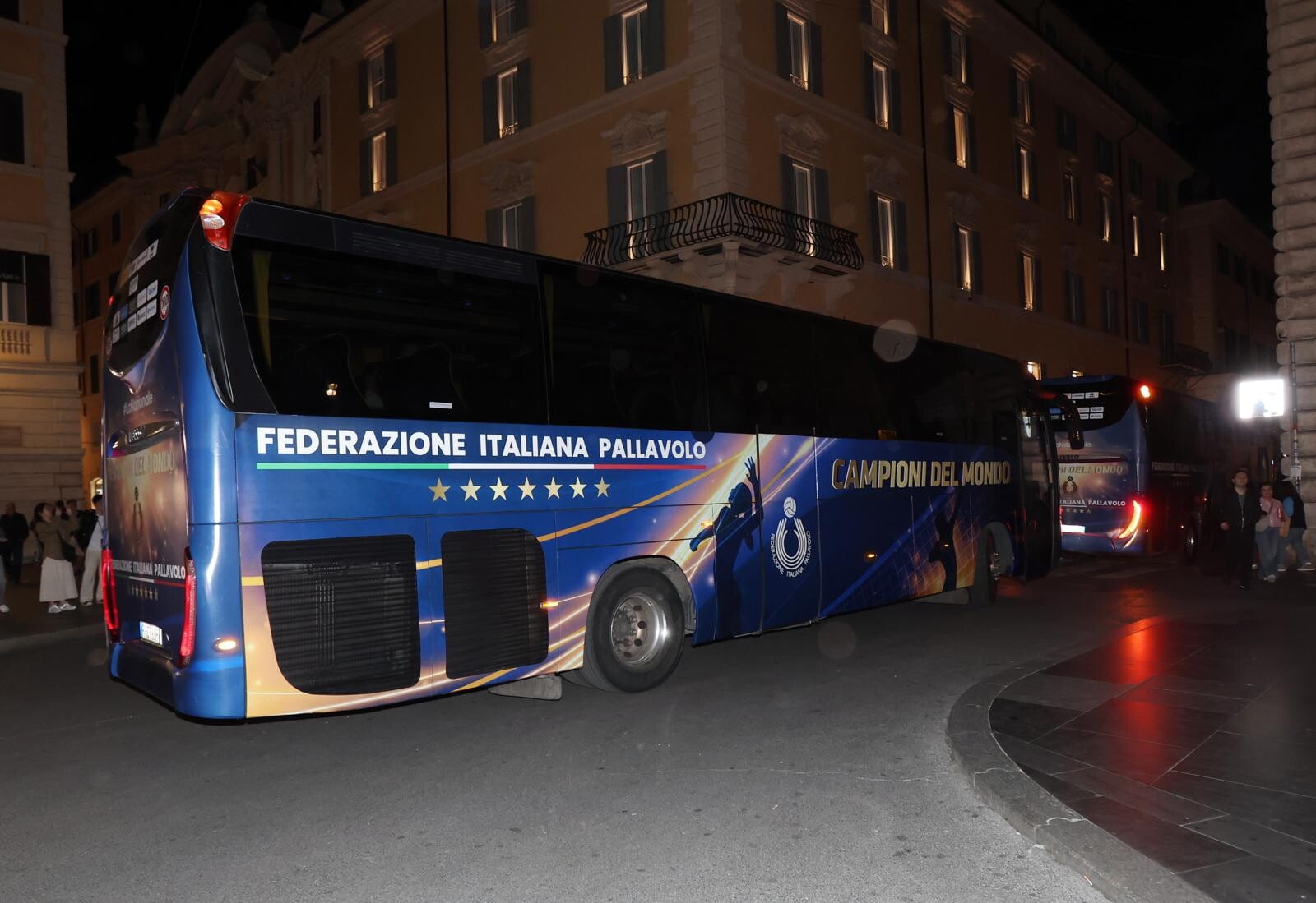 Le squadre di Velasco e di De Giorgi celebrano insieme nella Capitale le rispettive imprese iridate, alla vigilia della doppia visita al Quirinale e a Palazzo Chigi