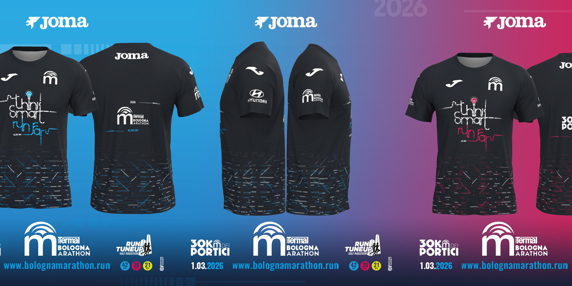 BOLOGNA - Si alza finalmente il sipario sulle maglie ufficiali 2026 della Termal Bologna Marathon, della 30 Km dei Portici e della Run Tune Up Half Marathon: tre T-shirt pronte a far correre i migliaia di runner attesi da ogni parte del mondo con il claim di quest’anno, THINK SMART, RUN FAR.