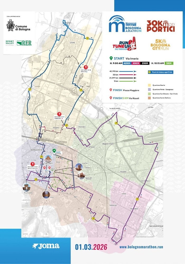 Quasi 9mila i runner iscritti alla Termal Bologna Marathon, alla 30 Km dei Portici e alla Run Tune Up Half Marathon quale sarà il percorso lungo il quale, domenica 1 marzo, potranno respirare la bellezza di Bologna. Un tracciato che unisce velocità e scorrevolezza, caratteristiche amate da tanti atleti a caccia di prestazione, ad una profonda identità, permettendo di addentrarsi nell’anima di Bologna, chilometro dopo chilometro.