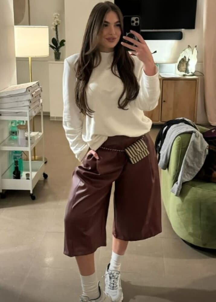 Al Grande Fratello Vip Chanel Totti ha sfoggiato un look sporty chic. Una silhouette costruita su contrasti intelligenti: sopra, una maglia chiara, morbida e pulita, che accarezza il corpo con discrezione; sotto, un paio di pantaloni in pelle, dal taglio ampio e deciso, che aggiungono carattere e struttura all’insieme. Il punto vita è sottolineato con naturalezza, mentre il piccolo dettaglio della tasca a righe introduce un accento grafico inaspettato, quasi editoriale. Le sneakers spezzano l’eleganza con un twist contemporaneo, rendendo il look immediatamente metropolitano e portabile. I calzini a vista, candidi e volutamente semplici, amplificano quell’estetica effortless che domina le strade delle capitali della moda.