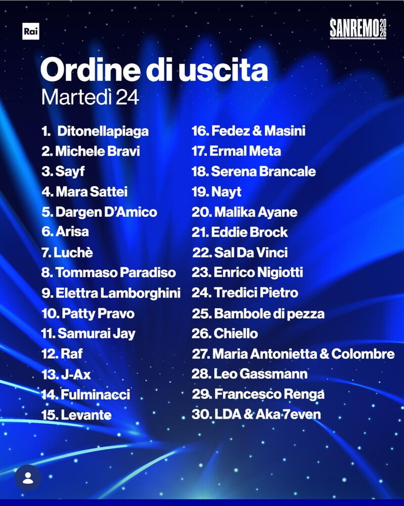 Dopo mesi di attesa e di indiscrezioni, stasera (martedì 24 febbraio) si alza il sipario sul Festival di Sanremo all'Ariston con Carlo Conti e Laura Pausini nel ruolo di conduttori. L'evento sarà trasmesso in diretta televisiva su Rai 1. Nella prima giornata saliranno sul palco, tra cantanti in gara e ospiti speciali, Fedez, Olly, Max Pezzali (sulla nave Costa) e Tiziano Ferro. Tra gli ospiti, come ha annunciato Carlo Conti, anche Kabir Bedi, per un confronto tra Sandokan. La scaletta ufficiale sarà resa nota alle 19 ma si sa che ad aprire la serata sarà Ditonellapiaga. Fedez e Masini esattamente a metà serata, così come Serena Brancale.