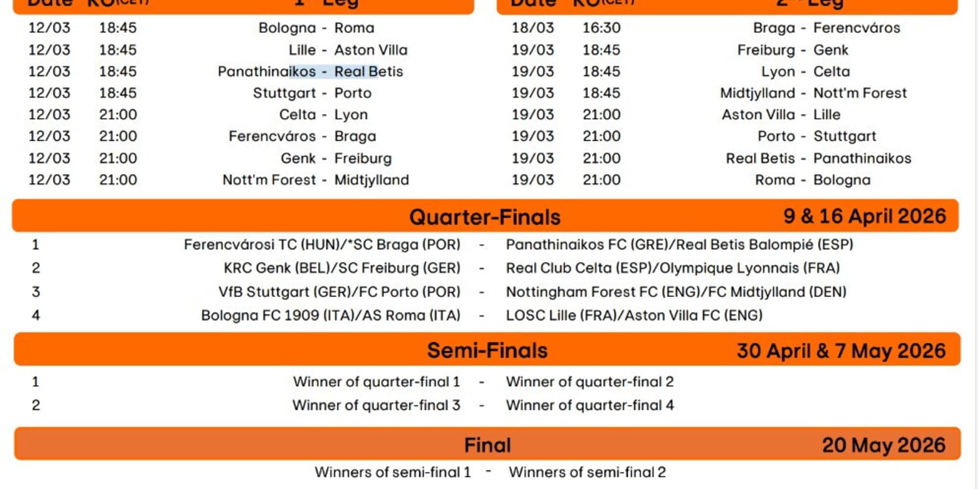 Ottavi di finale: 12 e 19 marzo 2026