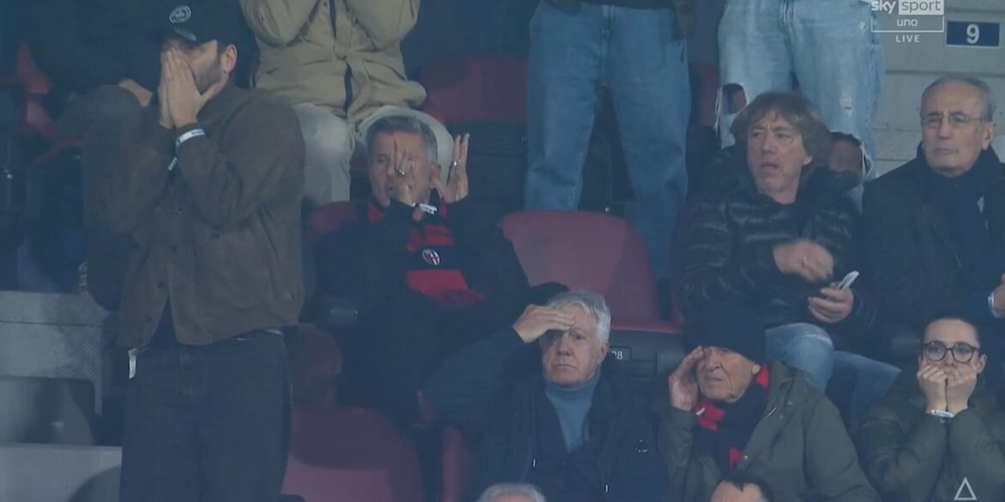 I giocatori del Bologna si caricano e poi fanno il loro ingresso in campo per iniziare il riscaldamento prepartita.