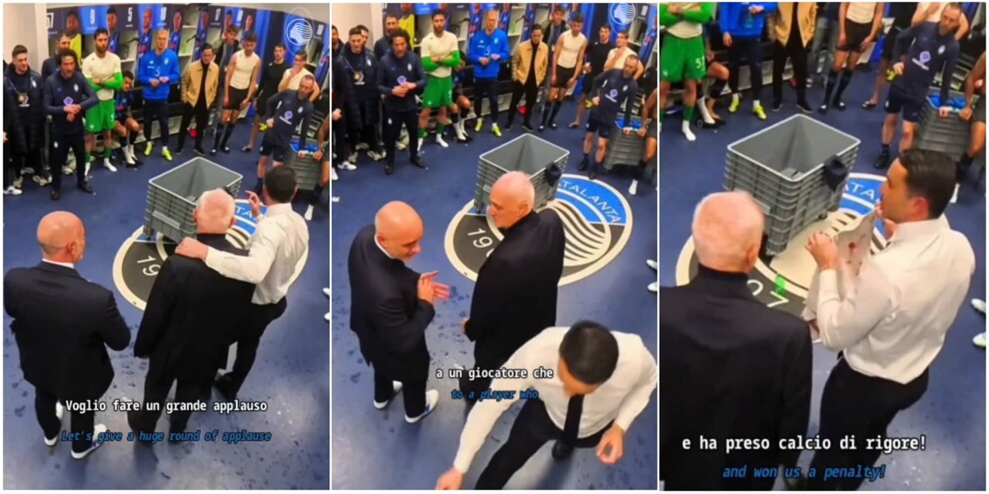"Voglio fare un grande applauso, fatelo voi, a un giocatore, perché, guardate qua, si è buttato sull'ultima palla... A Krstovic, che si è buttato sull'ultima palla e ha preso calcio di rigore", le parole di Palladino. L'allenatore, che aveva accanto il presidente Antonio Percassi e l'amministratore delegato Luca Percassi, nel fare i complimenti all'attaccante montenegrino, ha mostrato a tutti l'asciugamano insanguinato con cui il giocatore ha tamponato la ferita rimediata per il calcio in faccia di Bensebaini del Dortmund, che ha causato il penalty. A conclusione del discorso, lo spogliatoio è esploso con applausi e urla di incitamento per Krstovic.