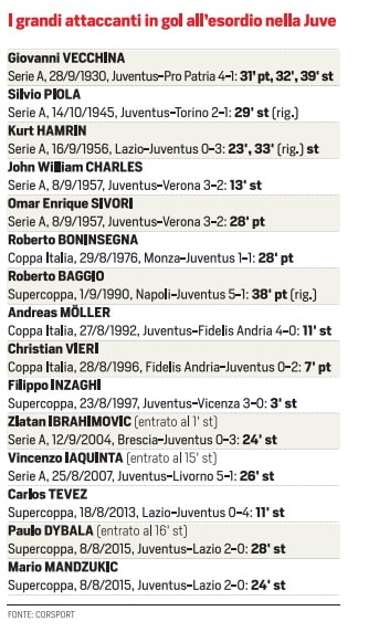 Ecco la lista dei grandi attaccanti in gol all'esordio con la Juventus (fonte Corriere dello Sport) |
