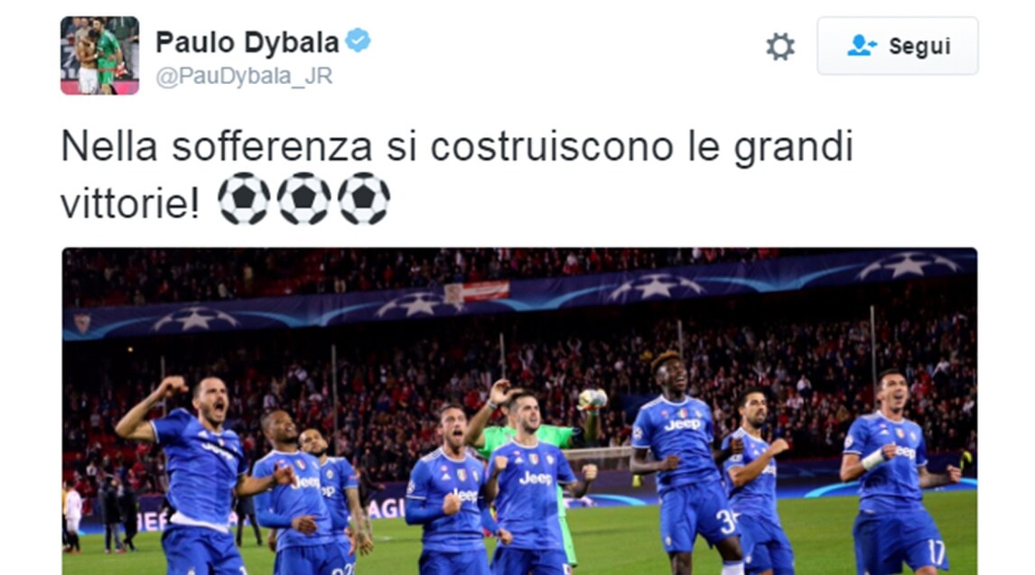 JUVENTUS, DA BONUCCI A DYBALA: LA FESTA È SOCIAL I tweet e le foto dei protagonisti della vittoria contro il Siviglia. Gioisce anche la Joya, assente per infortunio. E il difensore: «Sciacquatevi la bocca!». Guarda tutti i tweet dei calciatori della Juve ![]() |