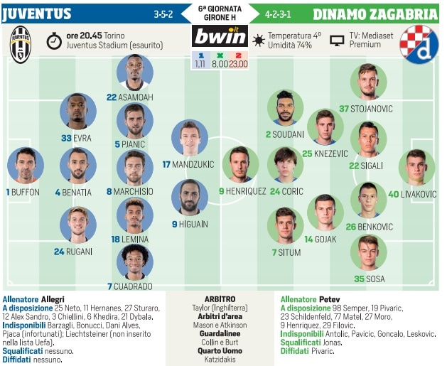 | 19.00 | ALLEGRI AVREBBE SCELTO IL 3-4-1-2: PJANIC DIETRO LE PUNTE La Juventus, sta per lasciare l'hotel di Leinì per dirigersi allo Stadium dove affronterà la Dinamo Zagabria nella 6ª gara del girone H della Champions League. Massimiliano Allegri, da quanto trapela, avrebbe scelto il 3-4-1-2: in porta il capitano Gigi Buffon. In difesa confermato Rugani con Benatia ed Evra. A centrocampo sulle fasce agiranno Cuadrado e Asamoah, con Lemina e Marchisio interni. Pjanic, invece, verrà riproposto nel ruolo di trequartista dietro alle due punte Mandzukic e Higuain.