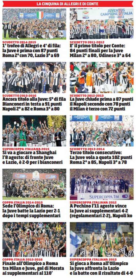 ALLEGRI VUOLE SALIRE SUL PODIO Max in due anni e spiccioli ha vinto cinque trofei, esattamente come Antonio nel triennio che ha rilanciato la Juve tramortita da Calciopoli. Gli “allegriani”, a dire il vero, aggiungono al conto la finale di Champions a Berlino, ma le emozioni non fanno statistica e, come diceva il predecessore, solo chi vince scrive la storia, gli altri la leggono. Dunque, trofei alla mano, il palmares di Conte comprende tre scudetti e due Supercoppe, quello di Allegri invece due scudetti, due Coppe Italia e una Supercoppa. Cinque pari, ma... con un vincitore: il presidente Andrea Agnelli, che somma i dieci titoli nei sei anni di gestione, a testimonianza che campioni e tecnici passano, resta la Juve con le sue tradizioni. (di Antonio Barllà) Leggi l'articolo completo sull'edizione del Corriere dello Sport oggi in edicola |