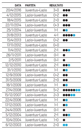 La Lazio contro il tabù Juve: la Lazio attuale è riuscita a battere i bianconeri soltanto in Coppa Italia nel 2009 sotto la guida di Delio Rossi e nel gennaio 2013 quando in panchina guidava Vlado Petkovic: finì 2-1 all’Olimpico con il gol decisivo di Floccari a un sospiro dal novantesimo. La Lazio volò in finale dove si sarebbe poi regalata il successo irripetibile sulla Roma datato 26 maggio. |