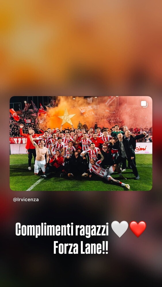 "Complimenti ragazzi, forza Lane!!" e due cuori, uno bianco e uno rosso, i colori social del club veneto: è la festa social di Roberto Baggio per il ritorno del Lanerossi in cadetteria. Il 'Divin Codino', Pallone d'Oro 1993, proprio nel Vicenza ha mosso i primi passi da calciatore ed esordito fra i professionisti collezionando 36 presenze con 13 reti tra il 1982 e il 1985 prima di trasferirsi alla Fiorentina. Lo stesso Baggio, dal proprio account Instagram, ha infatti postato nelle stories la foto dei festeggiamenti con i giocatori in primo piano e, alle loro spalle, la curva sud del 'Menti' in tripudio.