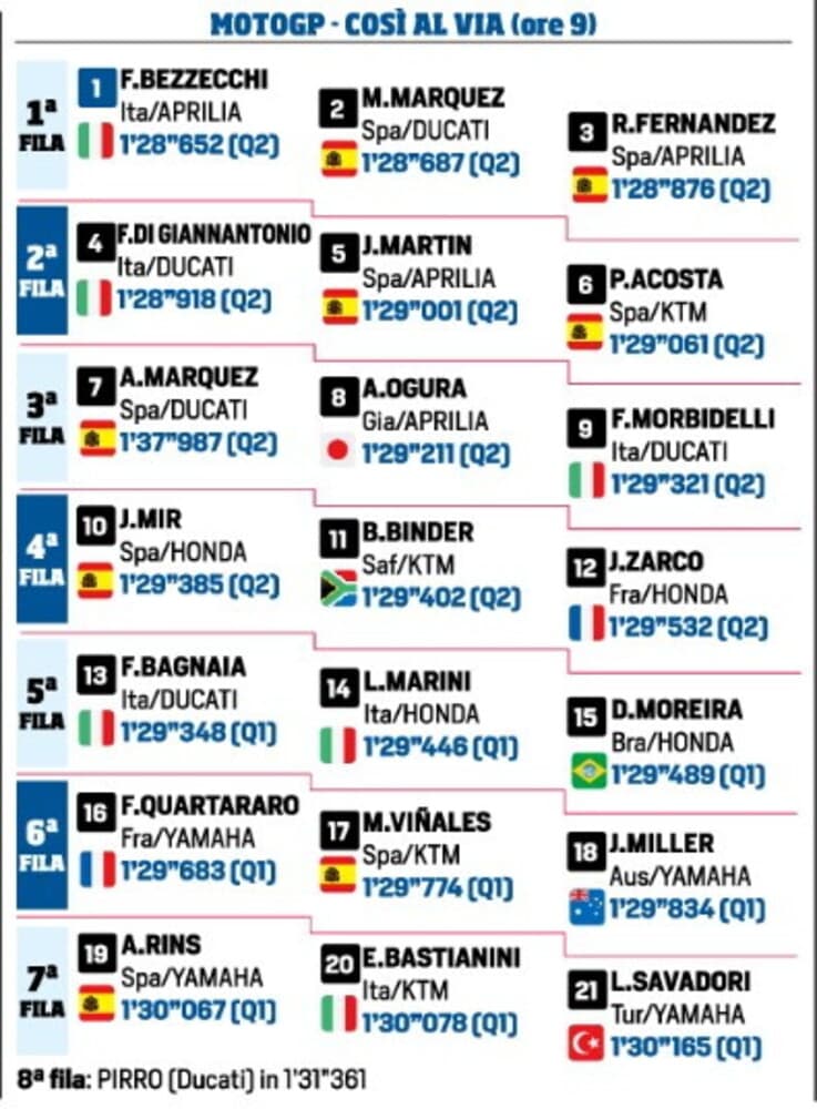 Mancano pochi minuti al via del Gp della Thailandia (inizio ore 9 italiane) sulla pista di Buriram, dove sarà Marco Bezzecchi a scattare in pole davanti alla Ducati del campione del mondo Marc Marquez.