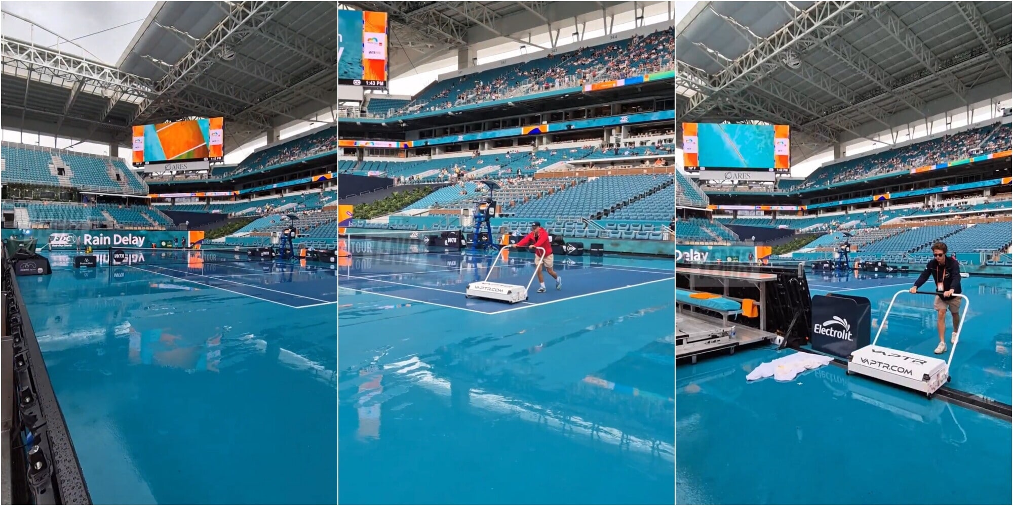 Si prova ad asciugare il campo con i ventilatori ma in questo momento ha ricominciato a piovere in modo piuttosto consistente a Miami e quindi non è escluso che il match possa subire un ulteriore slittamento. I giocatori sono negli spogliatoi in attesa di avere aggiornamenti sull'orario